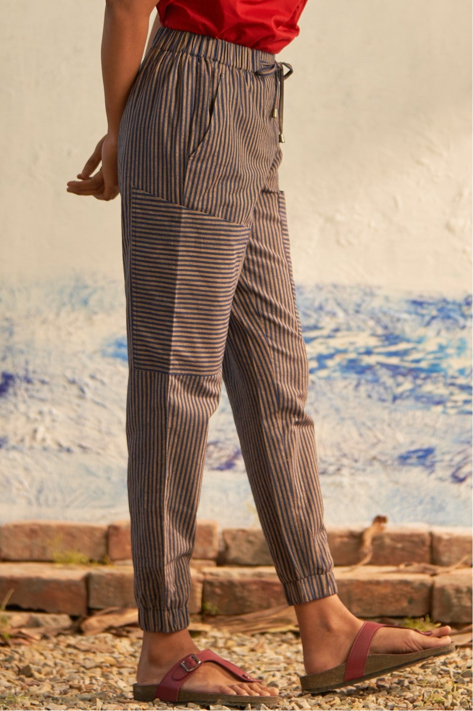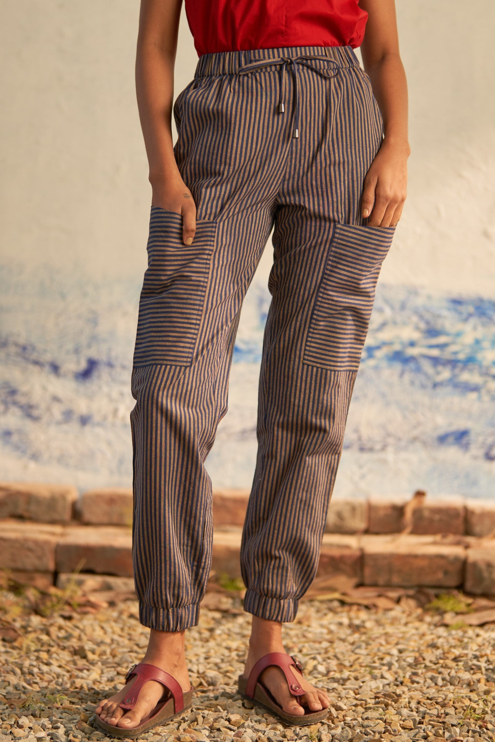 The perfect companion for today's dynamic woman. Crafted from striped cotton fabric, these joggers feature tapered legs and are equipped with an elasticated waistband with drawstring that has metal accents and cuffs, ensuring both style and comfort.