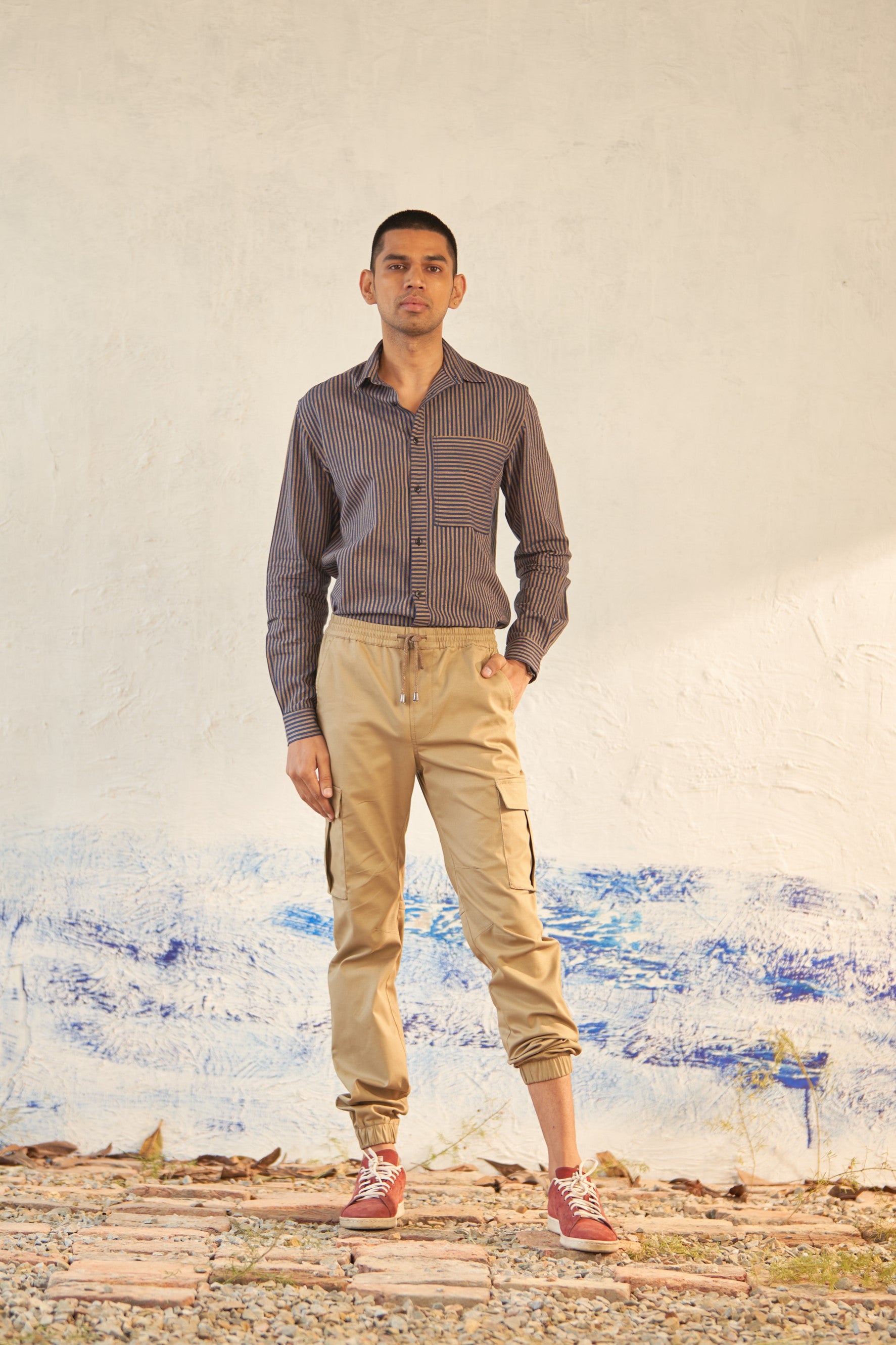 Designed for the confident gentleman leisurely cruising through Sunday afternoons or evening soirees with ease. This shirt boasts distinctive sharpness, highlighted by a narrow collar and a stylish placket and pocket design, accentuated by the interplay of horizontal stripes. The straight sides and hem lend a sleek, box-shaped look, exuding sophistication and modernity.