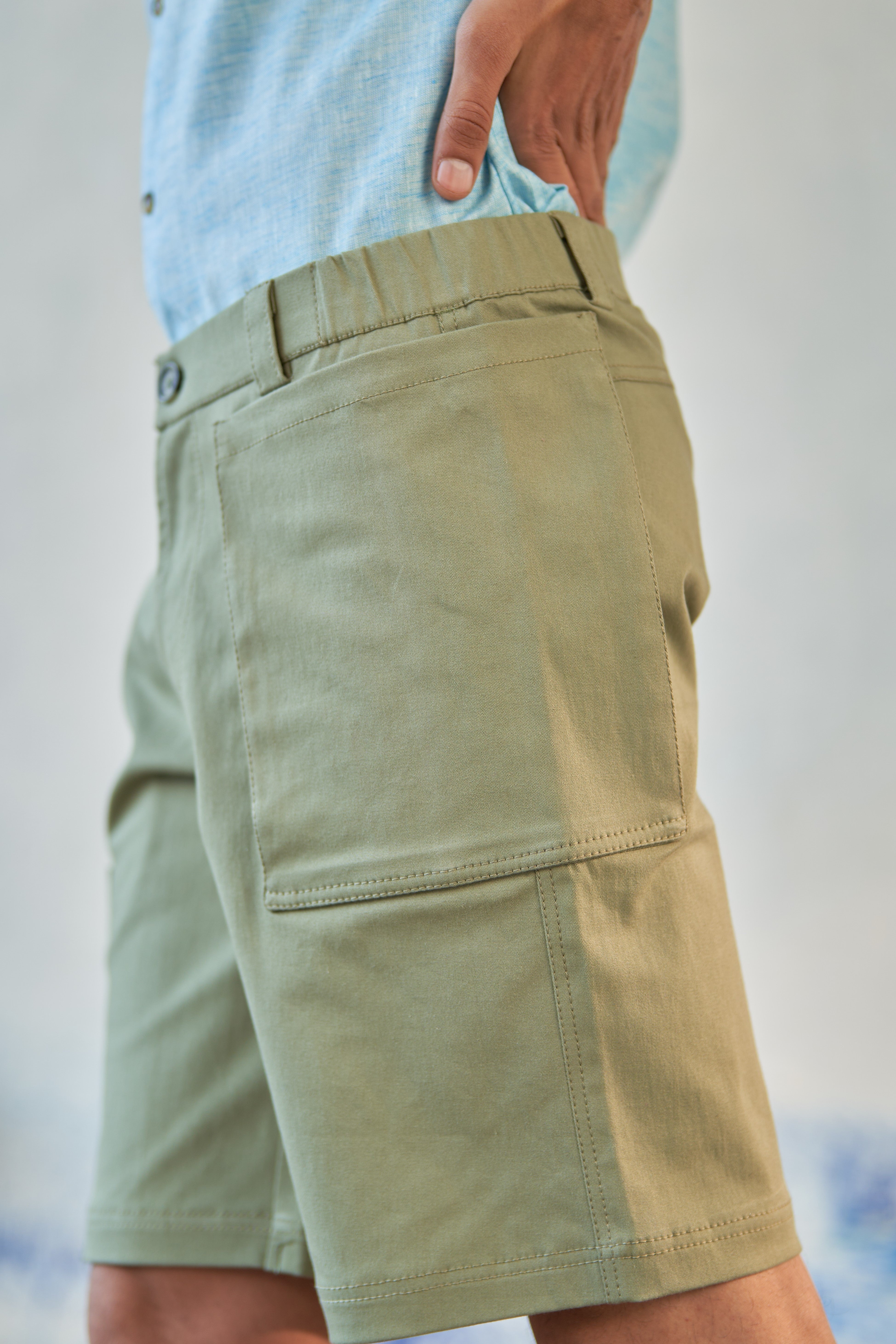Tidal Wave Shorts in a washed green hue, perfect for long journeys. With a half-elasticated waistband for added comfort, and left front patch pockets for extra space and a unique look, these shorts are designed for adventure. Complete with front zip and button fastening, blaze your trail in these must-have shorts.