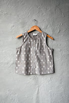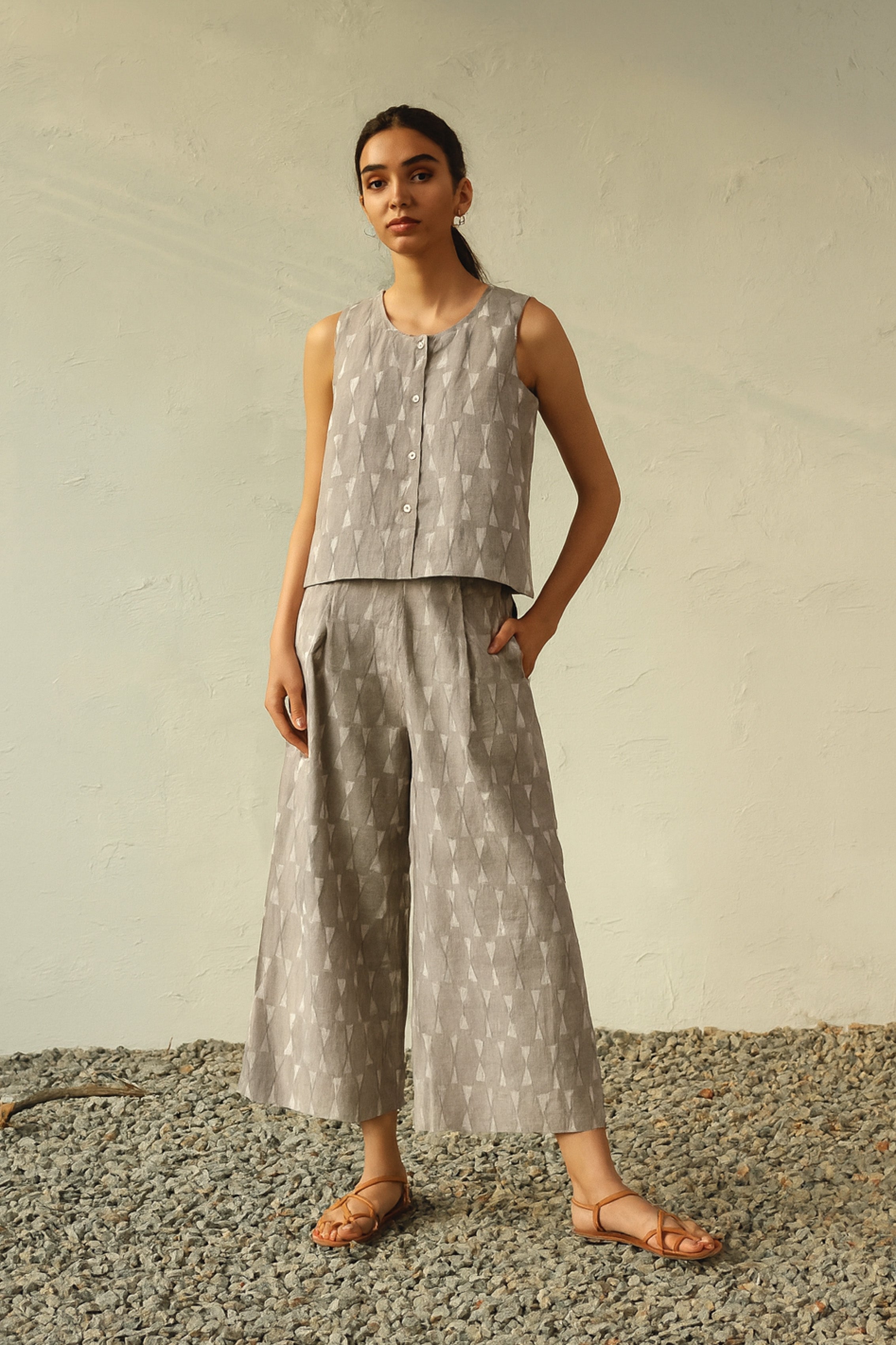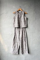 Shell button placket closure on a sleeveless top pairs perfectly with pleated palazzos that feature a fully elasticated waistband and drawstring - the ultimate combo for all-day comfort. Grey hue coord.