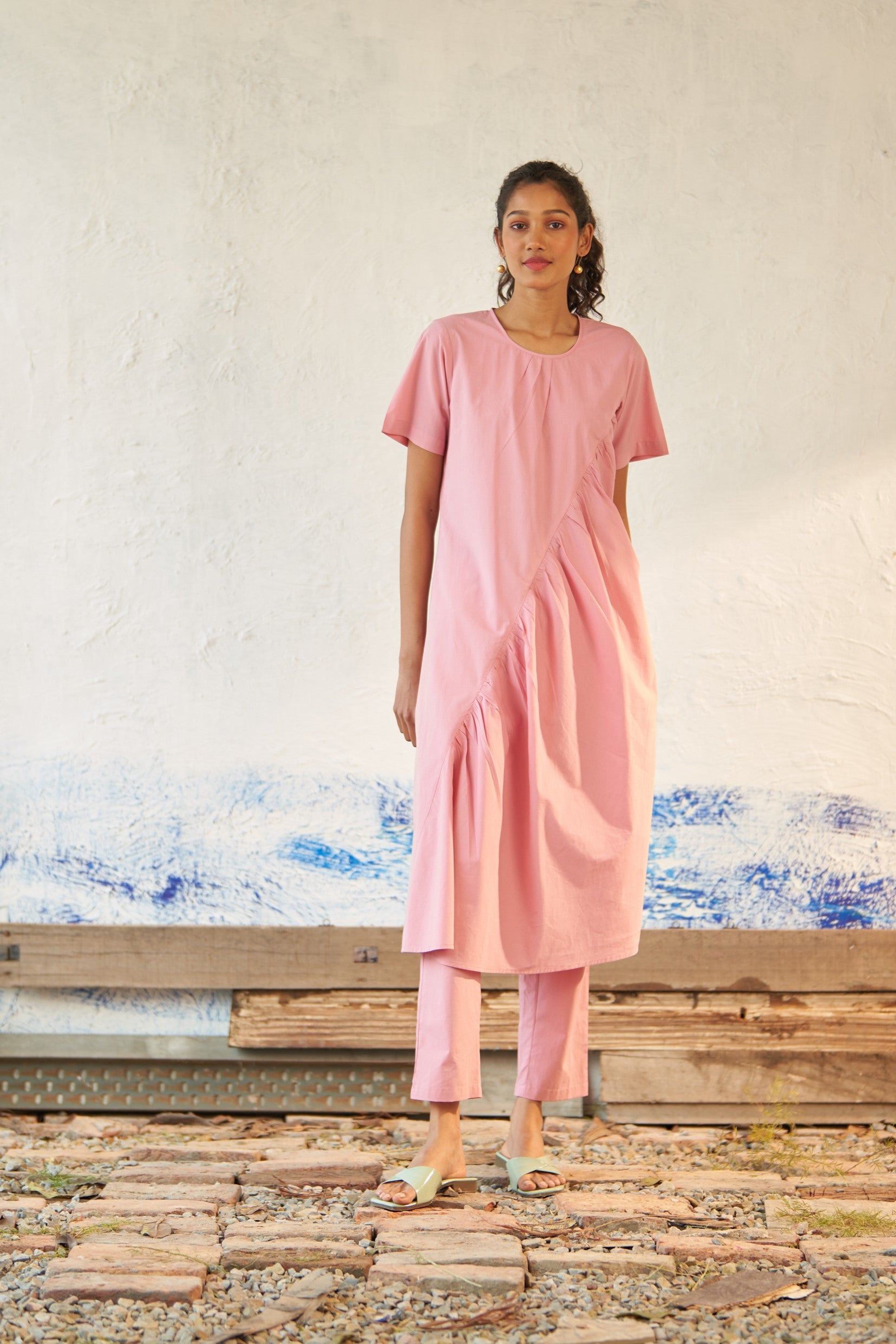The wink pink coord is a classic staple for the modern women's wardrobe. Cut to knee length, this piece is crafted from blush-hued cotton that cascades to an asymmetric gathered waistline, offering a subtle point of difference. It's otherwise kept minimal with a crew neck and short sleeves.