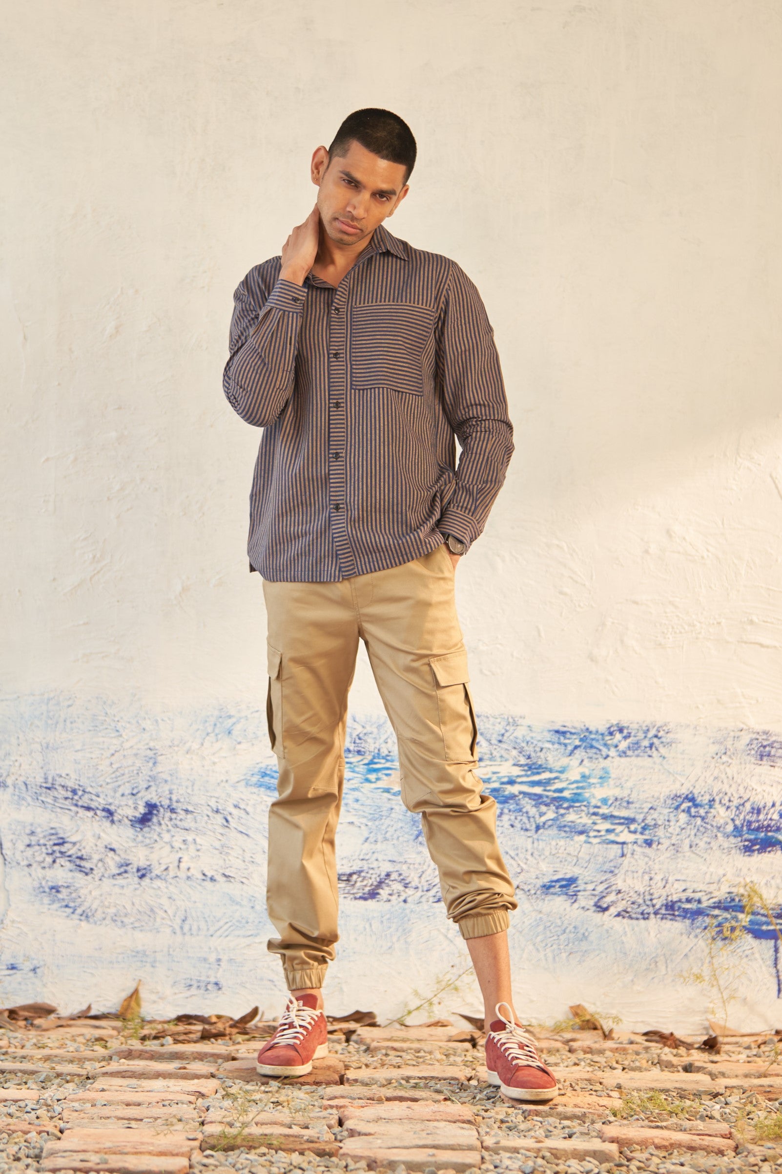 Trail Khaki Cargos, crafted from cotton lycra twill for stretchability and comfort. With an elasticated waist featuring a drawstring and metal accents, these cargos ensure a personalized fit. The design is elevated by patch pockets with flap and darts.