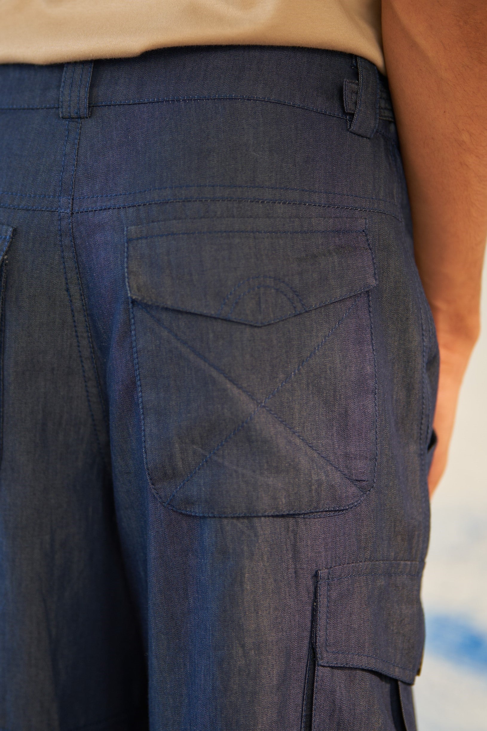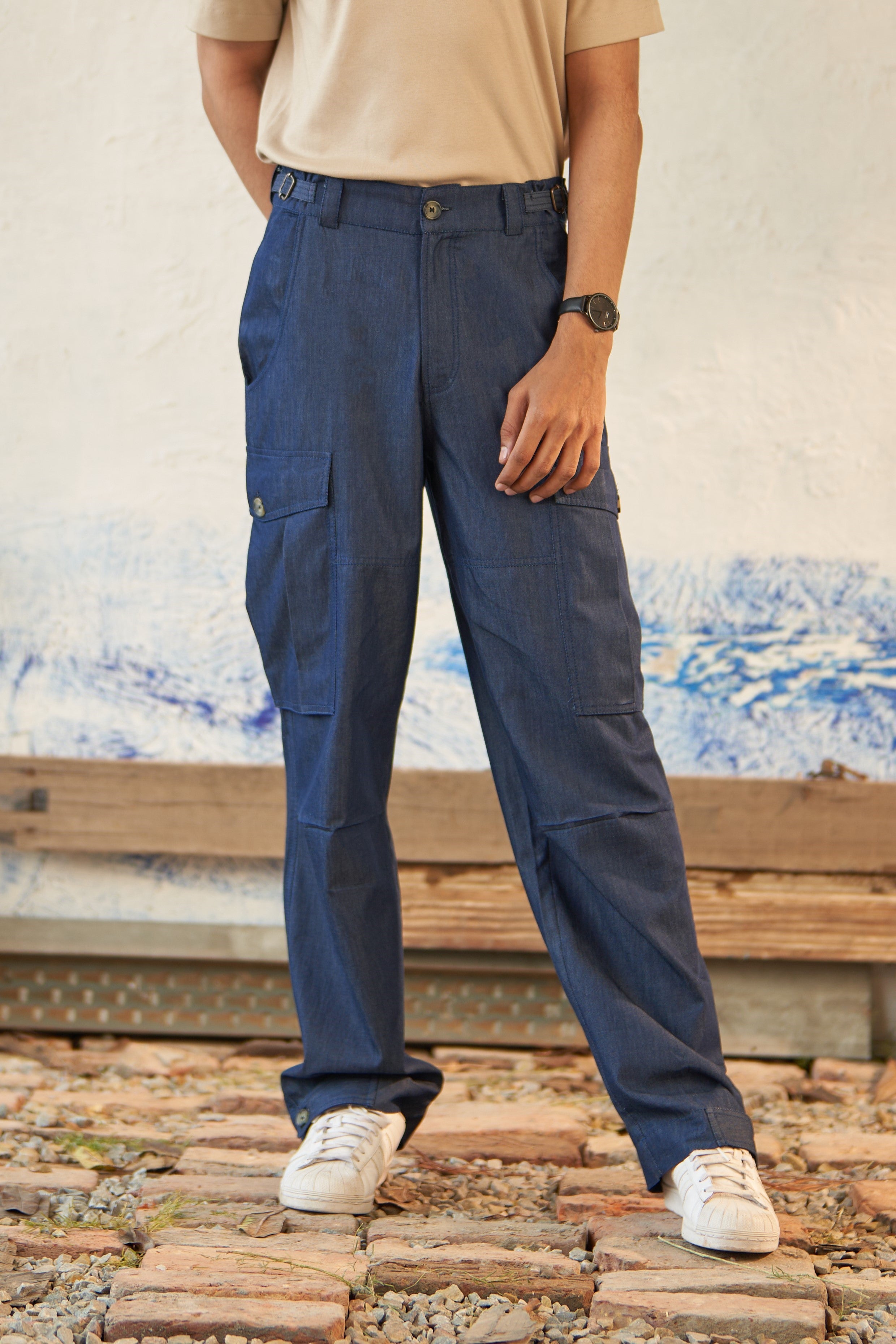 Uber-stylish denim pants, crafted from soft cotton denim. These versatile pants offer both a flared silhouette and a straighter look, with adjustable loops. Featuring flap pockets on the legs, patch pockets at the back, and pleat details on the knees, and an adjustable waistband they blend functionality with sophistication. The front zip and button fastening ensure a secure fit, while intricate threadwork adds an extra touch of style.