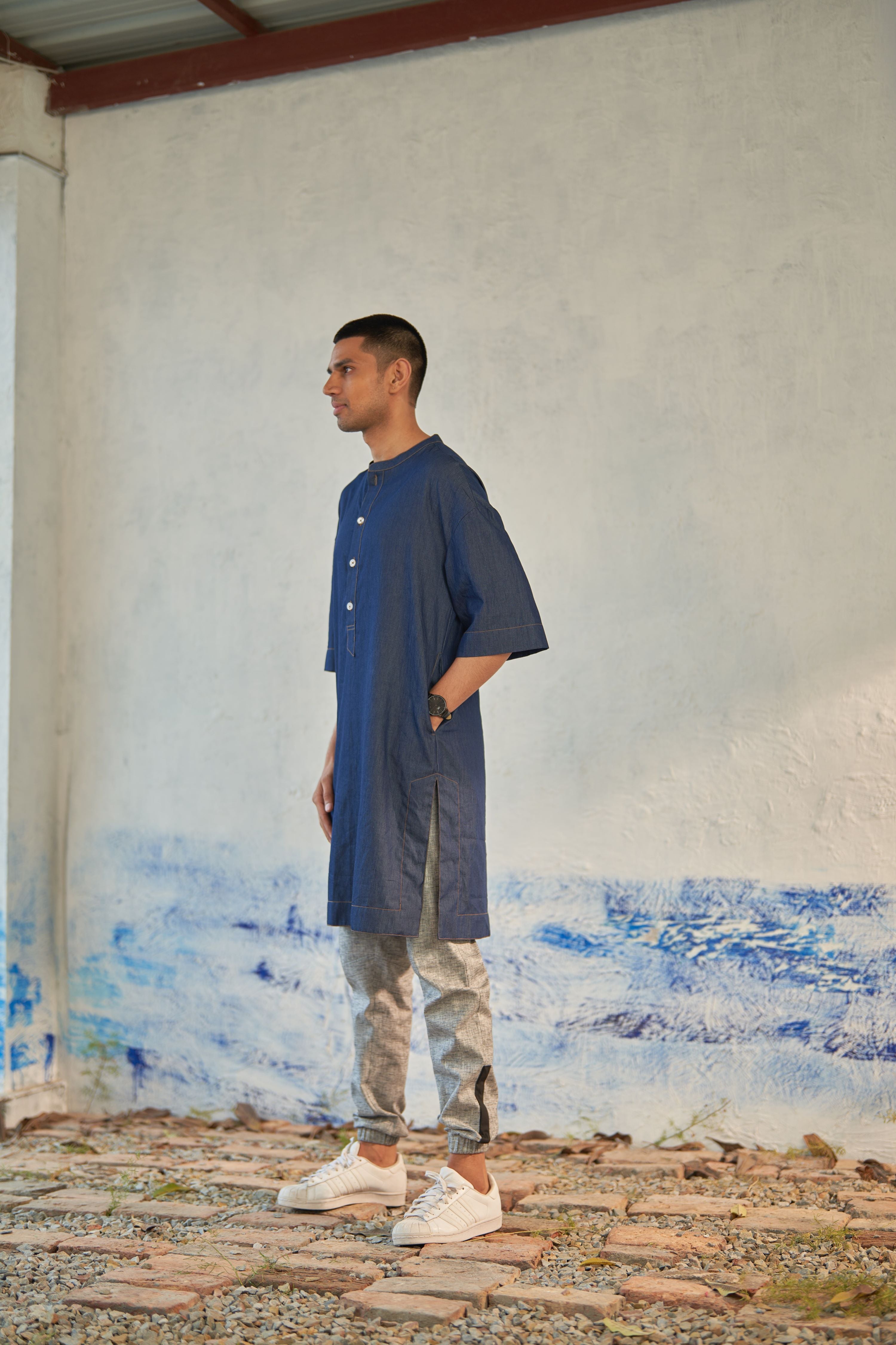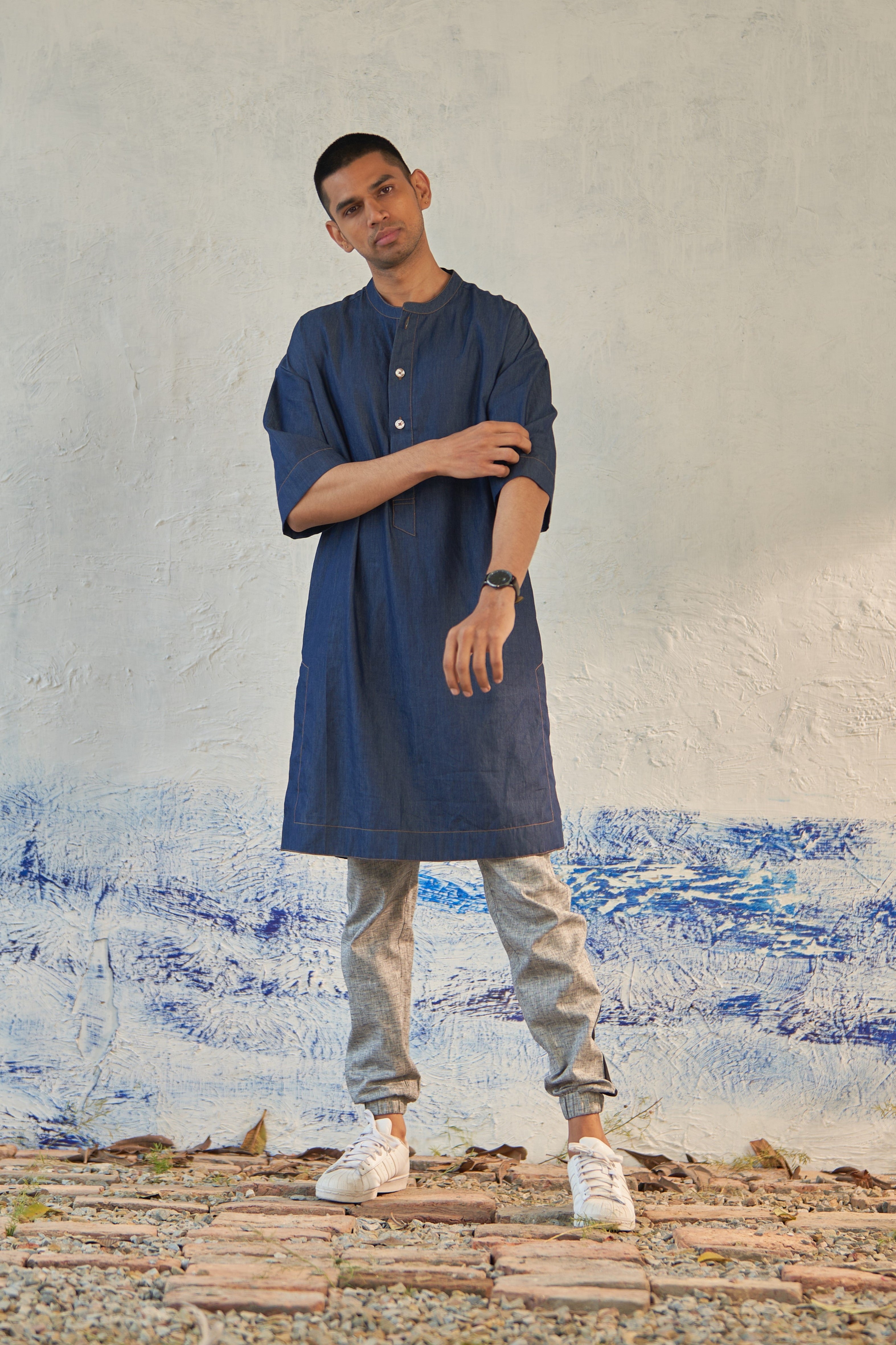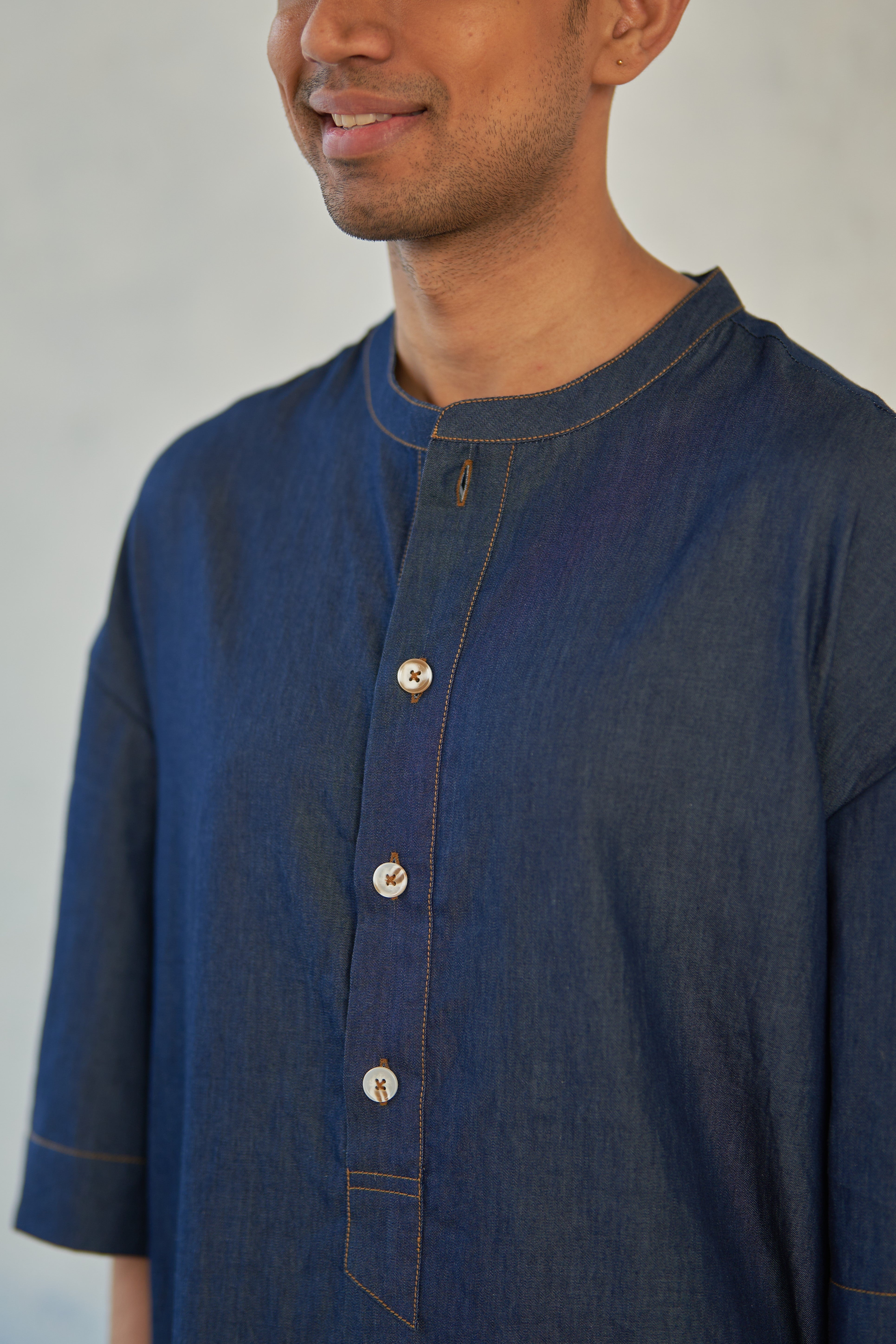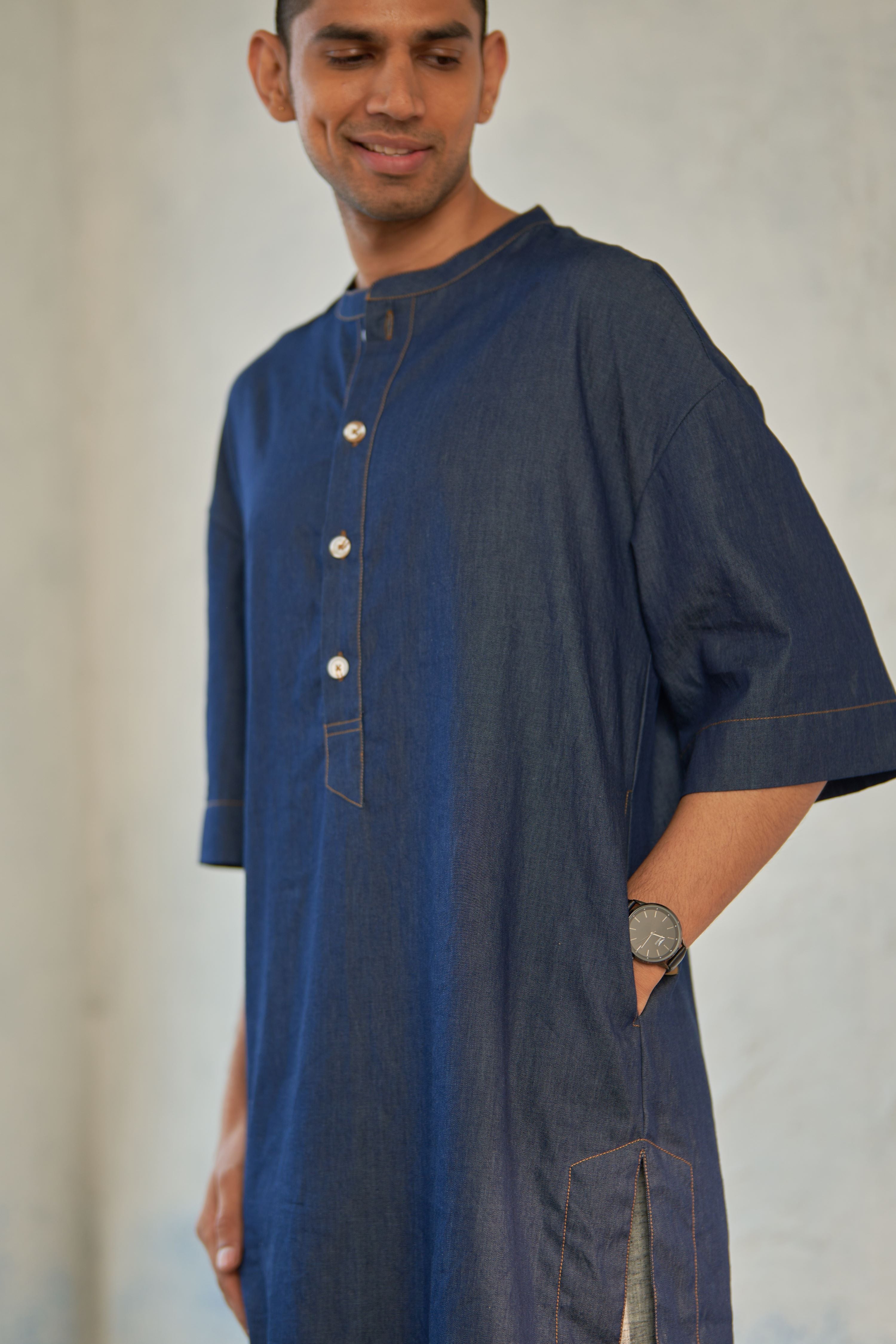 A departure from the standard kurta, reimagined in denim. Designed to infuse your wardrobe with a sense of ease and spontaneity, perfect for wear anytime, anywhere. This denim kurta boasts a broad, elongated front placket with a diagonal finish, featuring larger buttons for added flair. Intricate threadwork detailing across various areas adds subtle yet distinctive charm. Elevate your casual look with this modern twist on a traditional classic.
