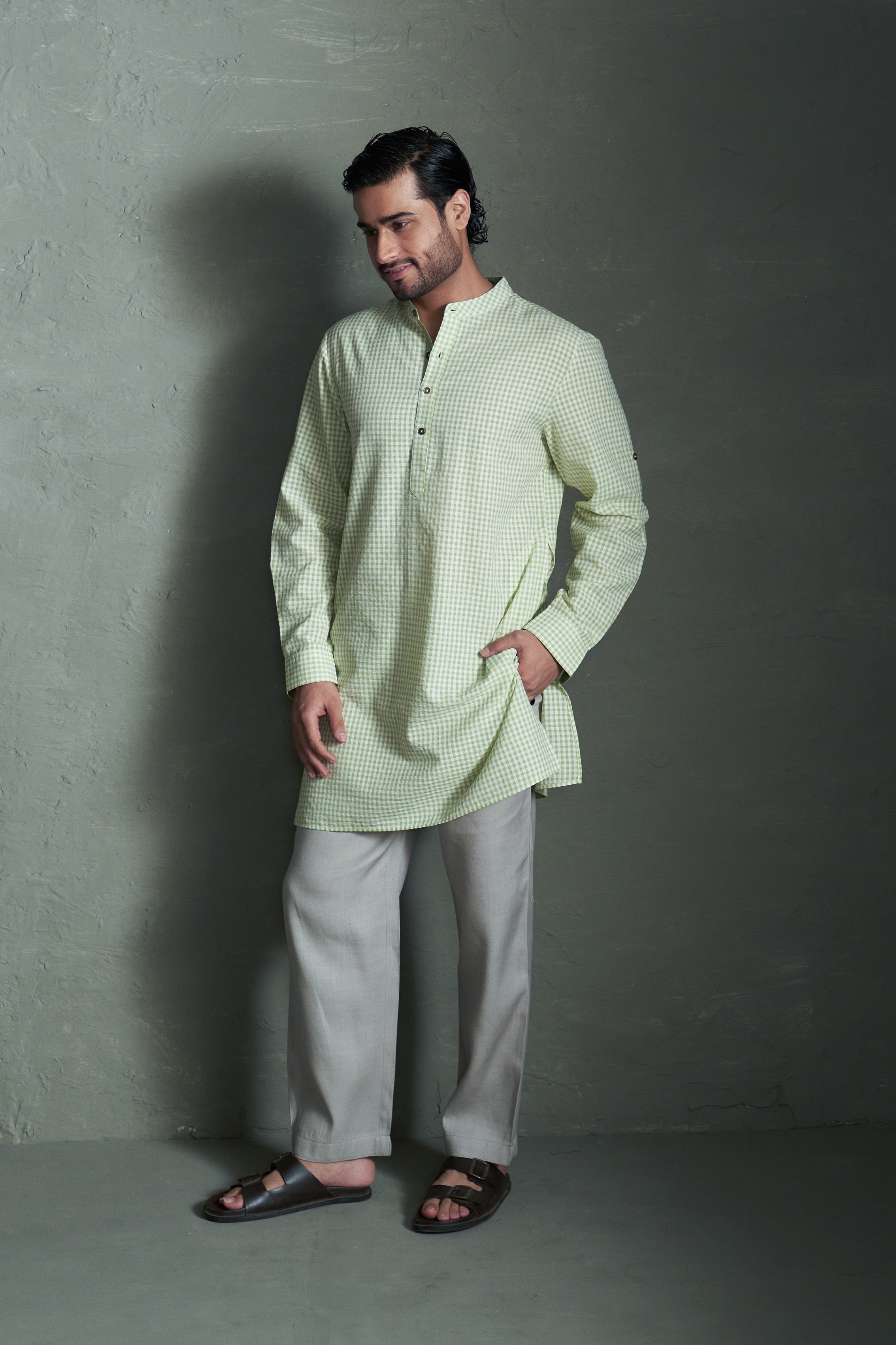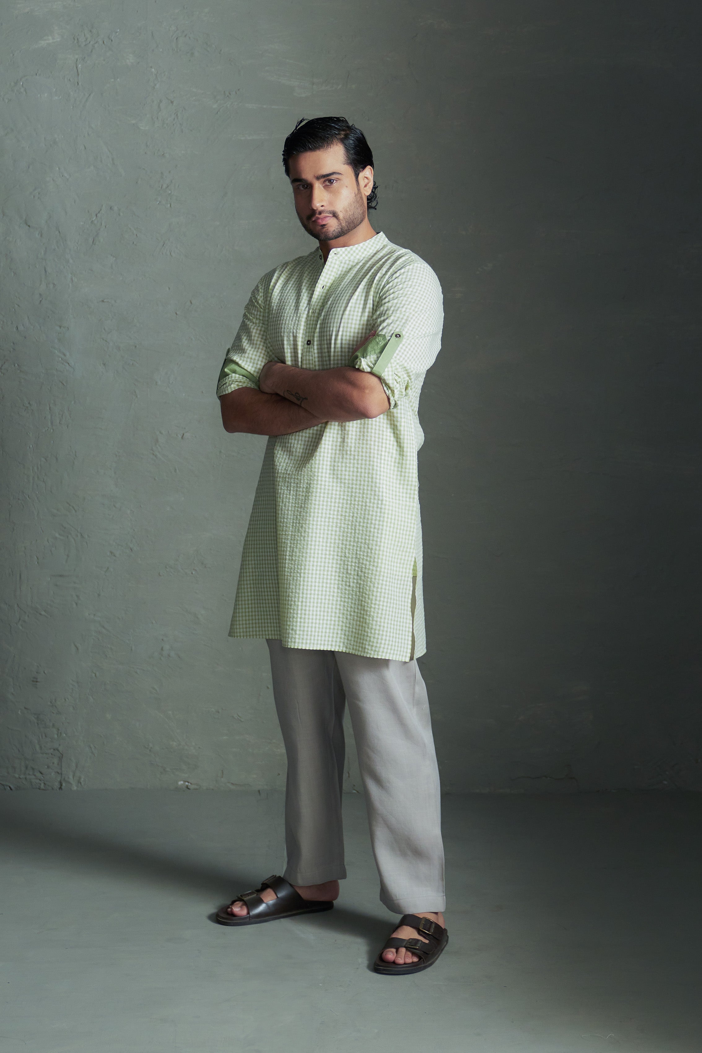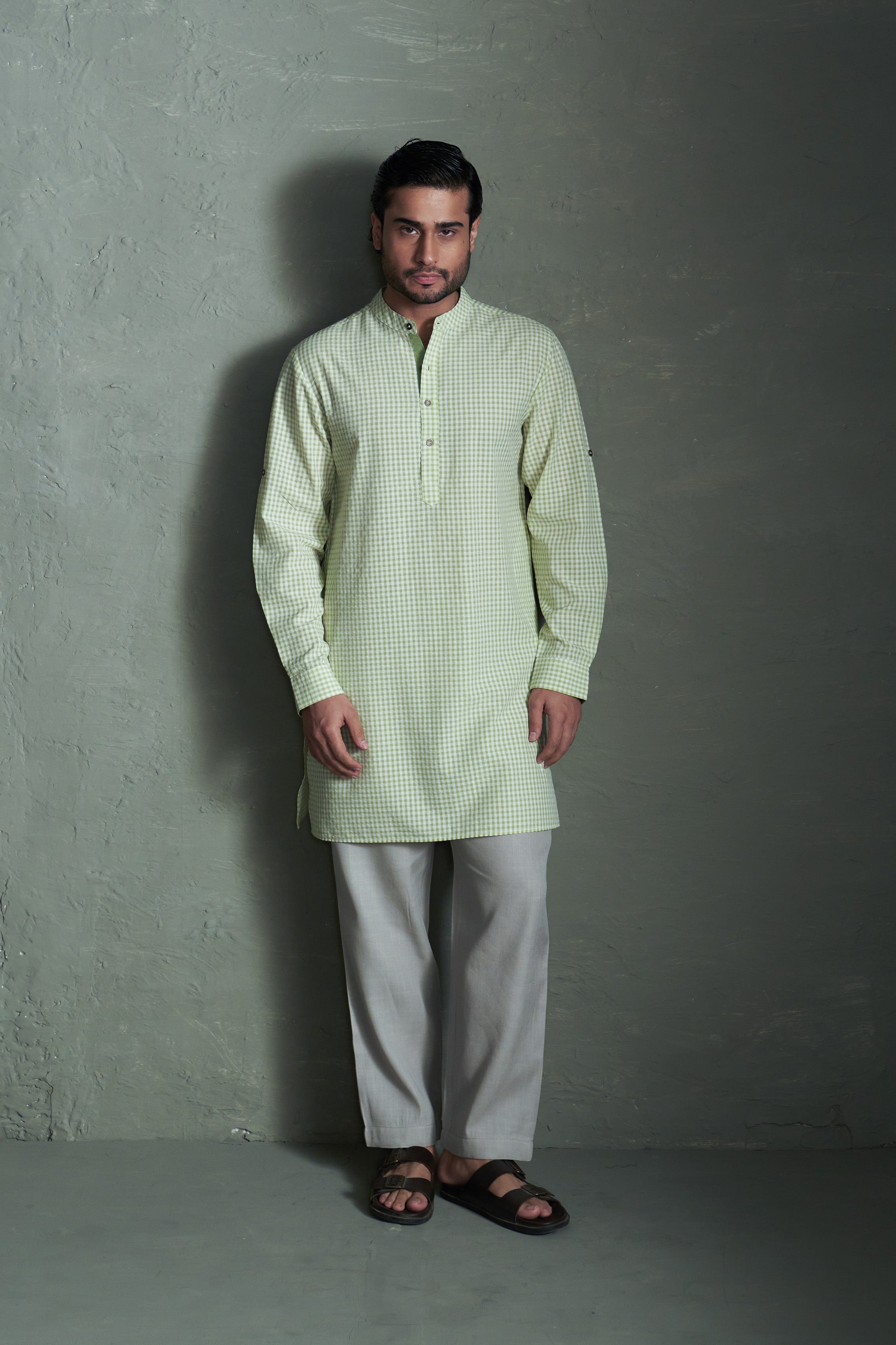 Where movement meets stillness—this long green kurta in subtle check pattern is crafted for comfort and quiet style. The earthy tone and minimal silhouette make it a versatile choice for days that take you places, or don’t. Pair with neutrals or whites for a look that feels grounded, yet fresh.