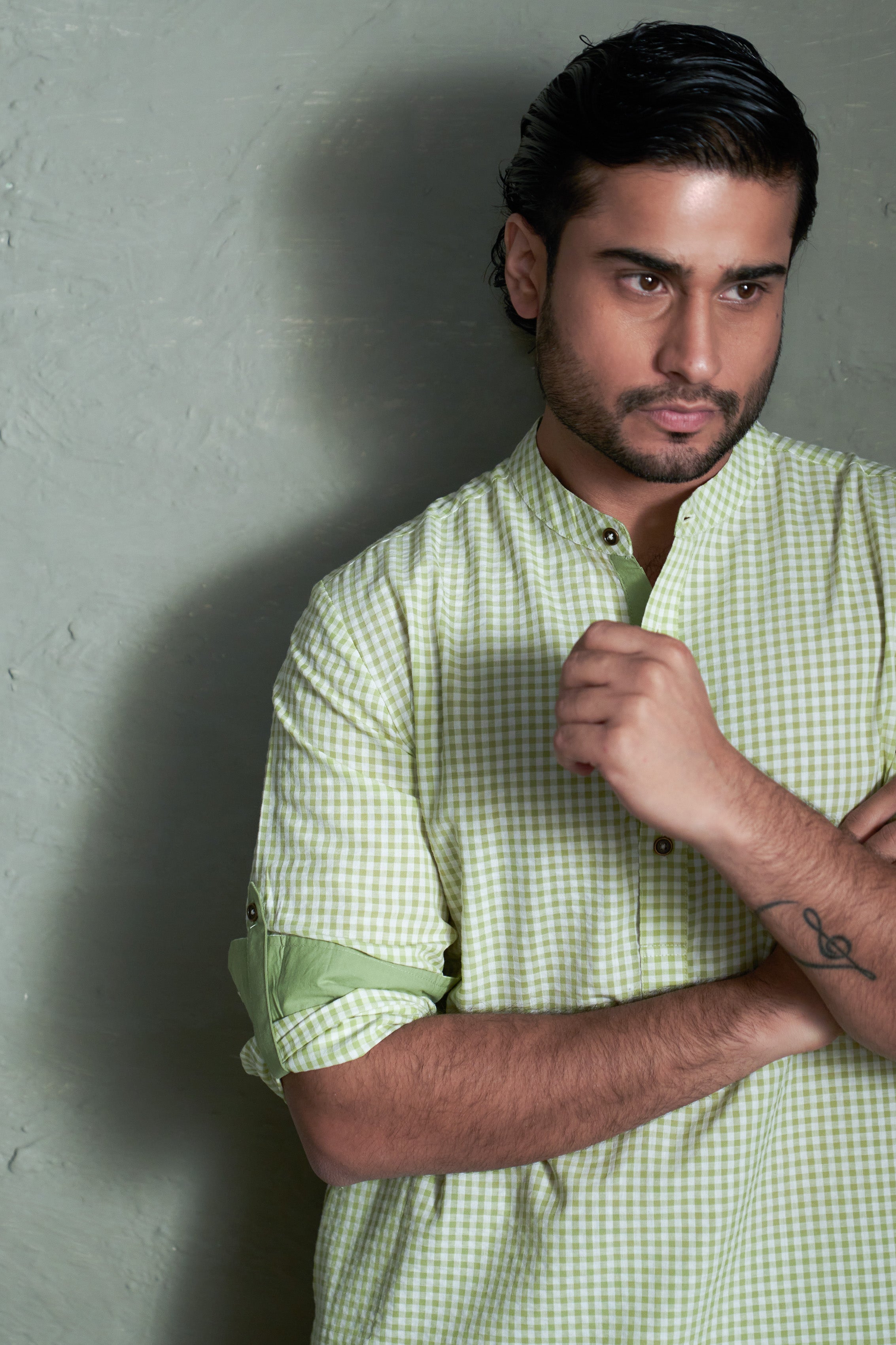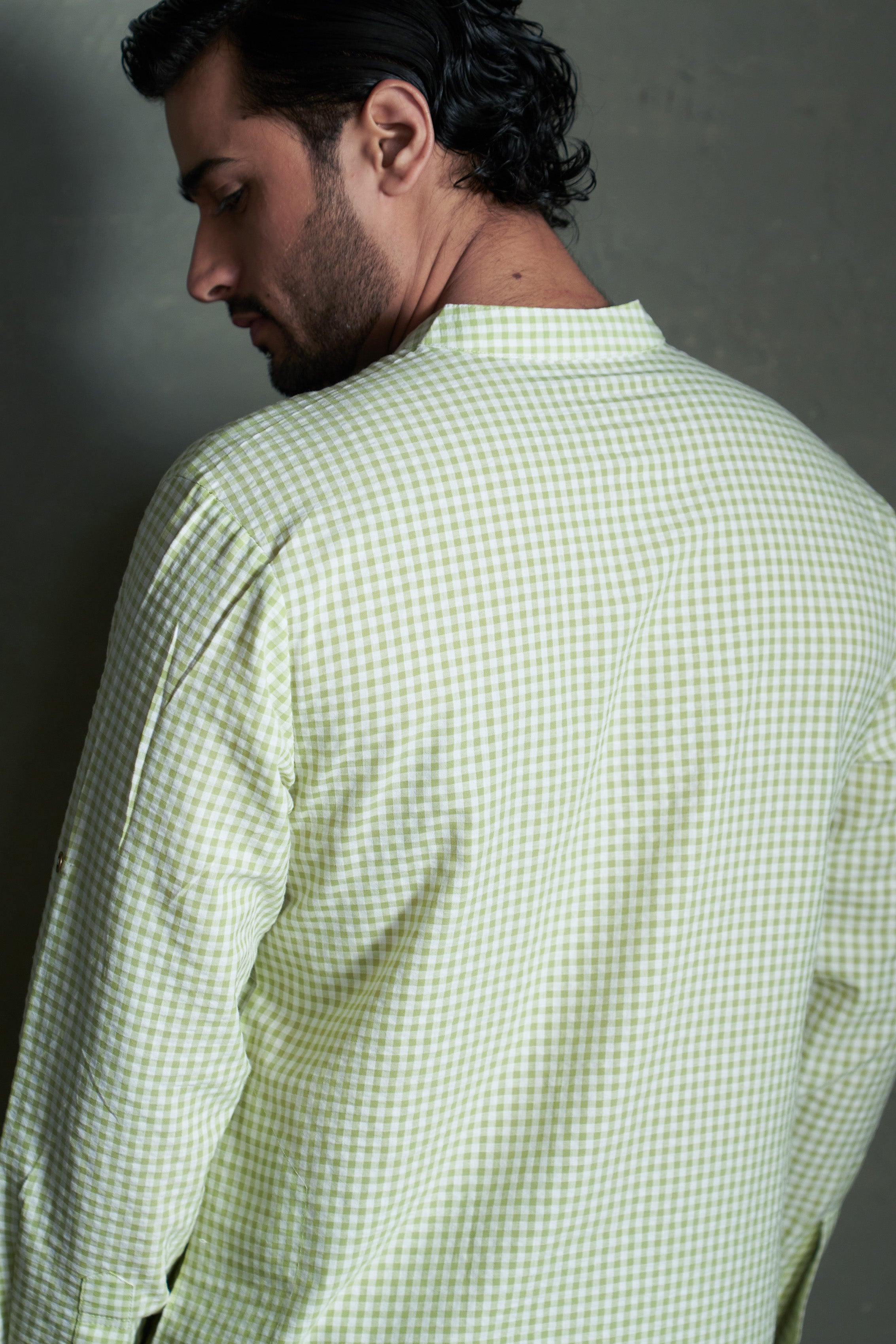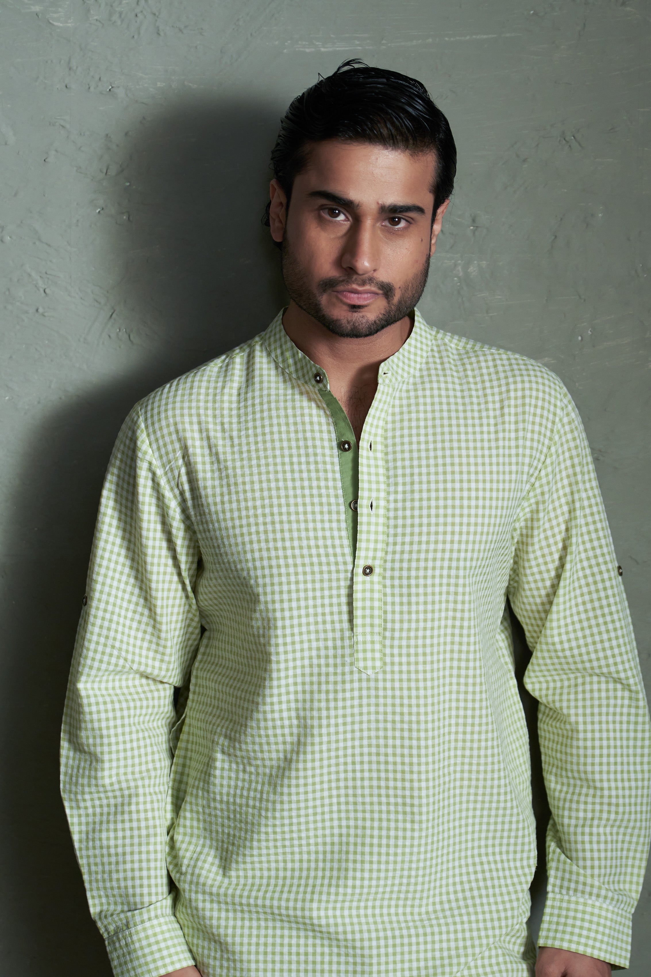 Where movement meets stillness—this long green kurta in subtle check pattern is crafted for comfort and quiet style. The earthy tone and minimal silhouette make it a versatile choice for days that take you places, or don’t. Pair with neutrals or whites for a look that feels grounded, yet fresh.