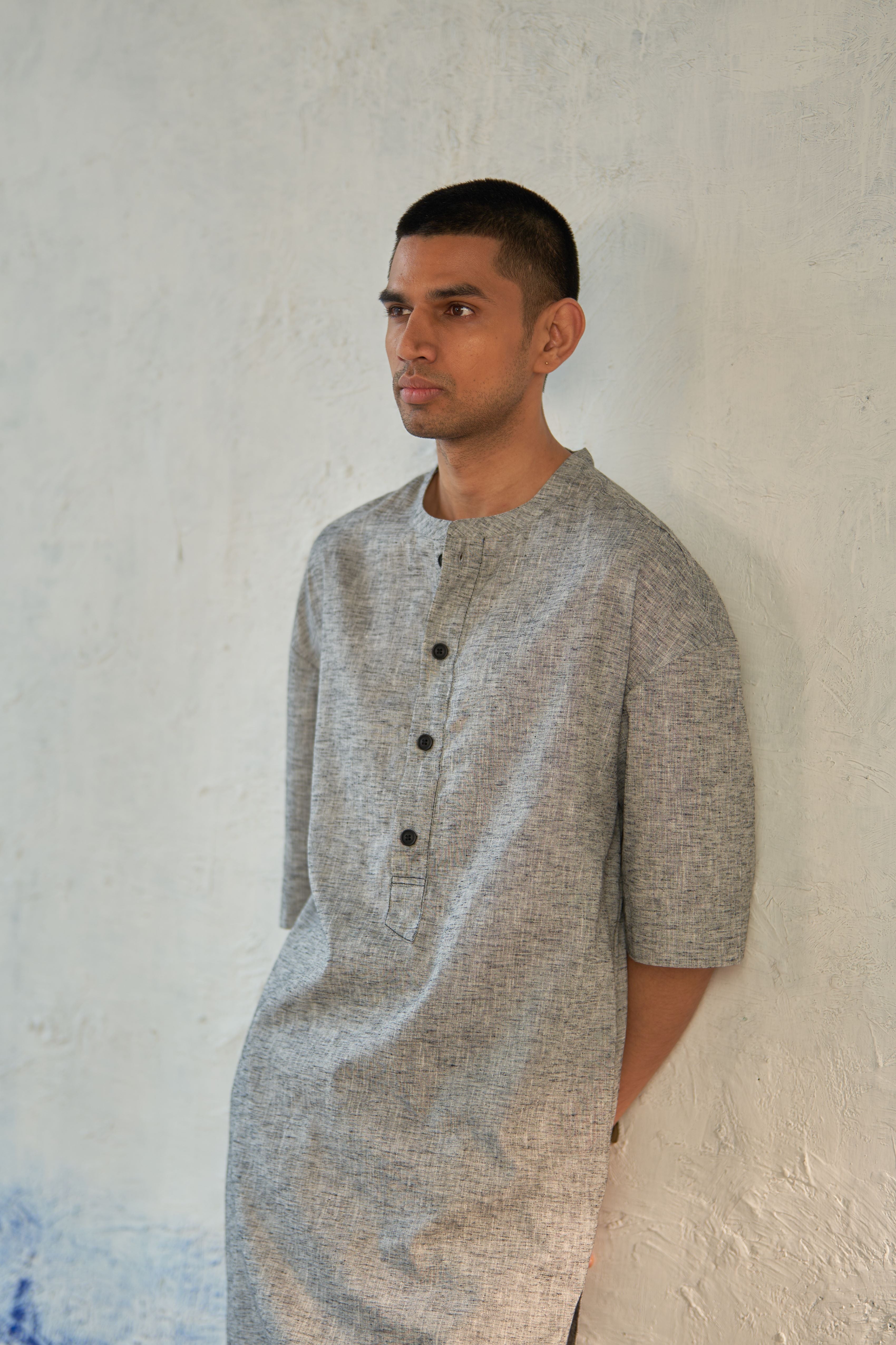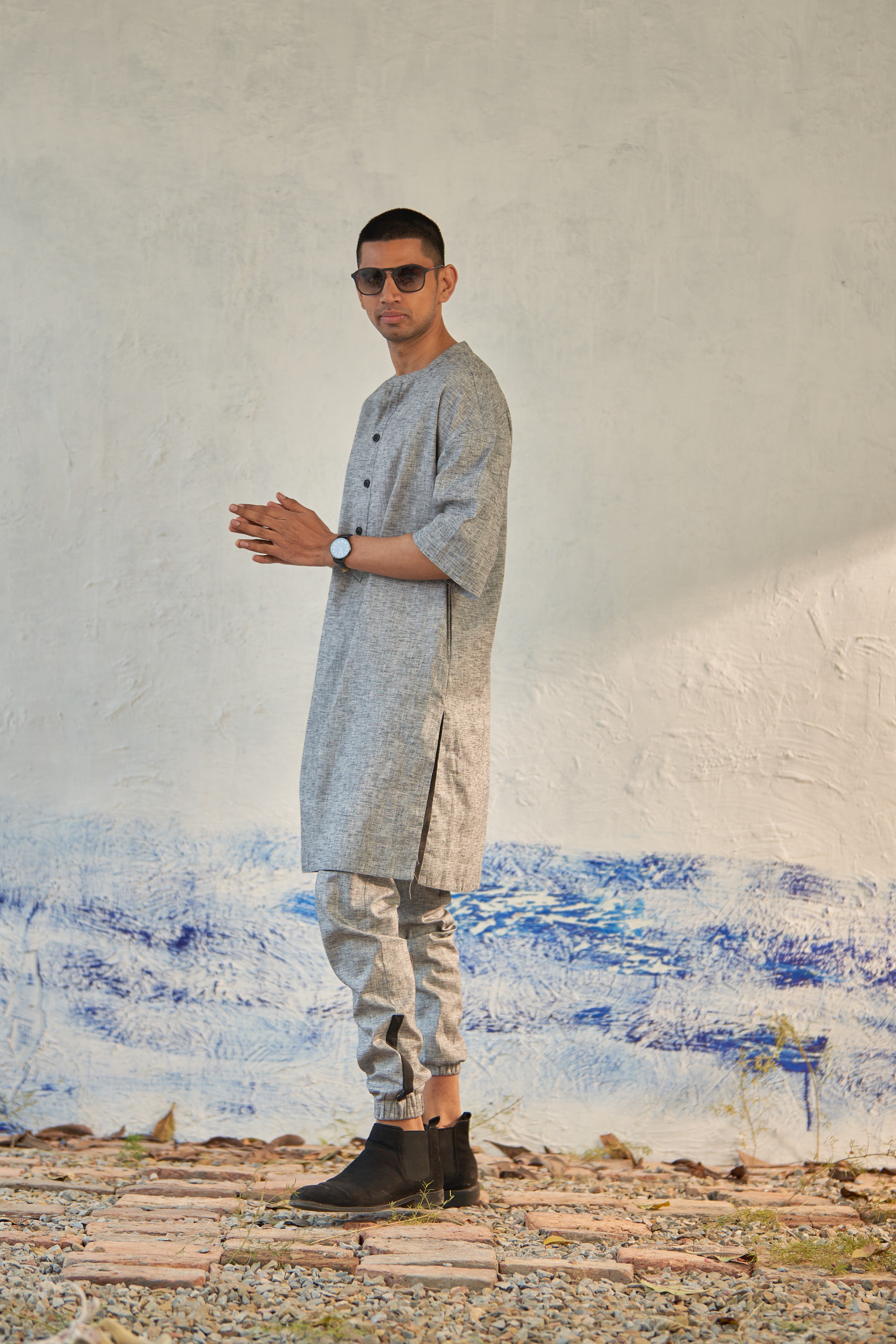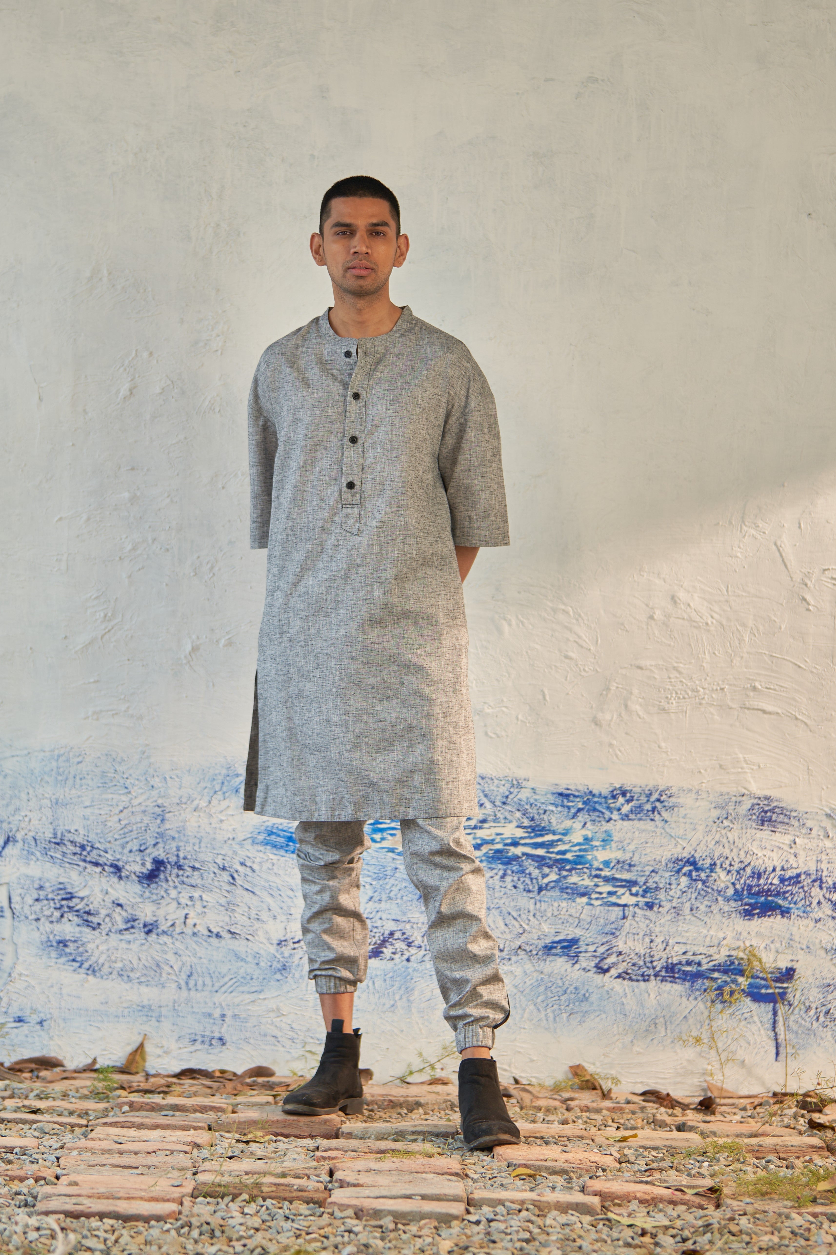 Crafted from traditional textured cotton, this kurta is reimagined with a sense of ease and spontaneity, offering both comfort and style. Boasting a broad, elongated front placket with a diagonal finish, adorned with bold black buttons for a contemporary touch. Black thread detailing on the placket adds a modern outlook.