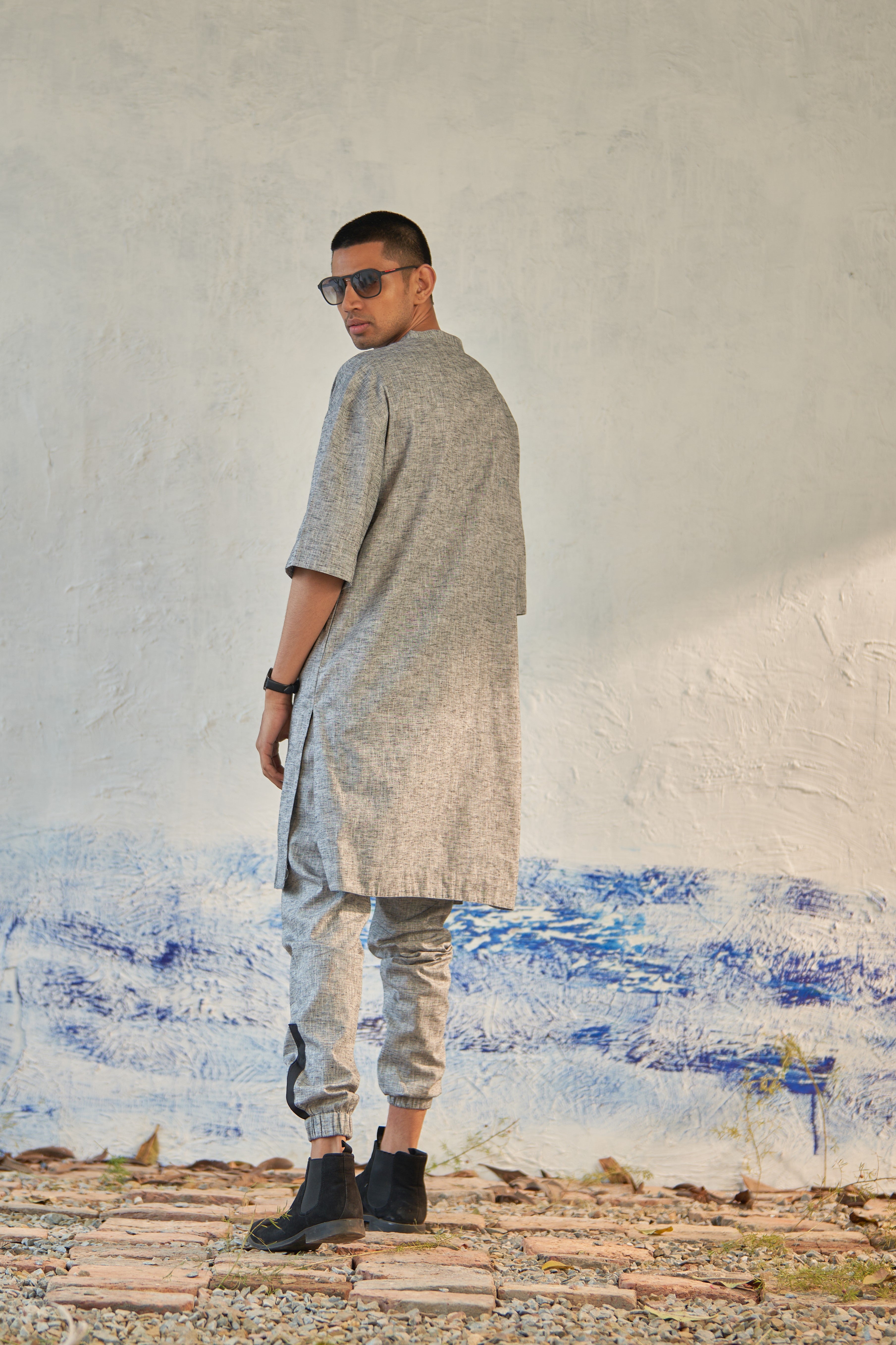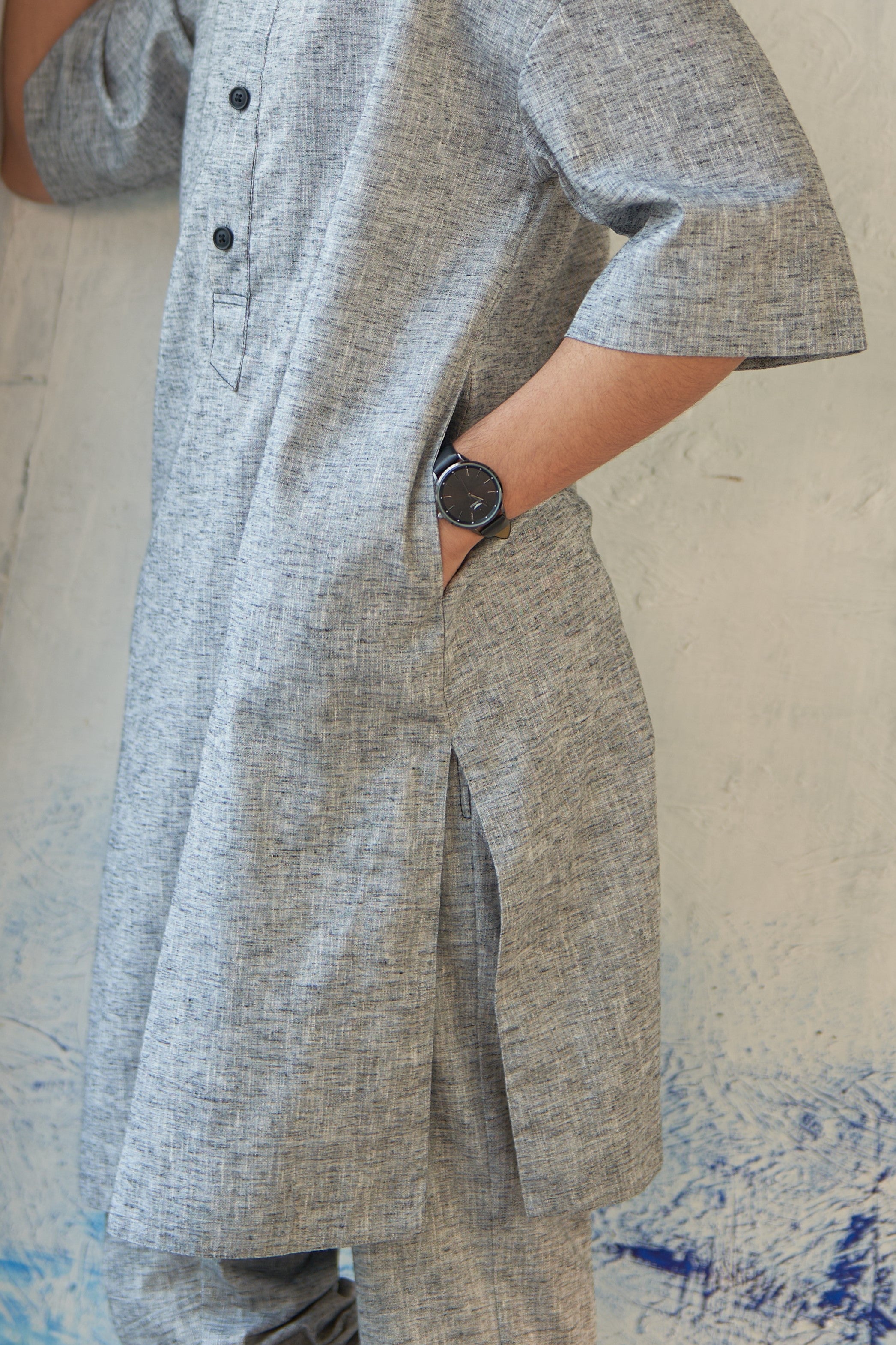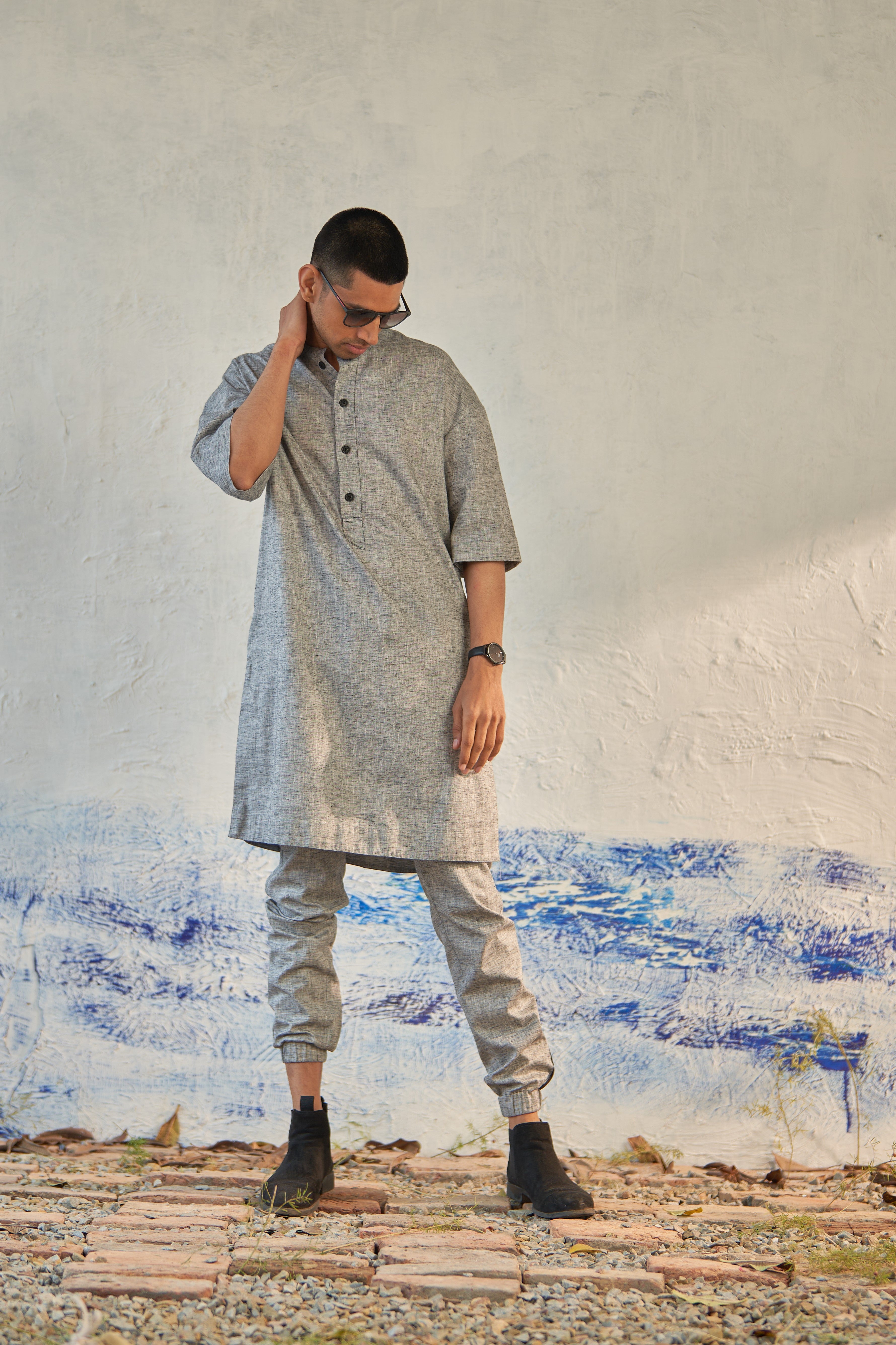 Crafted from traditional textured cotton, this kurta is reimagined with a sense of ease and spontaneity, offering both comfort and style. Boasting a broad, elongated front placket with a diagonal finish, adorned with bold black buttons for a contemporary touch. Black thread detailing on the placket adds a modern outlook.