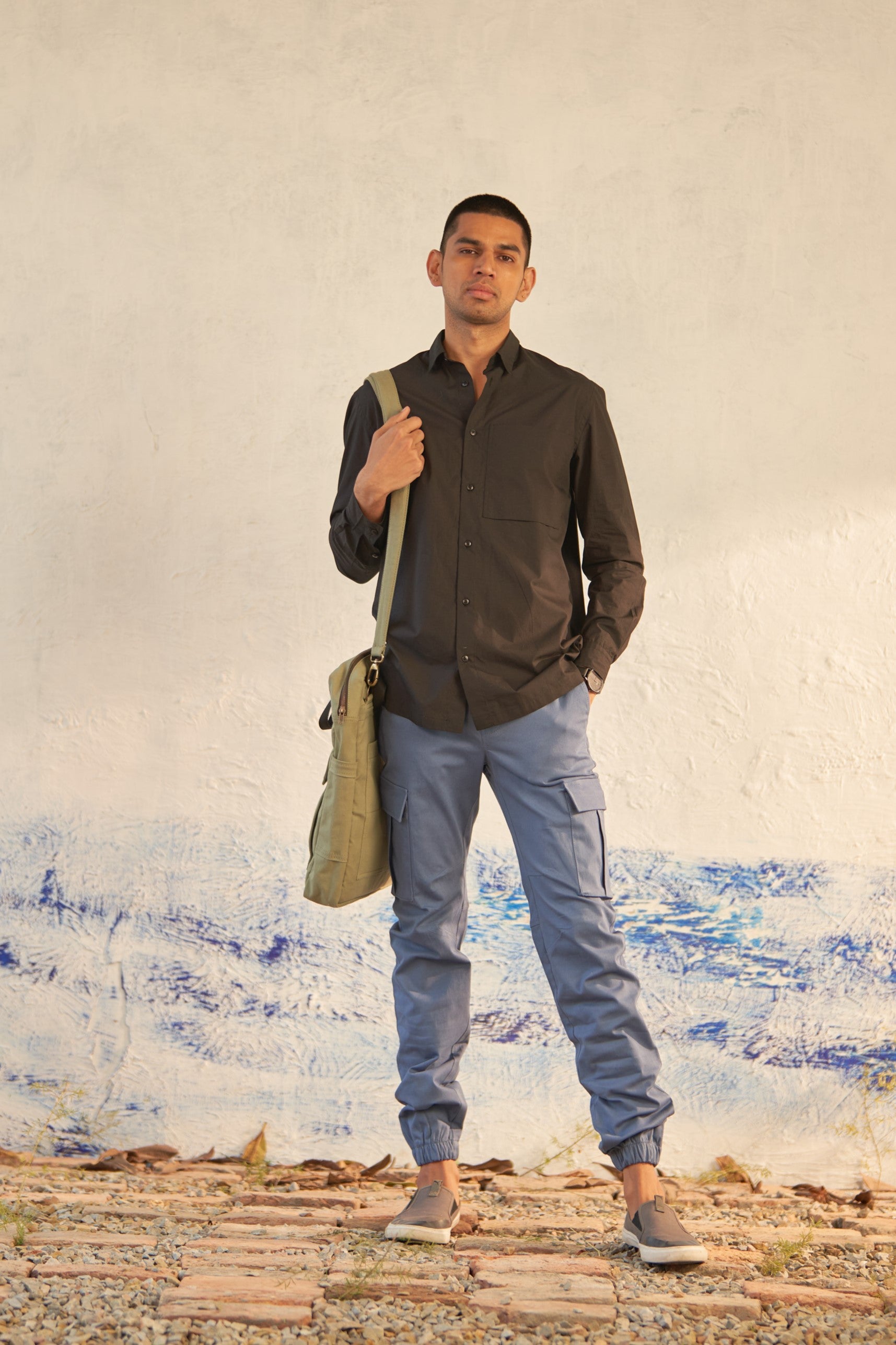 Paired with our washed blue cargo joggers, crafted for both comfort and style with patch pockets and a relaxed fit.