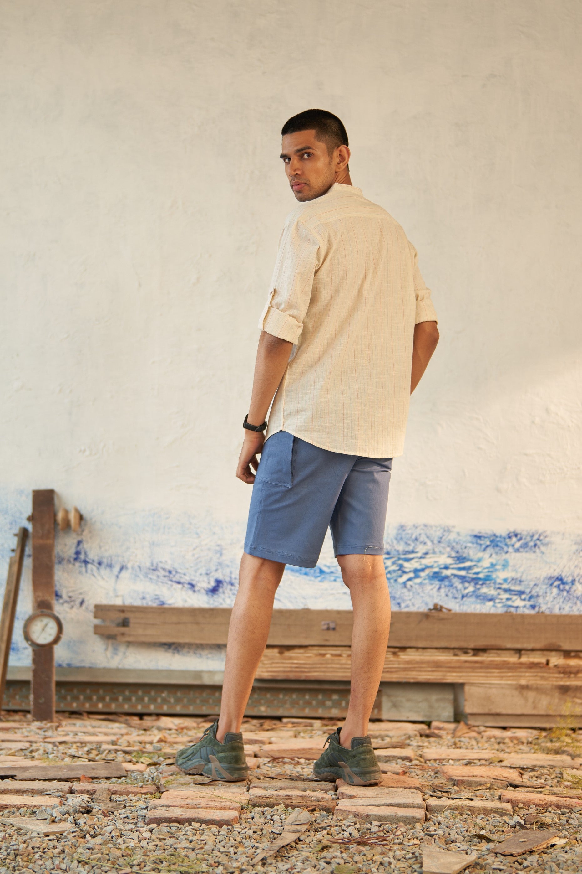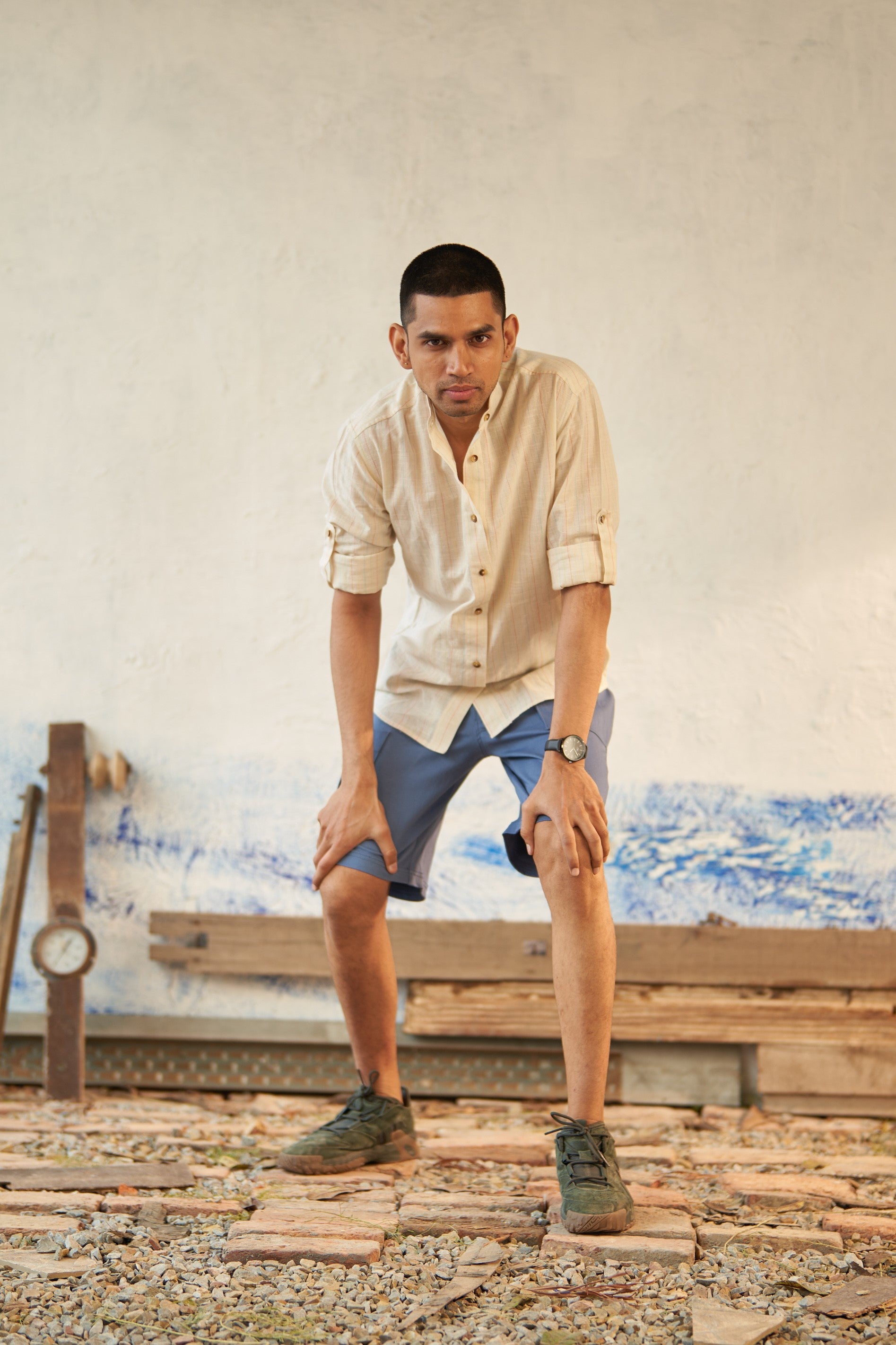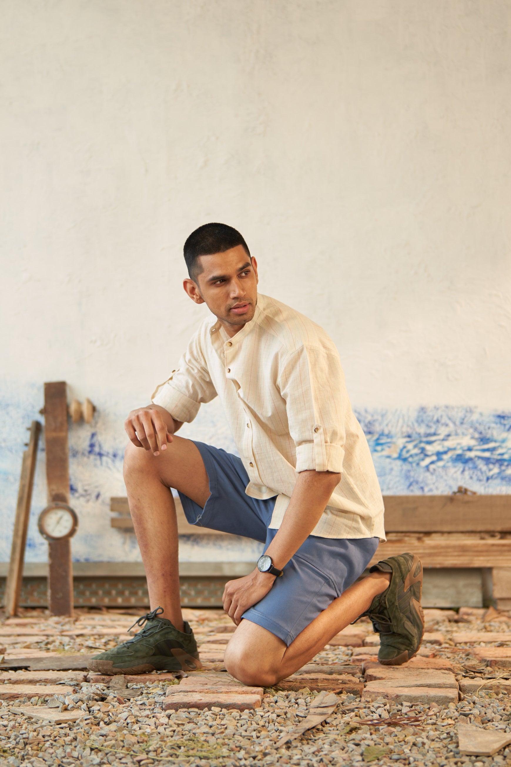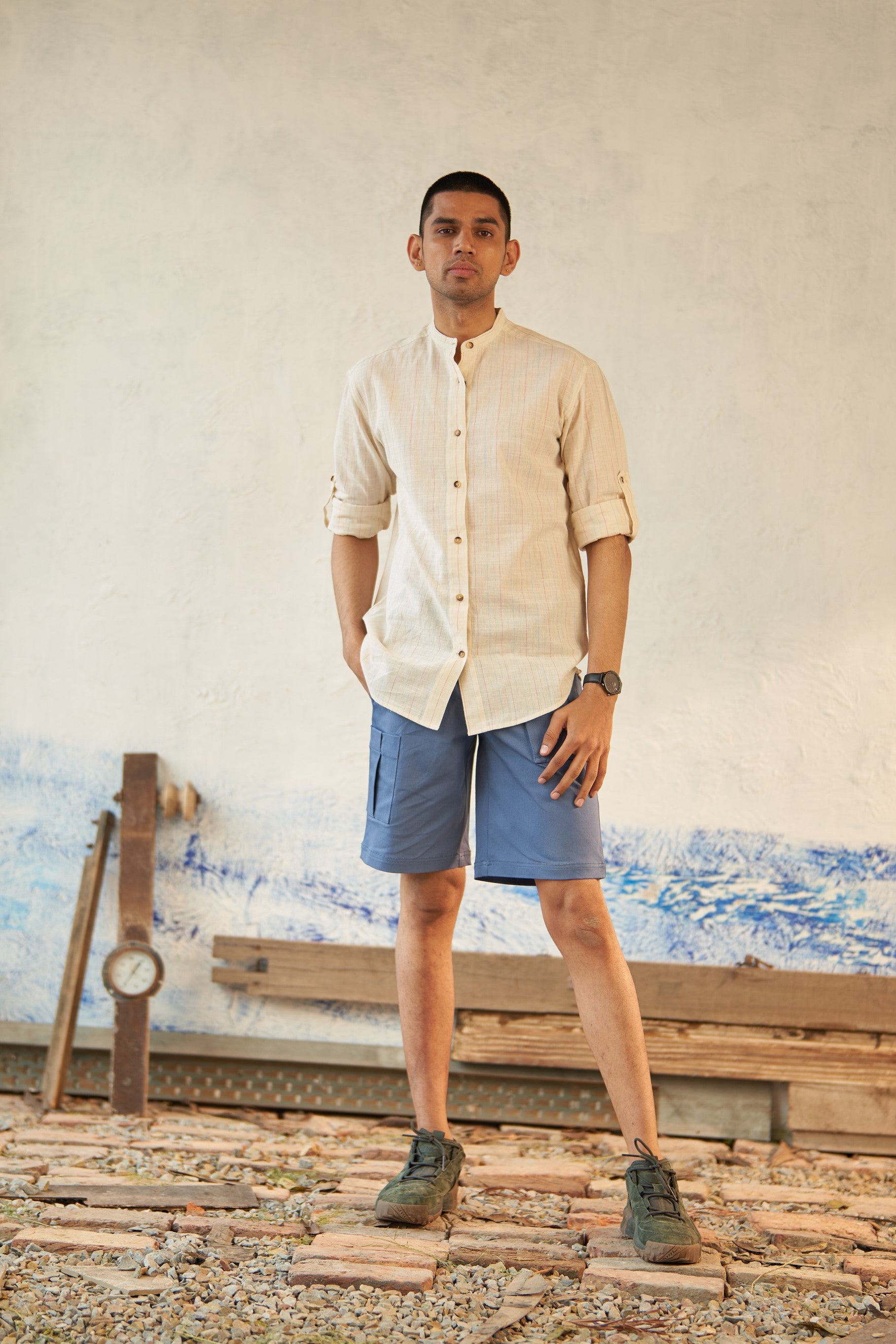 Our off-white stand-up collar shirt, crafted from textured cotton with subtle colorful lines, perfect for a laid-back ocean day.