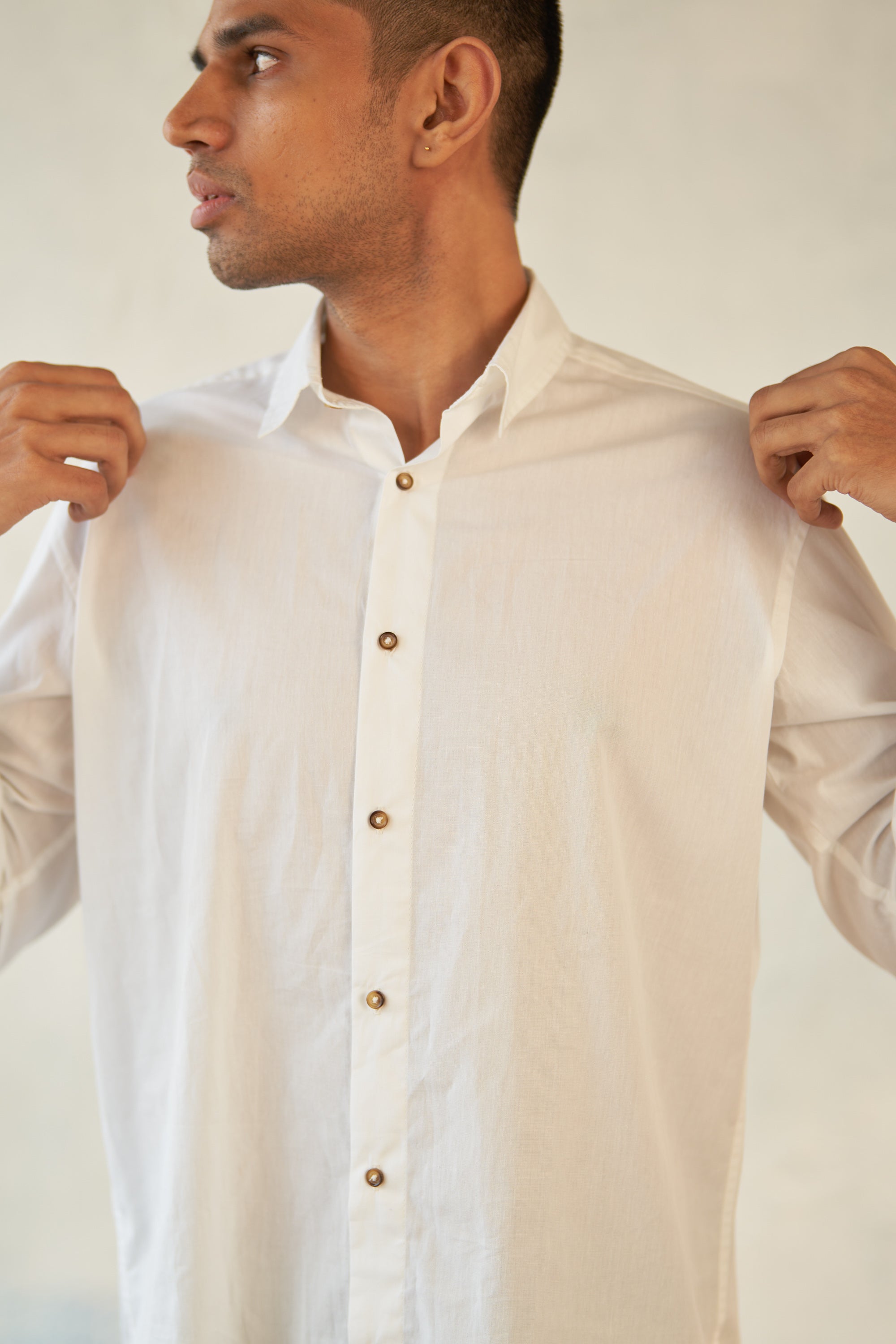 Timeless white shirt with smaller contrasting buttons for a subtle edge. Crafted in a regular fit with curved sides and hem.