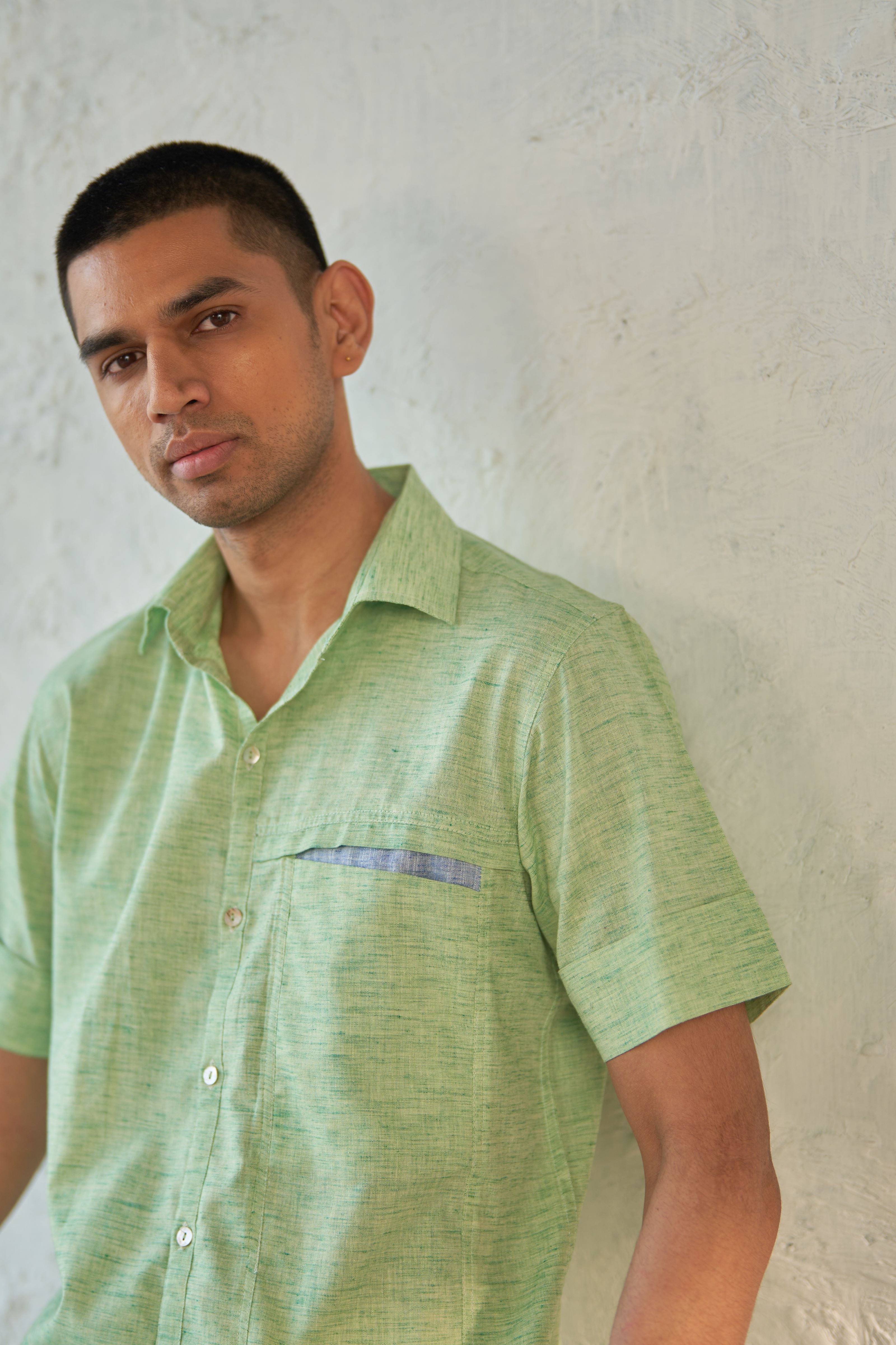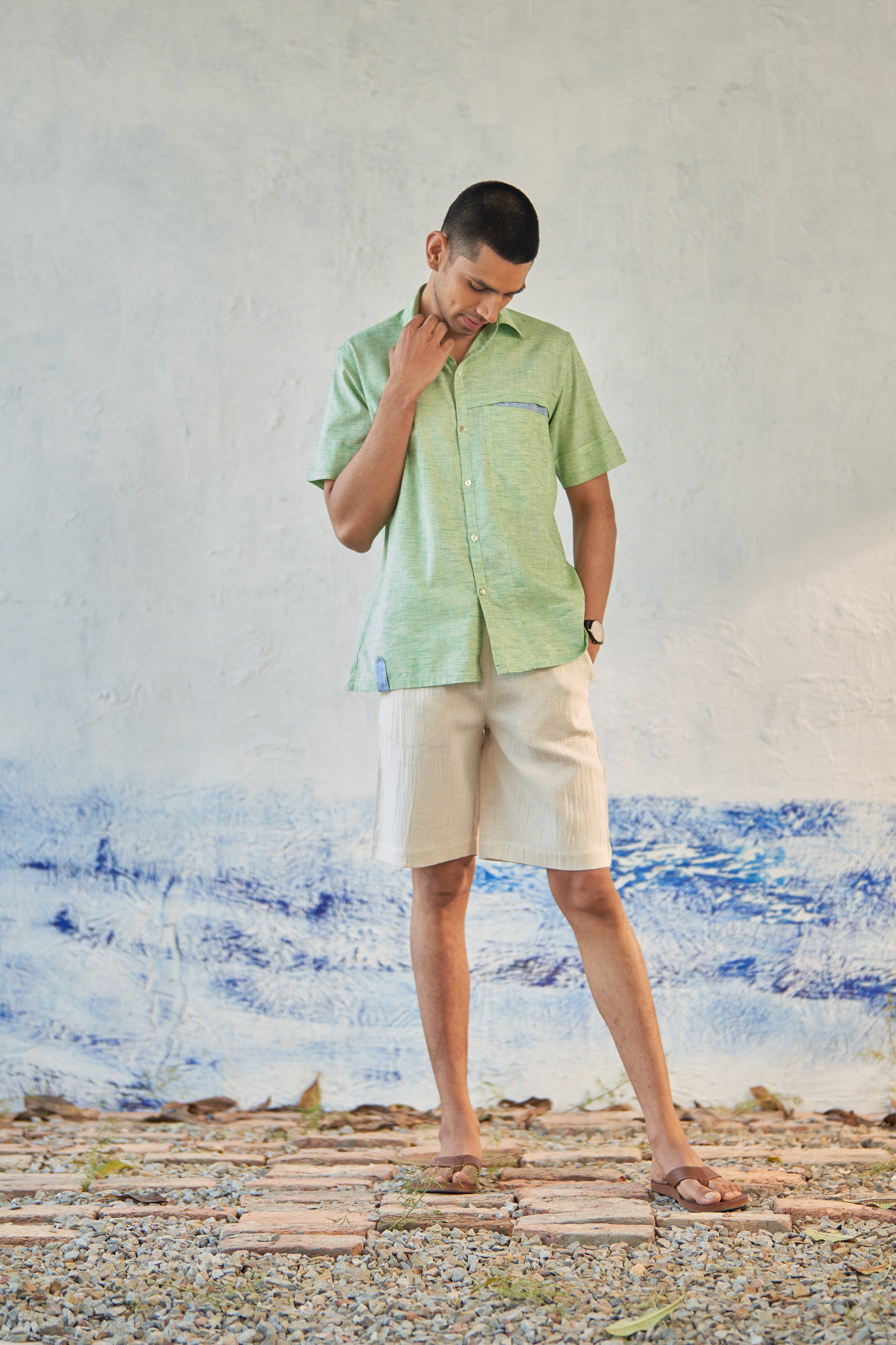 An aura of relaxed sophistication, perfect for various occasions from weekend getaways to laid-back afternoons. Crafted with meticulous attention to detail, the textured cotton half-sleeve shirt boasts a distinctive pocket design, while its narrow plackets and contrasting hues add subtle flair.