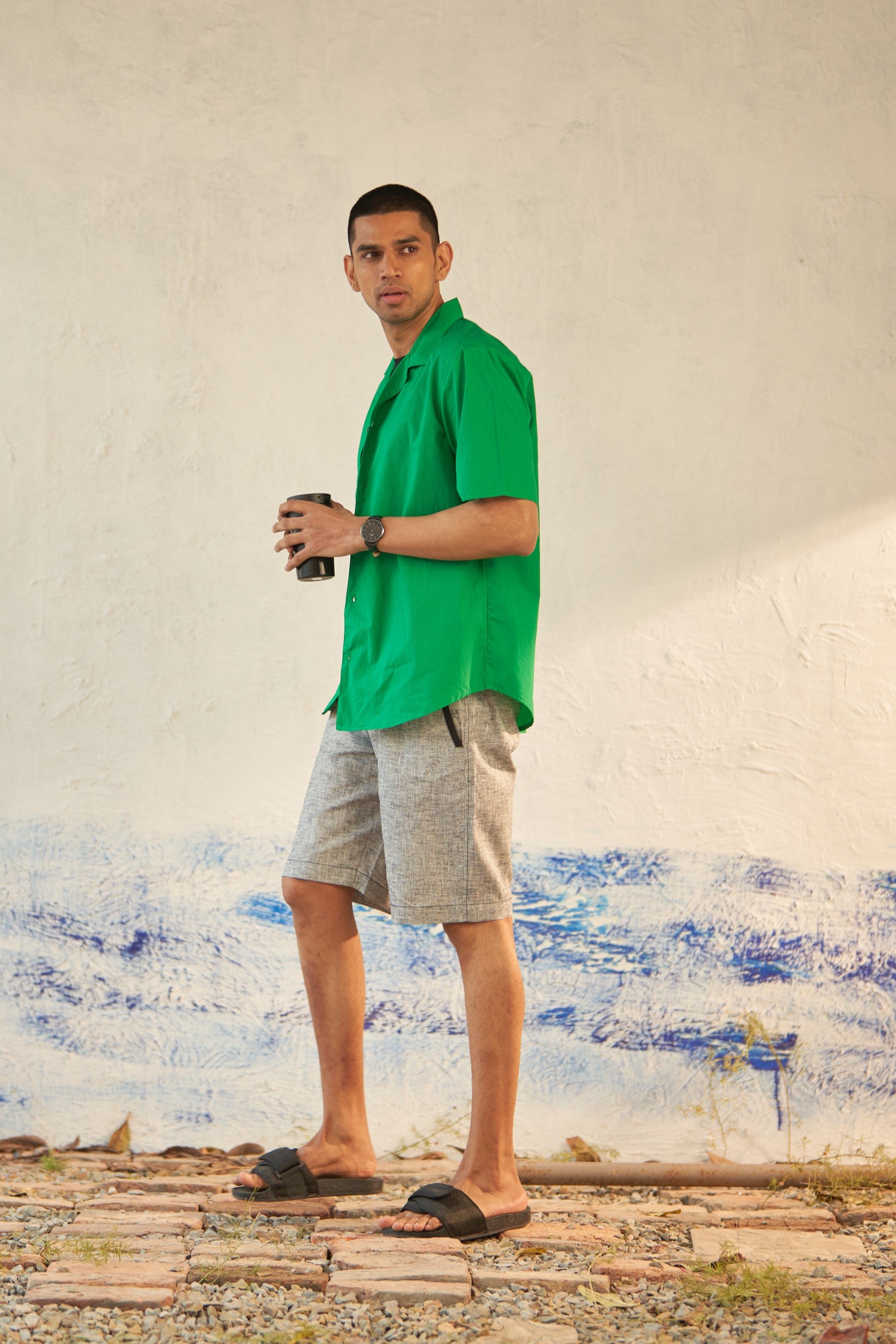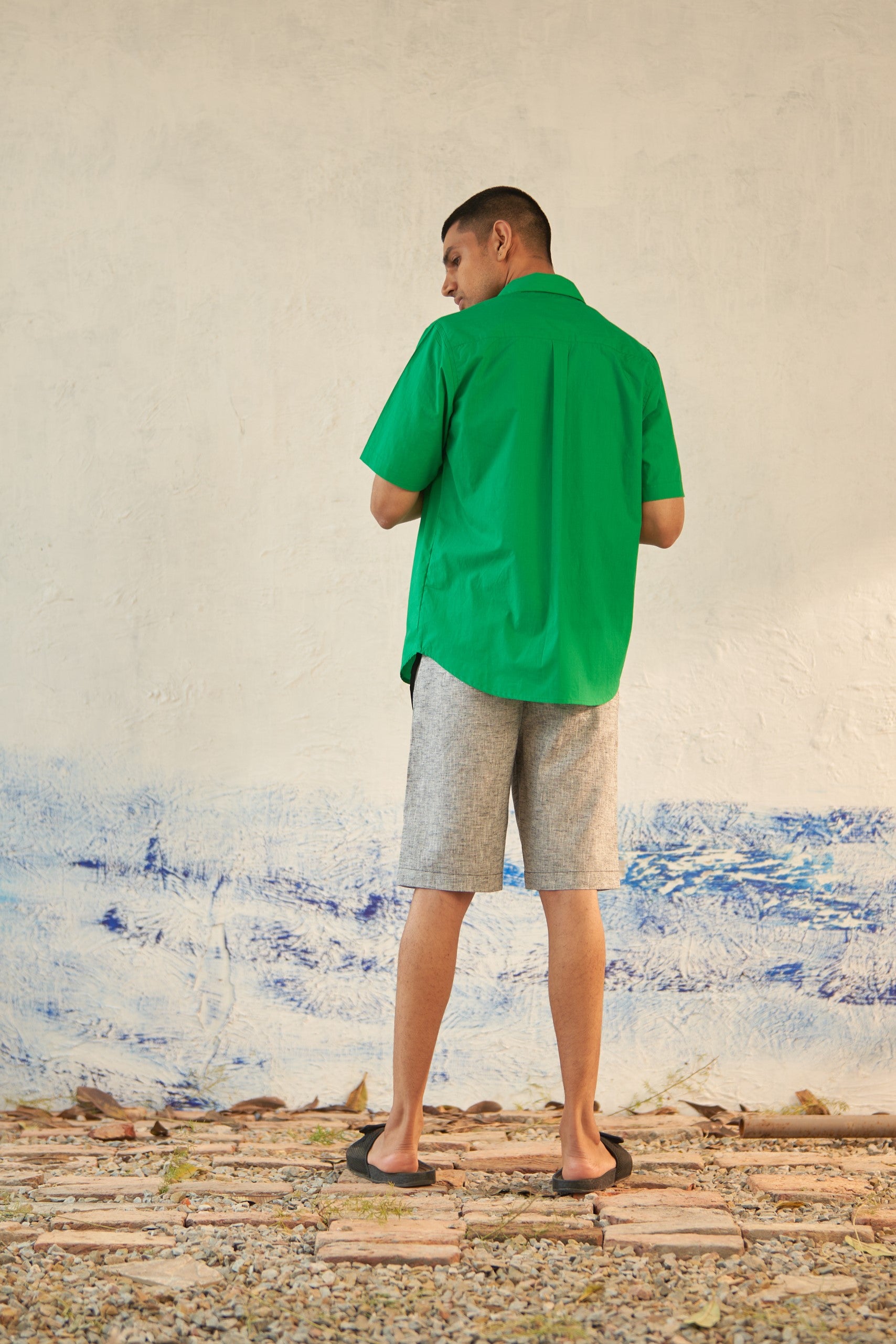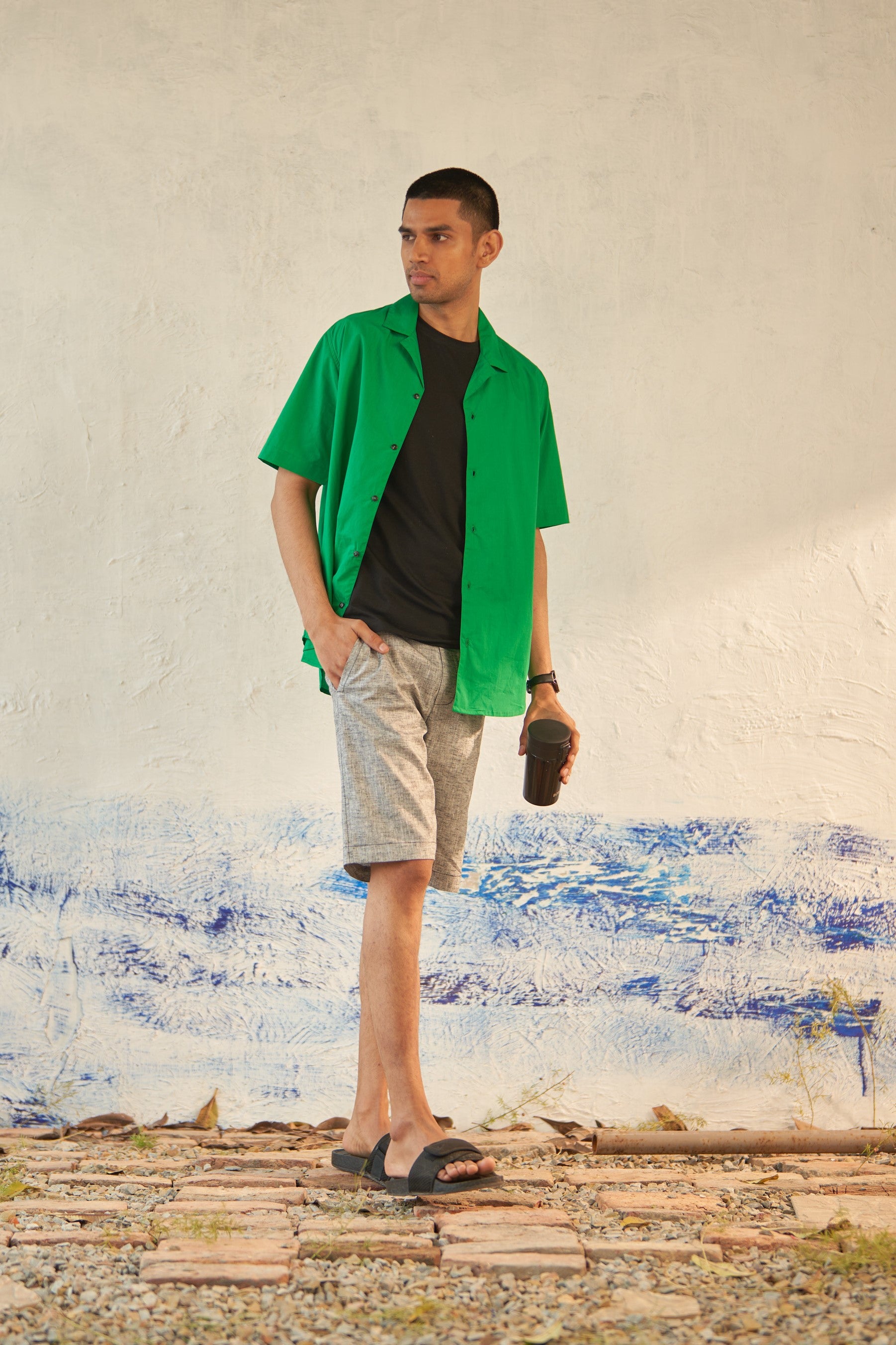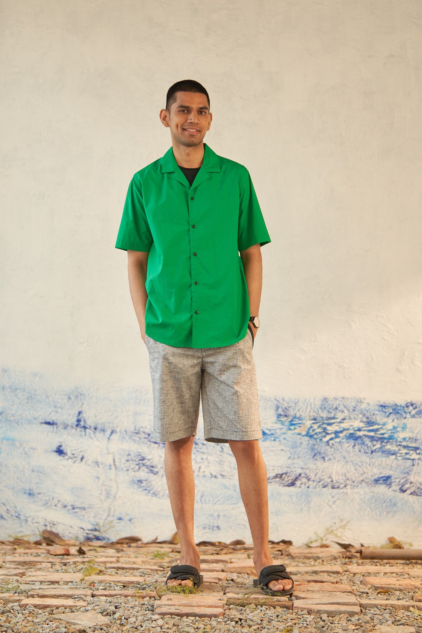 This green shirt is a holiday must-have, perfect for laid-back days under the sun. With its short sleeves and camp collar, it exudes charm, while black buttons and inverted broad plackets add sophistication.