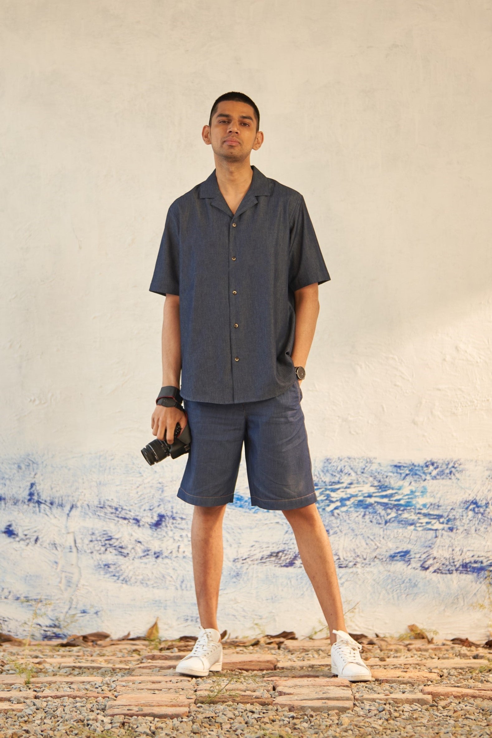 The ultramarine co-ord stands as a pinnacle of style in luxurious dark denim. The short-sleeved shirt exudes laid-back sophistication with its camp collar setting, while tonal buttons and inverted broad plackets elevate its easy wearability and understated elegance.
