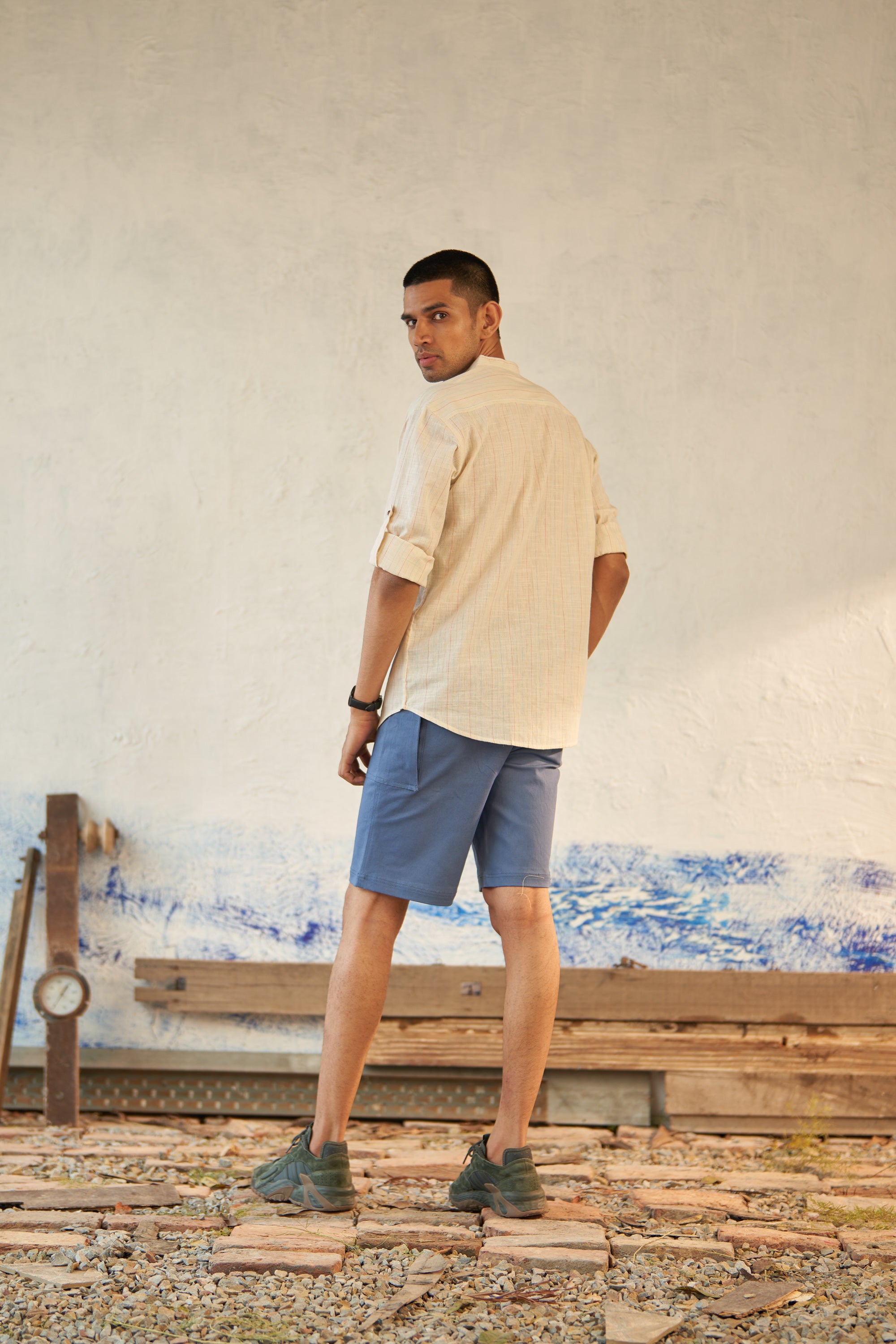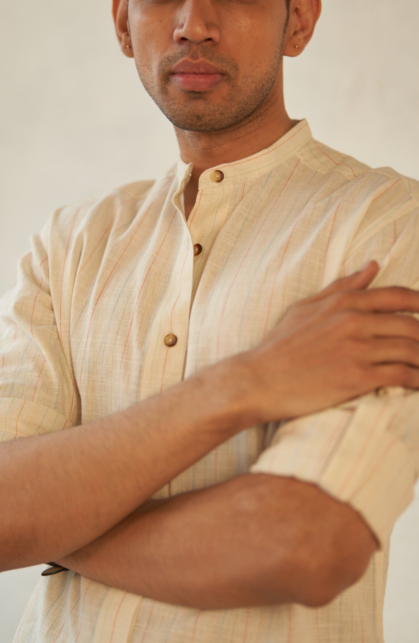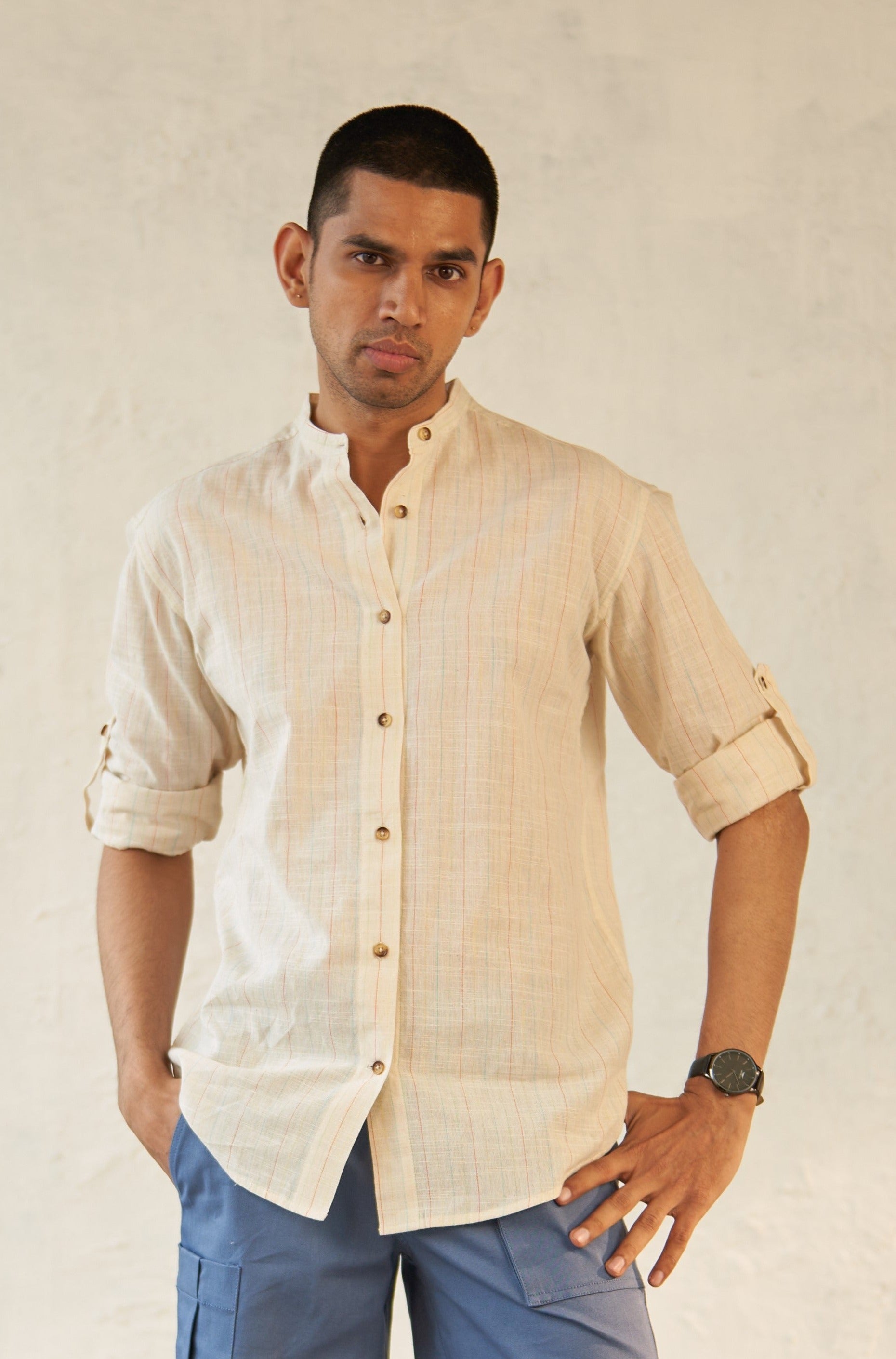 Our off-white stand-up collar shirt crafted from textured cotton, adorned with subtle colorful lines. This relaxed-fit shirt features roll-up sleeves with a lapel detail, along with a stand-up collar and long sleeves with buttoned cuffs.