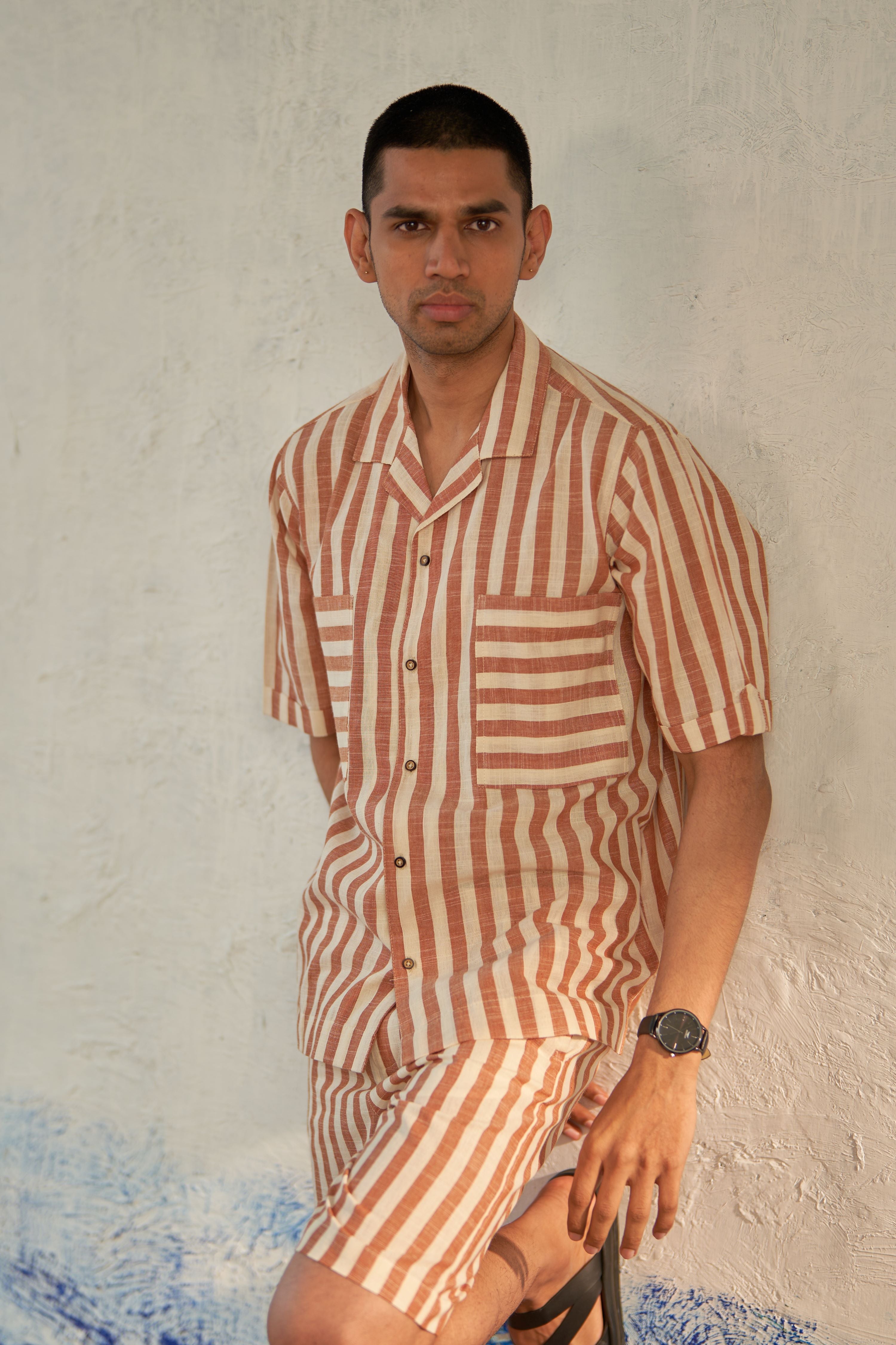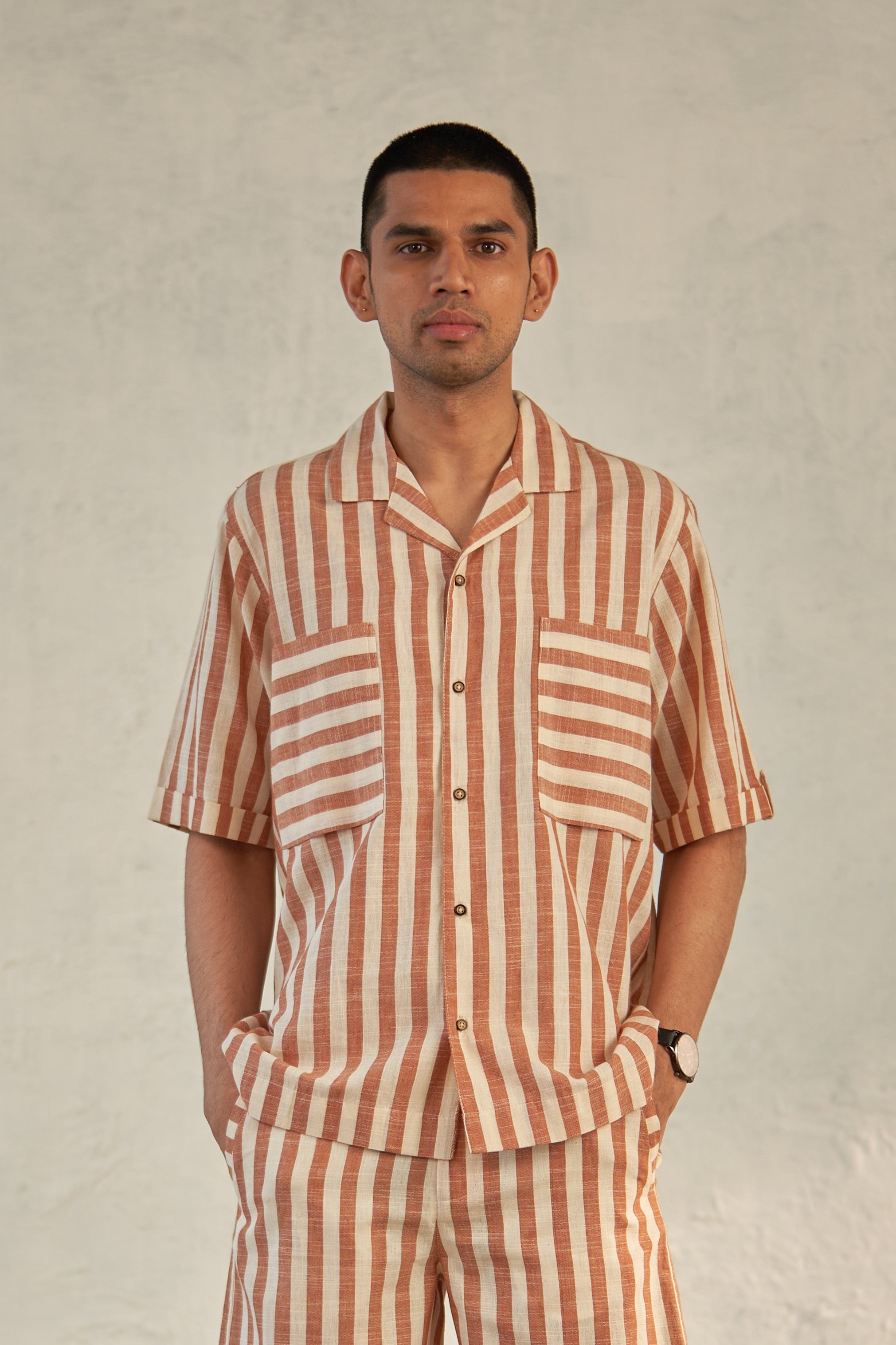 Designed for leisurely days, this shirt features soothing beige tones in a charming stripe pattern, set against a laid-back camp collar backdrop. The horizontal placement of the spacious pockets adds a subtle yet distinctive contrast, perfect for stashing away essentials as you unwind.