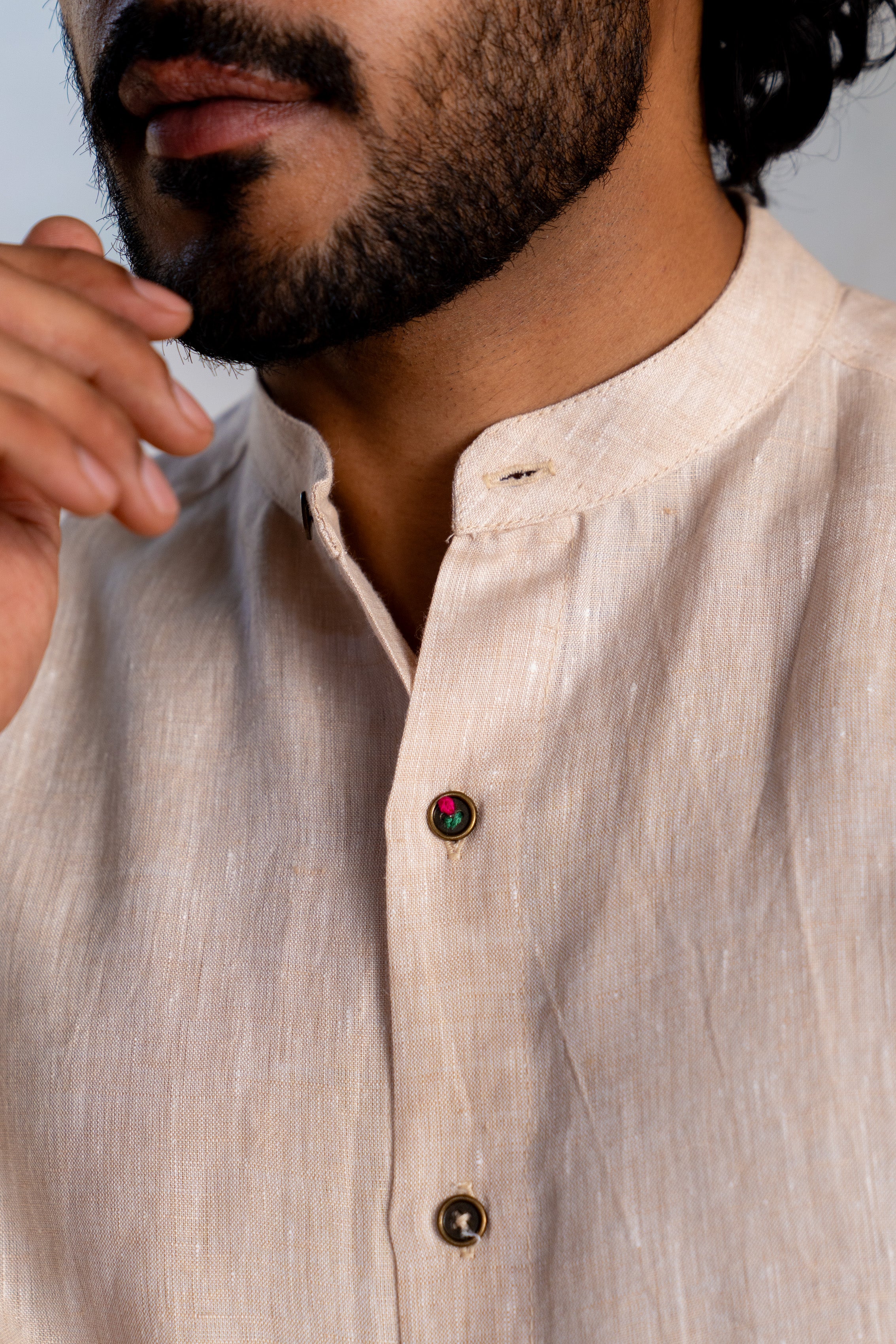Grounded in earthy tones, the Earthstone Linen Shirt offers a perfect blend of sophistication and casual ease. Made from premium pure linen, this relaxed-fit shirt features a stand-up collar and practical roll-up sleeves with lapel accents. The long sleeves with buttoned cuffs provide a polished finish, while the lightweight fabric ensures comfort for every season. Elevate your wardrobe with this versatile and timeless piece.
