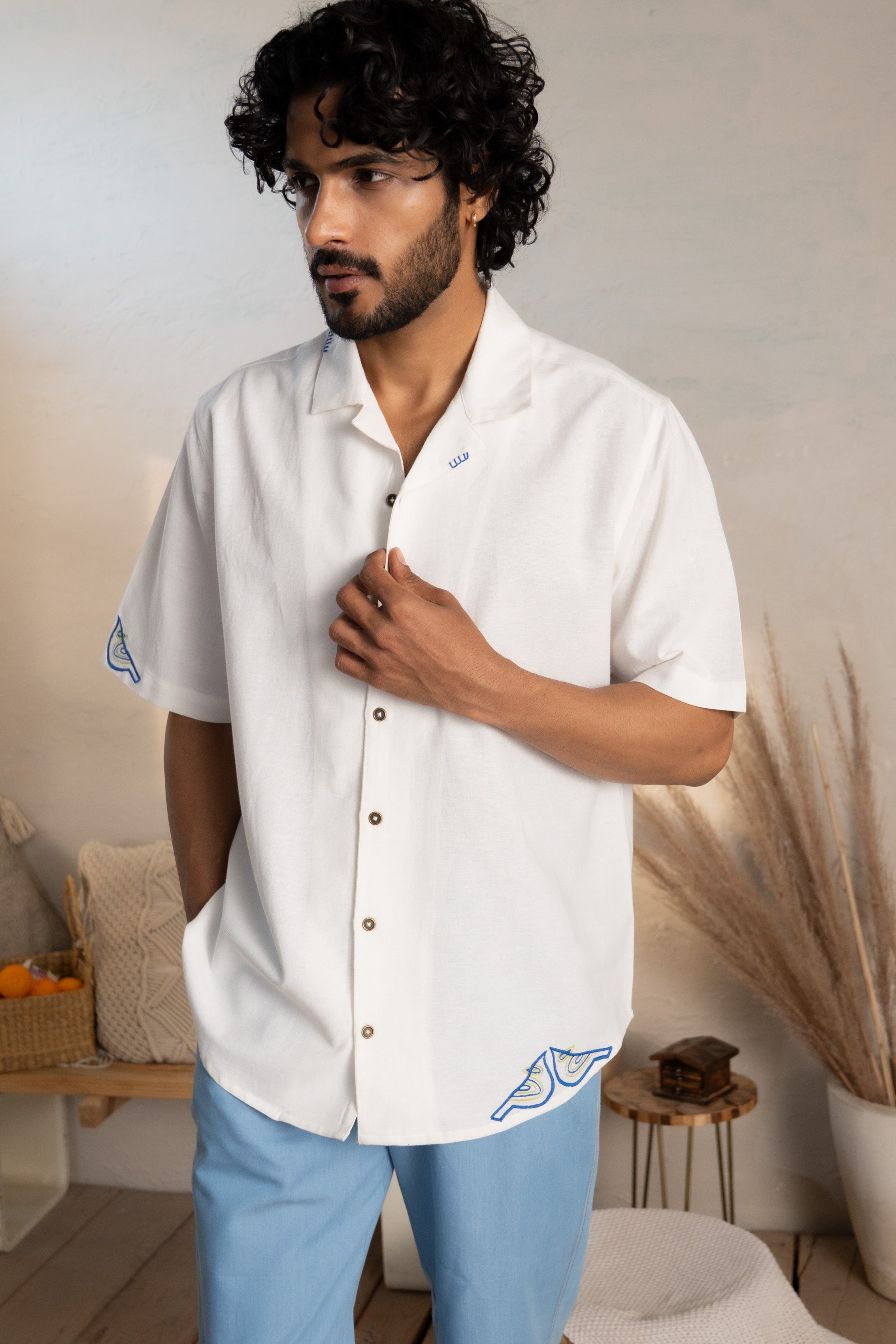 Inspired by lightness, freedom, and the open skies is the Horizon Blue Shirt, which has placement hand-embroidery. Crafted from slightly sheer fabric with a short lining for added comfort and sophistication.