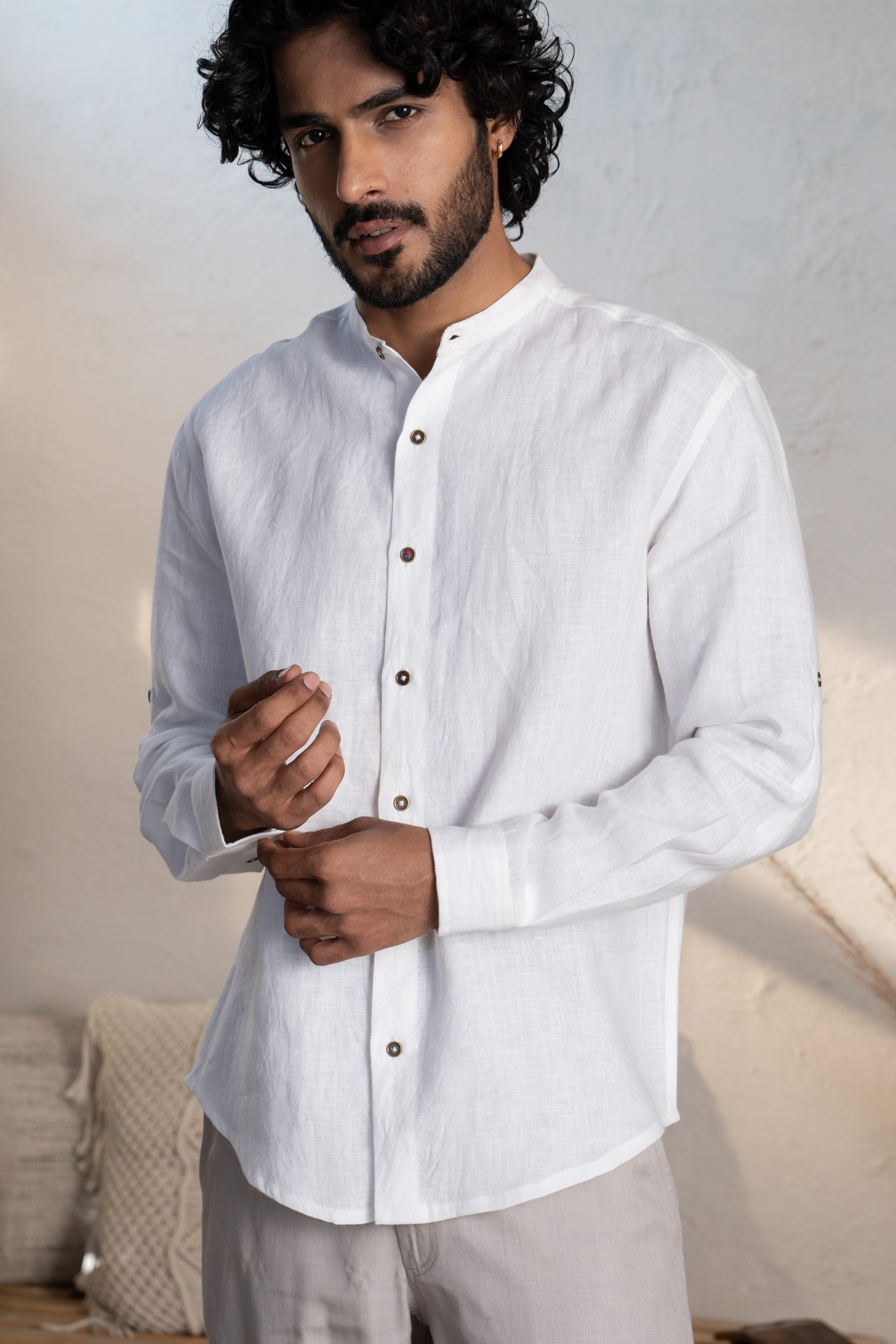 Timeless simplicity redefined—the Ivory Linen Shirt is a wardrobe essential. Crafted from soft, pure linen, this relaxed-fit design includes a stand-up collar and roll-up sleeves with lapel details for added versatility. The long sleeves, accented with buttoned cuffs, deliver a refined touch, making it ideal for both formal occasions and leisurely outings. Stay cool and chic with this effortlessly classic shirt.