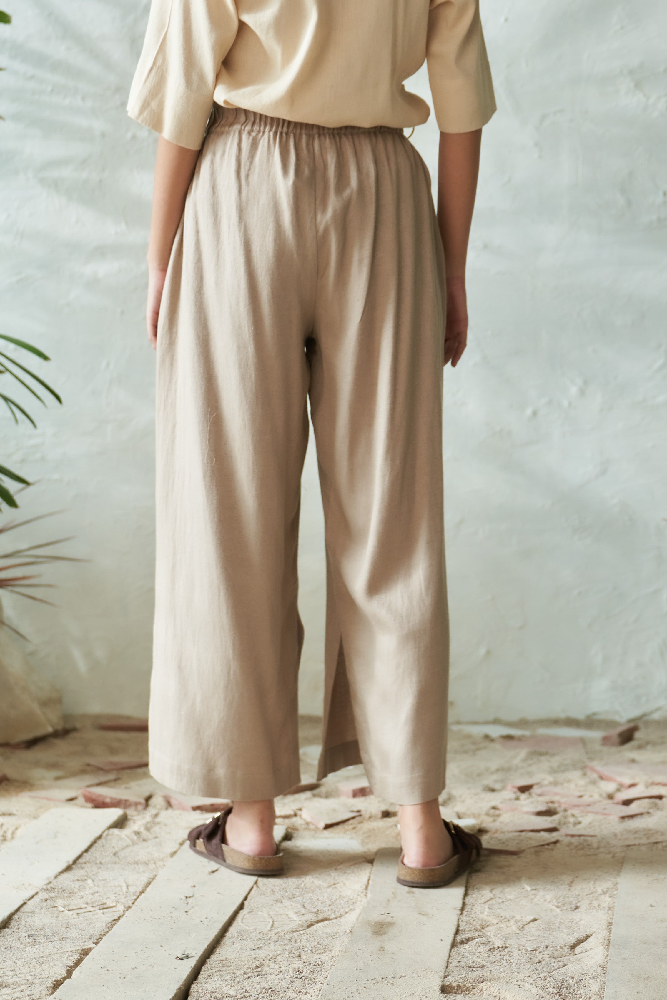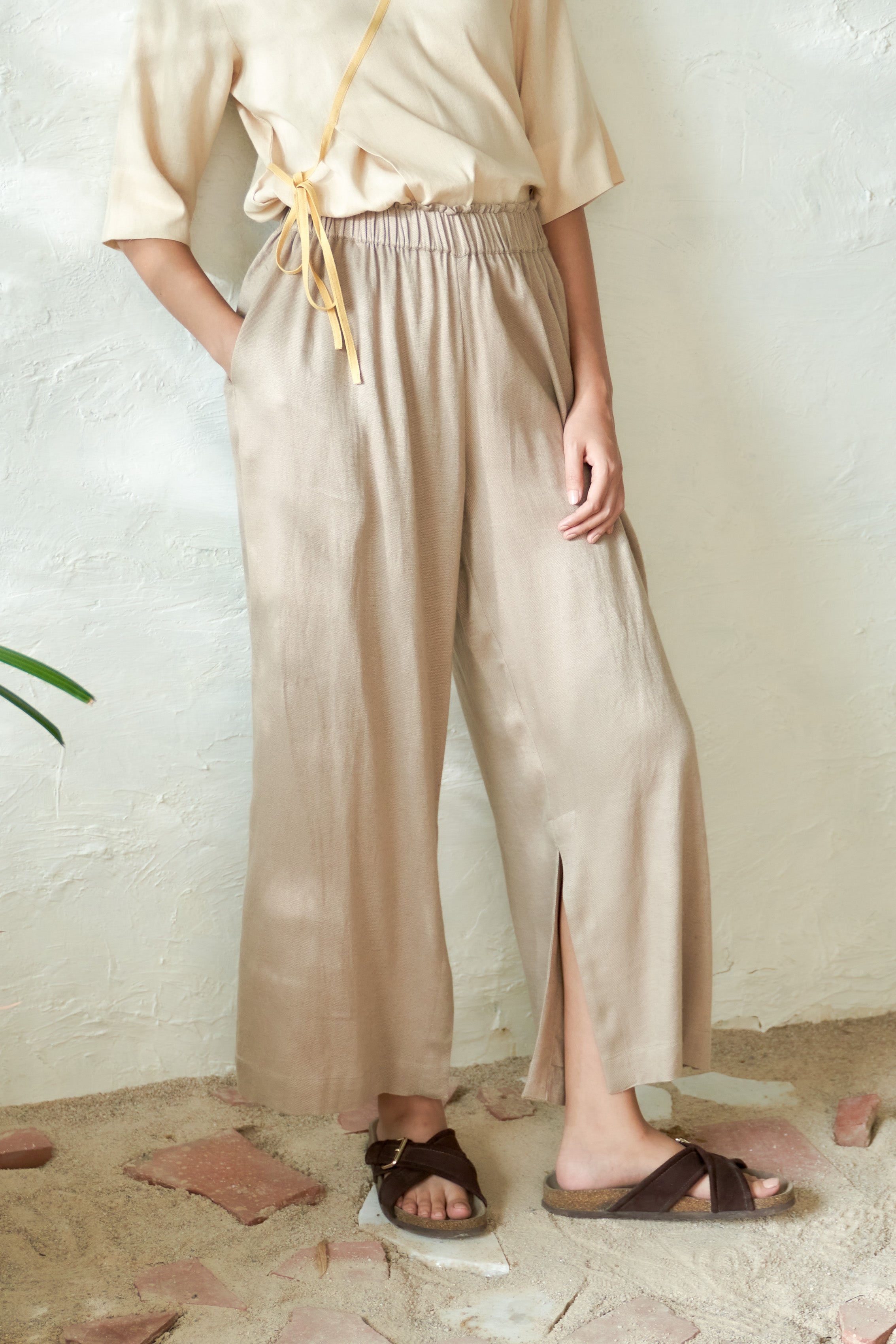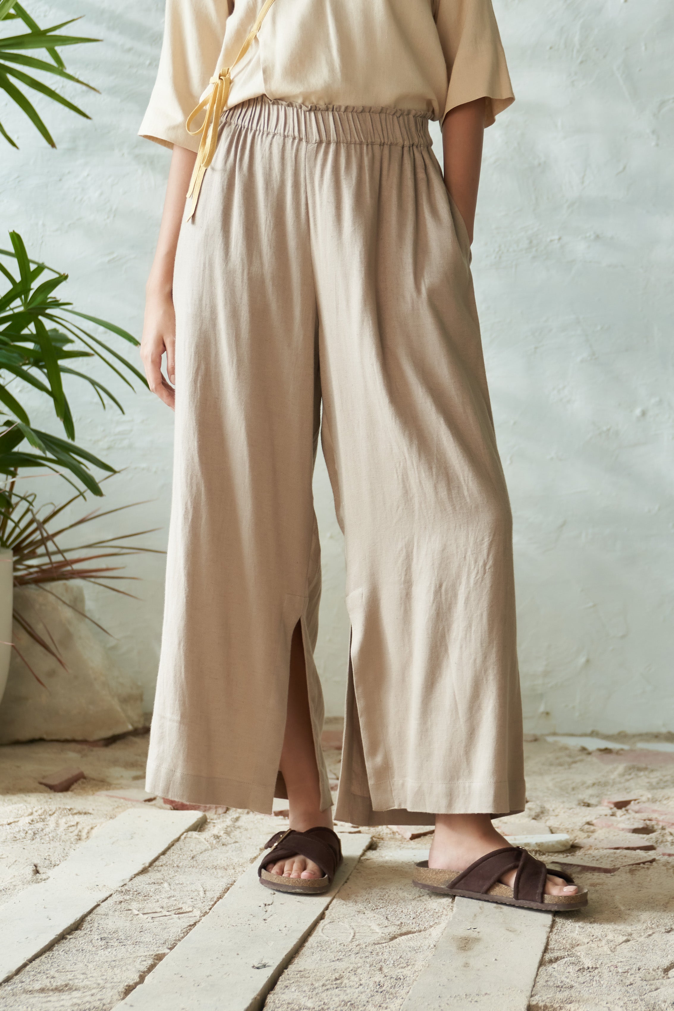 Experience effortless style with the Breve Coffee Pant. Featuring side slits, a flared casual fit, and an elasticated waistband, these pants are designed for comfort and spontaneity. Perfect for any occasion, they bring ease and versatility to your everyday wardrobe, making them an ideal pick for anytime, anywhere outfits.