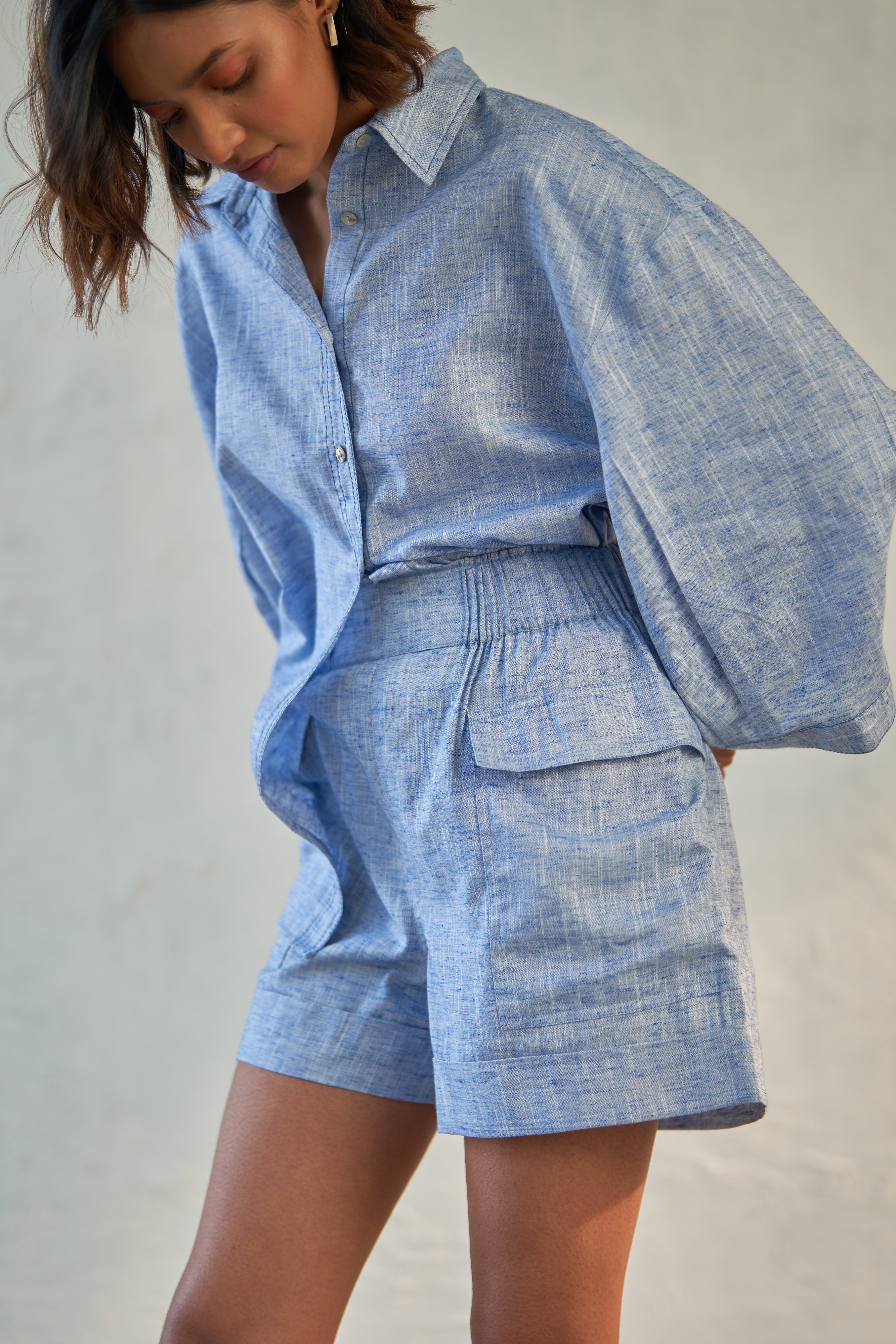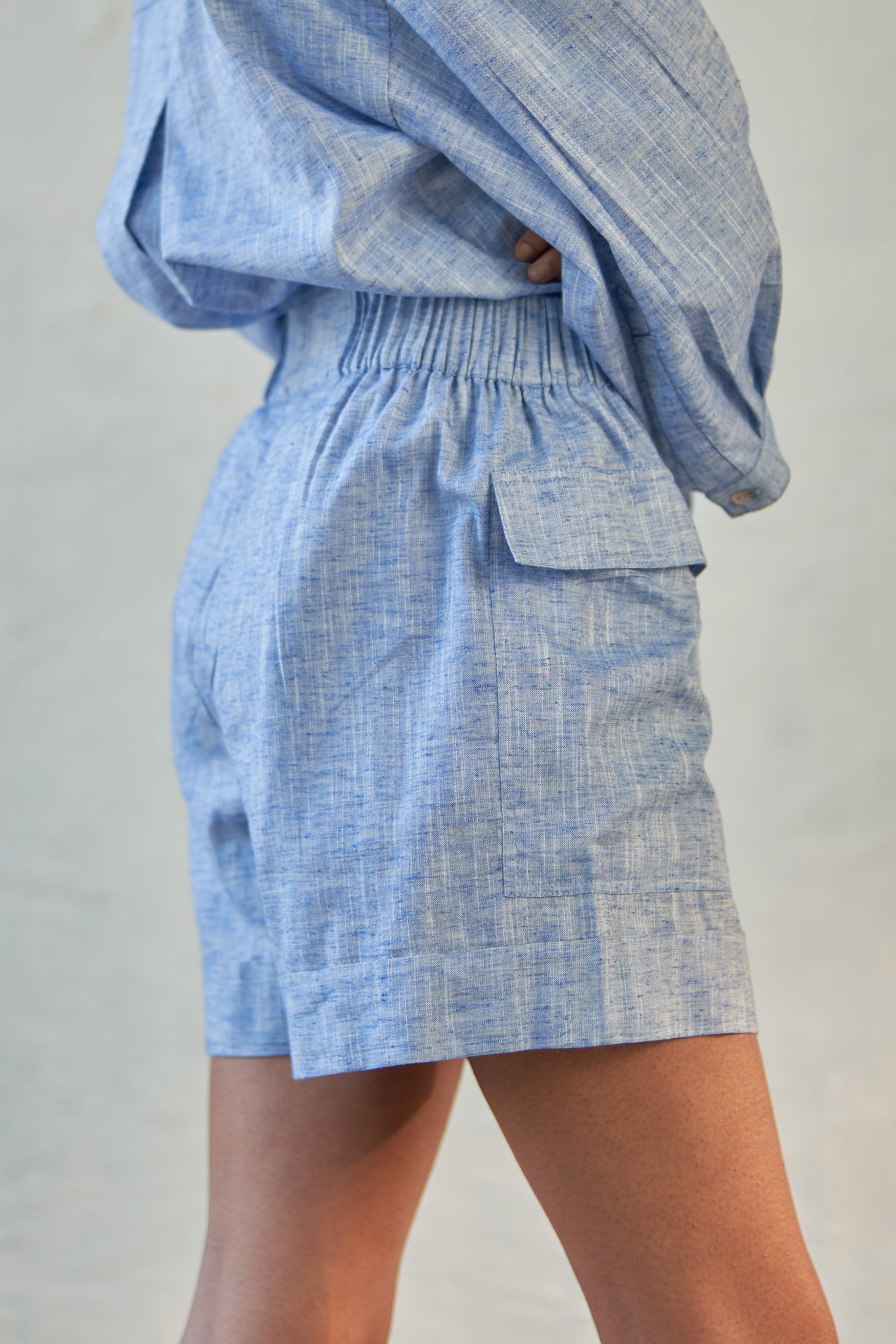 Step into casual comfort with these loose shorts, designed for ease with a half elastic waistband and practical flap pockets. Crafted from textured cotton in a delightful blue dash pattern, they offer a pleasing aesthetic and relaxed appeal.