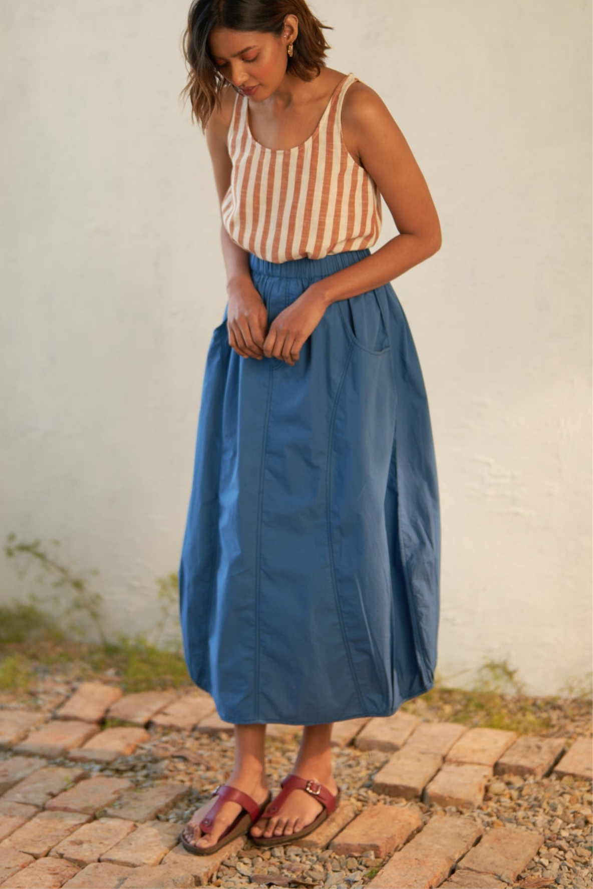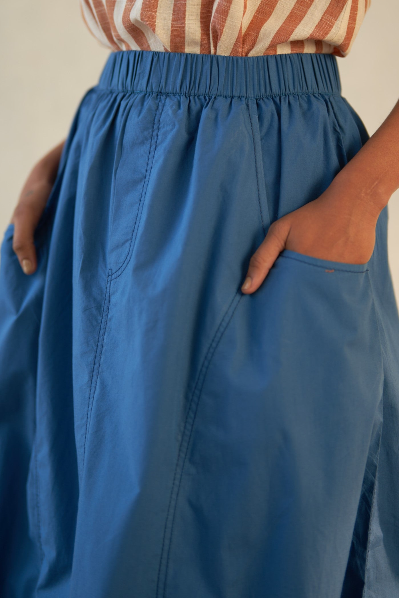 The ultimate casual chic skirt, ideal for your next laid-back get-together. With its relaxed fit and effortless style, this skirt is designed for comfort and versatility. Featuring a unique elasticated hem on both sides, along with an elasticated waist and intricate stitch detailing, it's the perfect blend of comfort and fashion-forward flair.