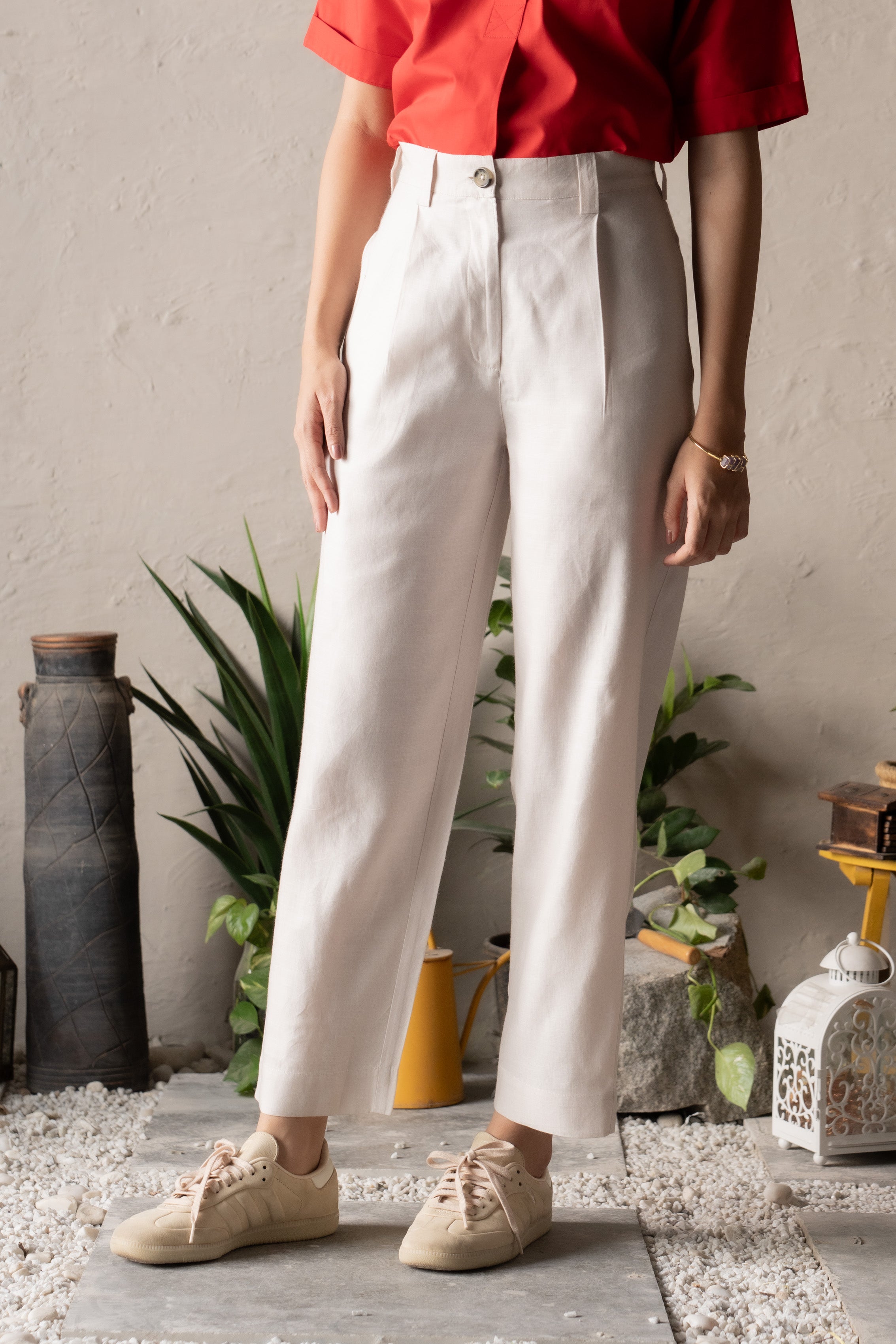 Redefine everyday elegance with the Glazed White Pleated Pants, designed in a crisp white hue with a subtle grey glaze. These high-waisted pants feature a narrow fit that flatters your silhouette, while the pleated detailing adds a polished touch. Complete with practical side pockets, they are perfect for both casual outings and formal explorations, offering comfort and sophistication in equal measure.