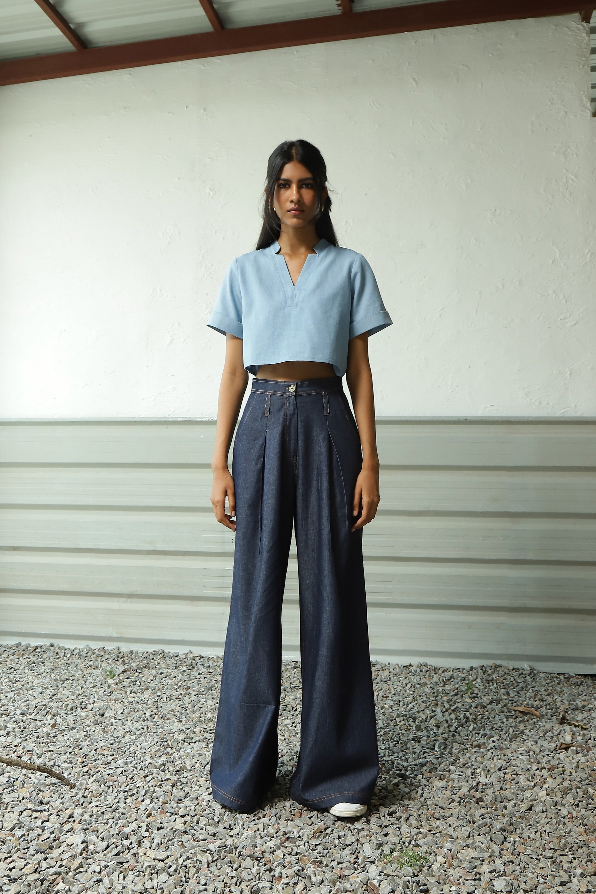 This uber-stylish denim pants from our collection are a modern twist on classic bell bottoms. Crafted from soft cotton denim and adorned with embroidery-like stitch detailing, these pants showcase skilled tailoring.