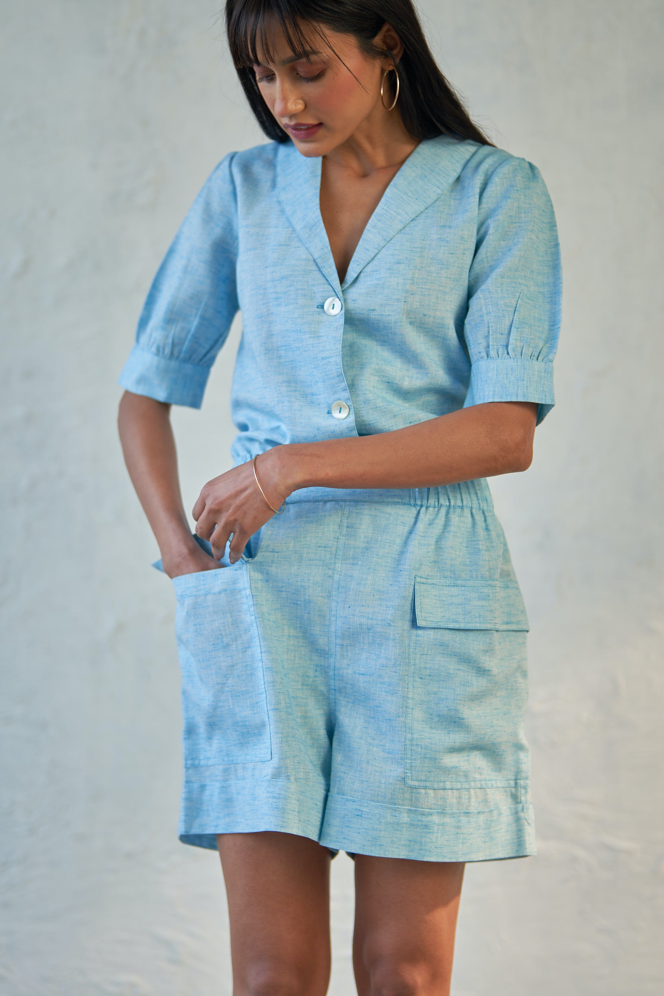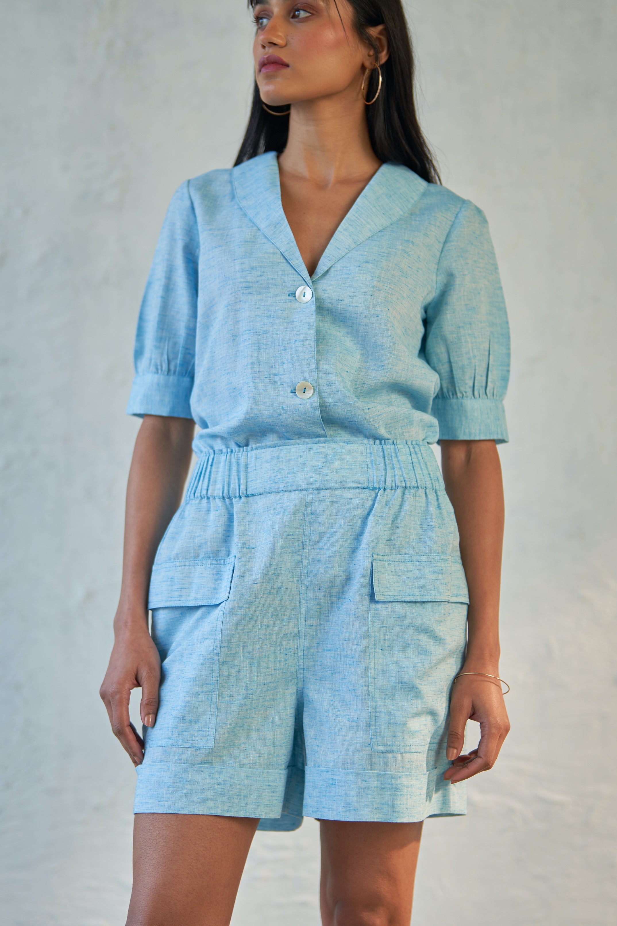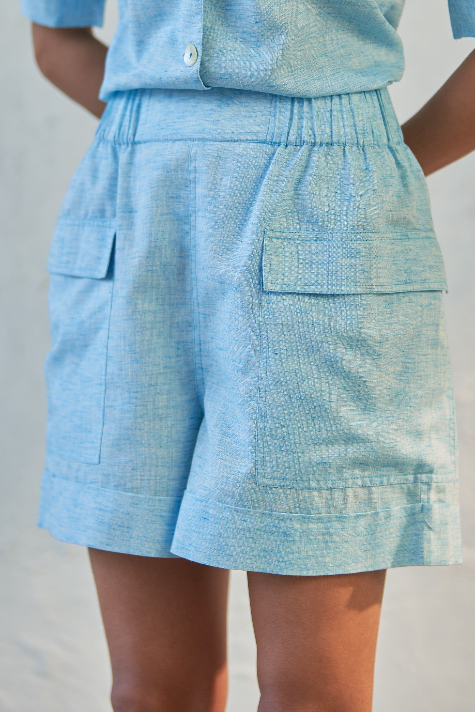 Immerse yourself in the cool tranquility of icy blue with our chic shorts. Designed with a half elastic waistband and flap pockets, they provide comfort and practicality in the refreshing hue of icy blue.