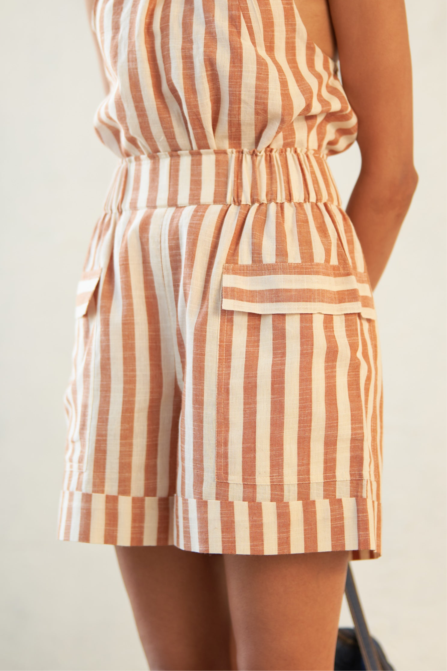 Savor the moment with our latte-colored striped shorts, perfect for embracing the day with a coffee in hand. These comfortable shorts boast a half elastic waistband and flap pockets, ensuring you can enjoy your coffee while stepping out in style.