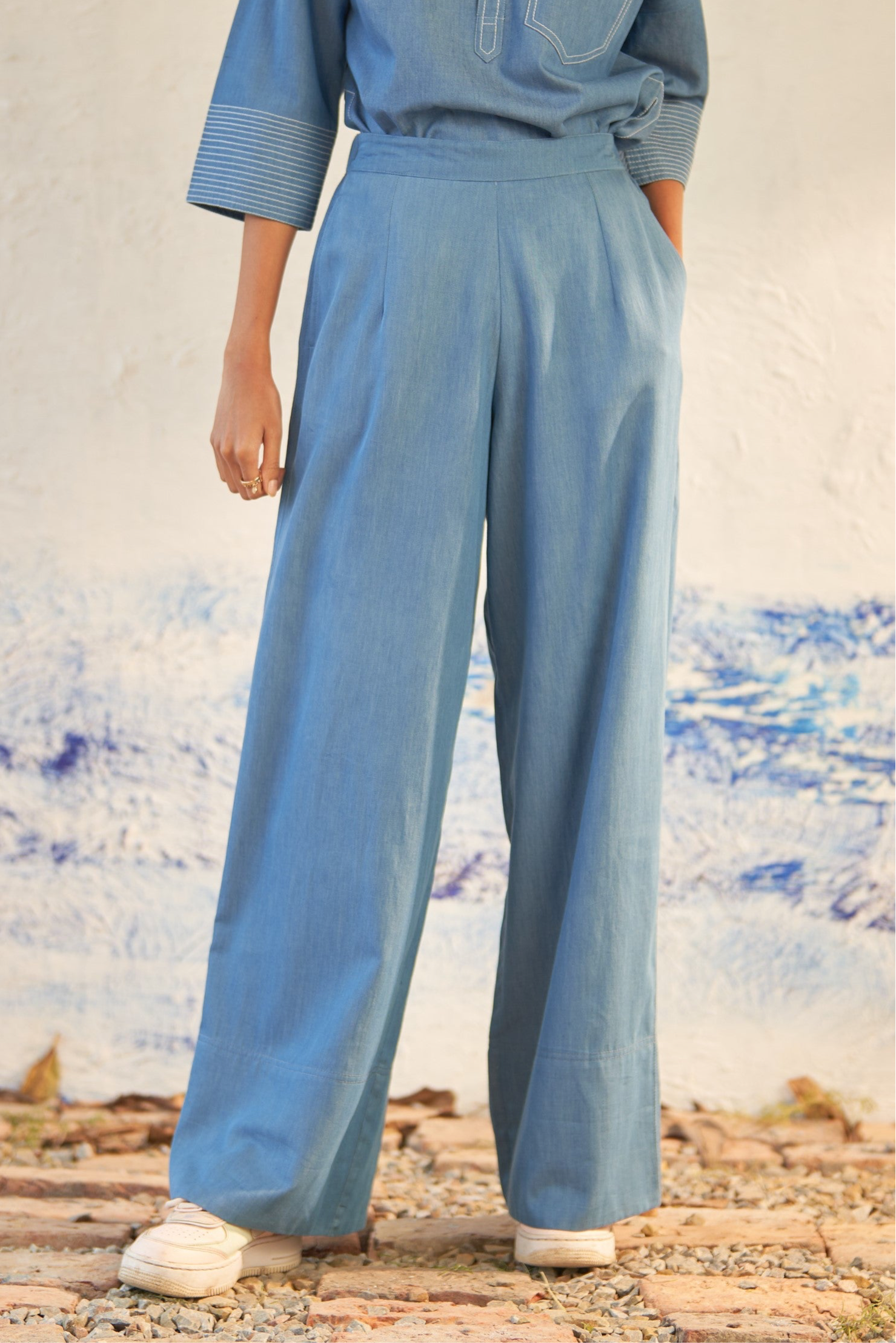 Crafted from fluid soft denim fabric, these pants feature wide, full-length legs with stylish broad folds at the bottom, in sync with the latest trends. It features a flat waistband at front with elasticated back for comfort.