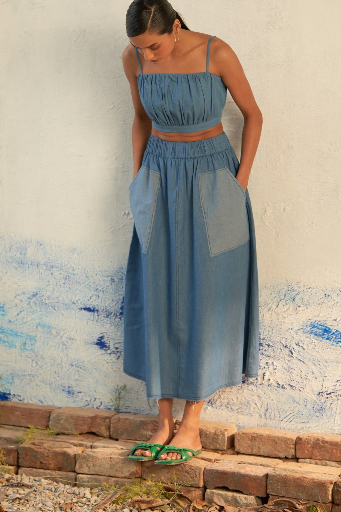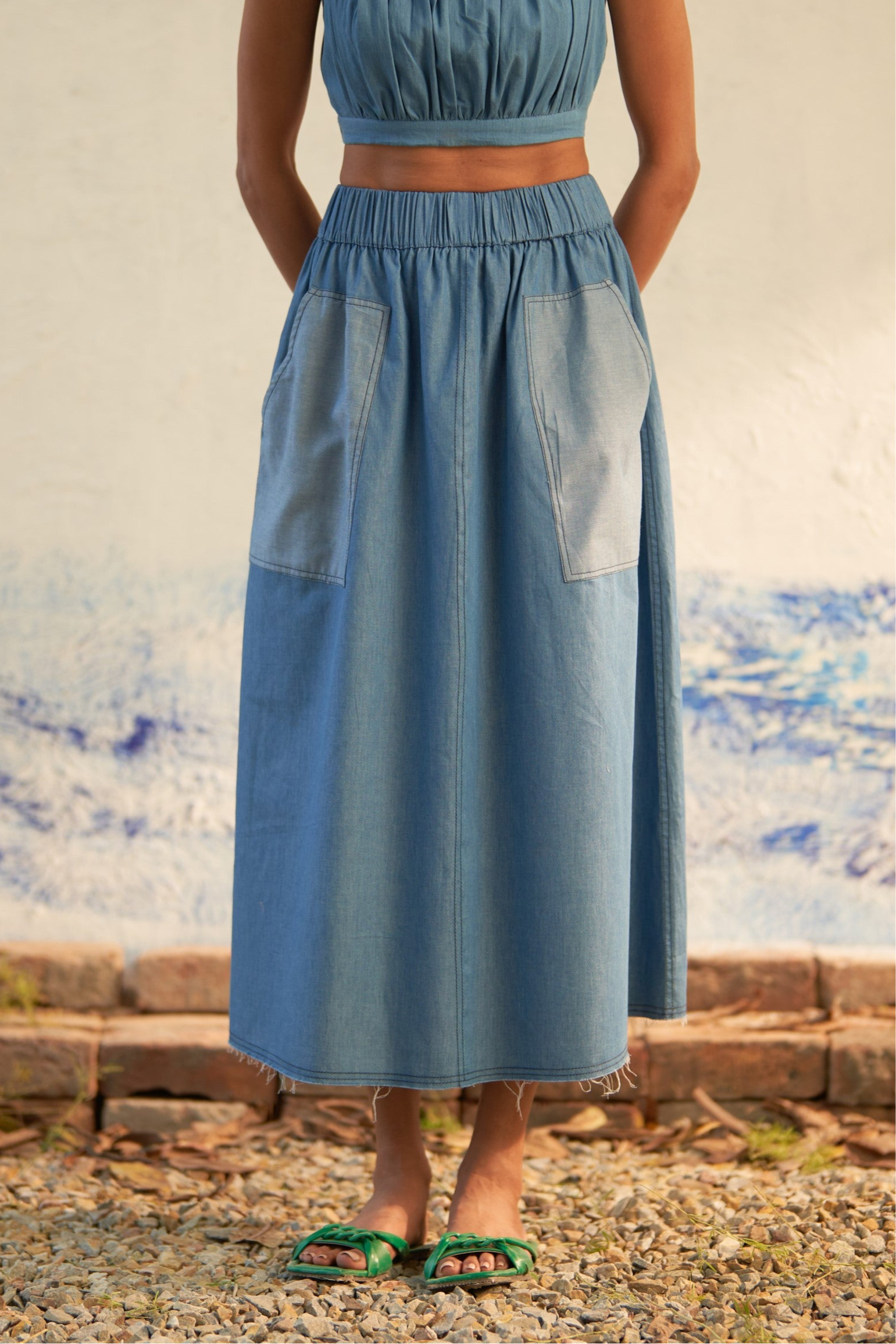 Step into effortless elegance with our soft denim cotton long skirt. Designed for comfort and style, it features an elasticated waistline for a perfect fit, while the double-sided patch pocket adds a unique flair with delicate thread detailing.