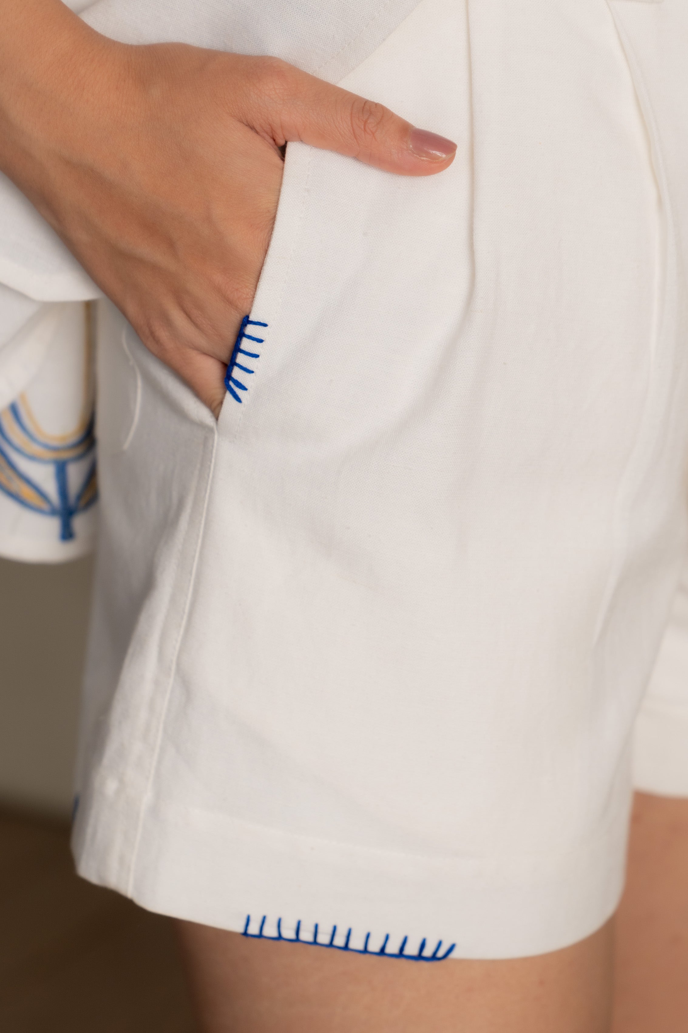 Experience comfort and style with the Tulip Mist Embroidered Shorts. Designed with a high-waisted fit and a flowy, wide-leg silhouette, these shorts feature intricate hand embroidery of blue tulips, evoking the serenity of nature’s beauty. Perfect for summer days or relaxed evenings, they pair seamlessly with any top for a charming look.