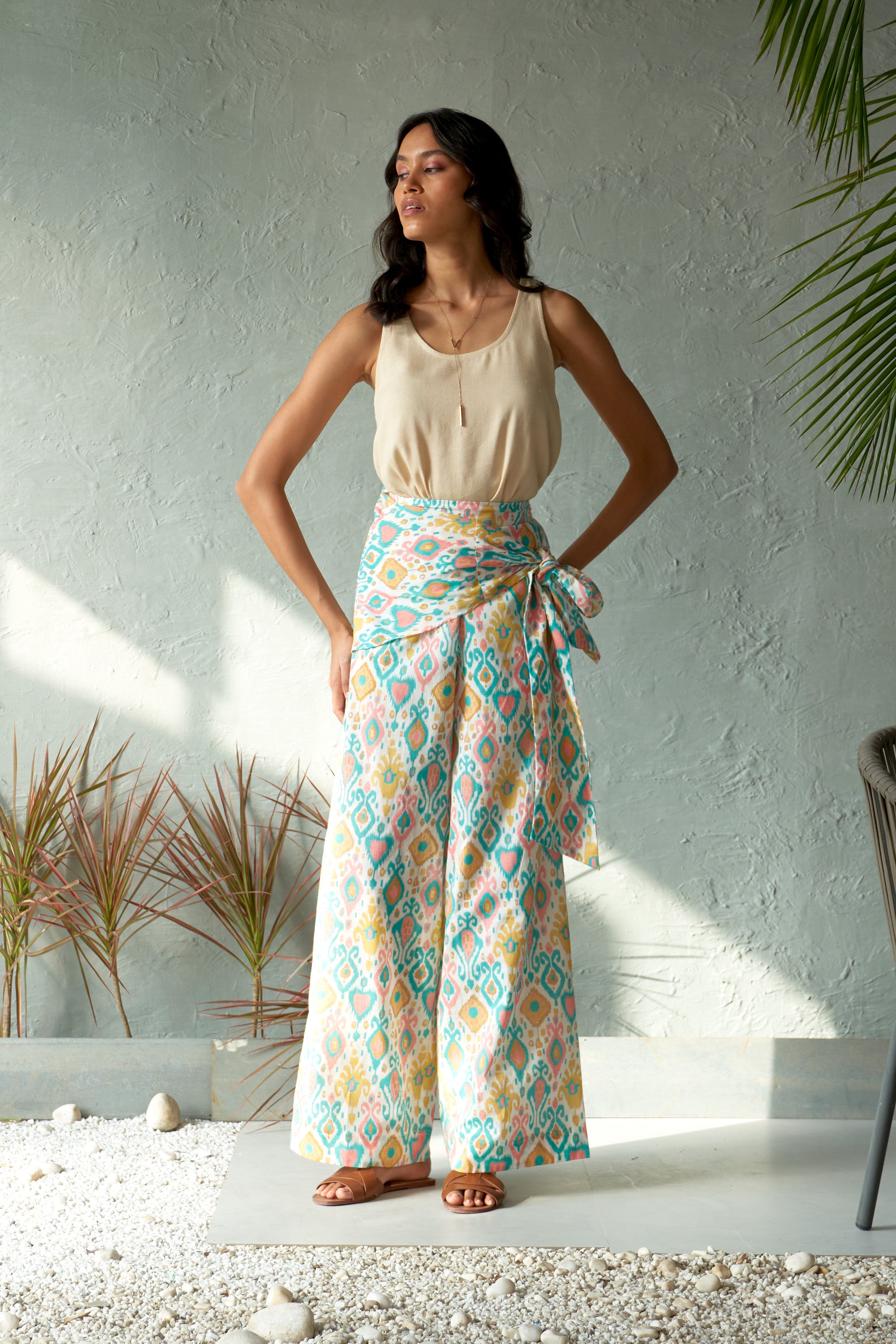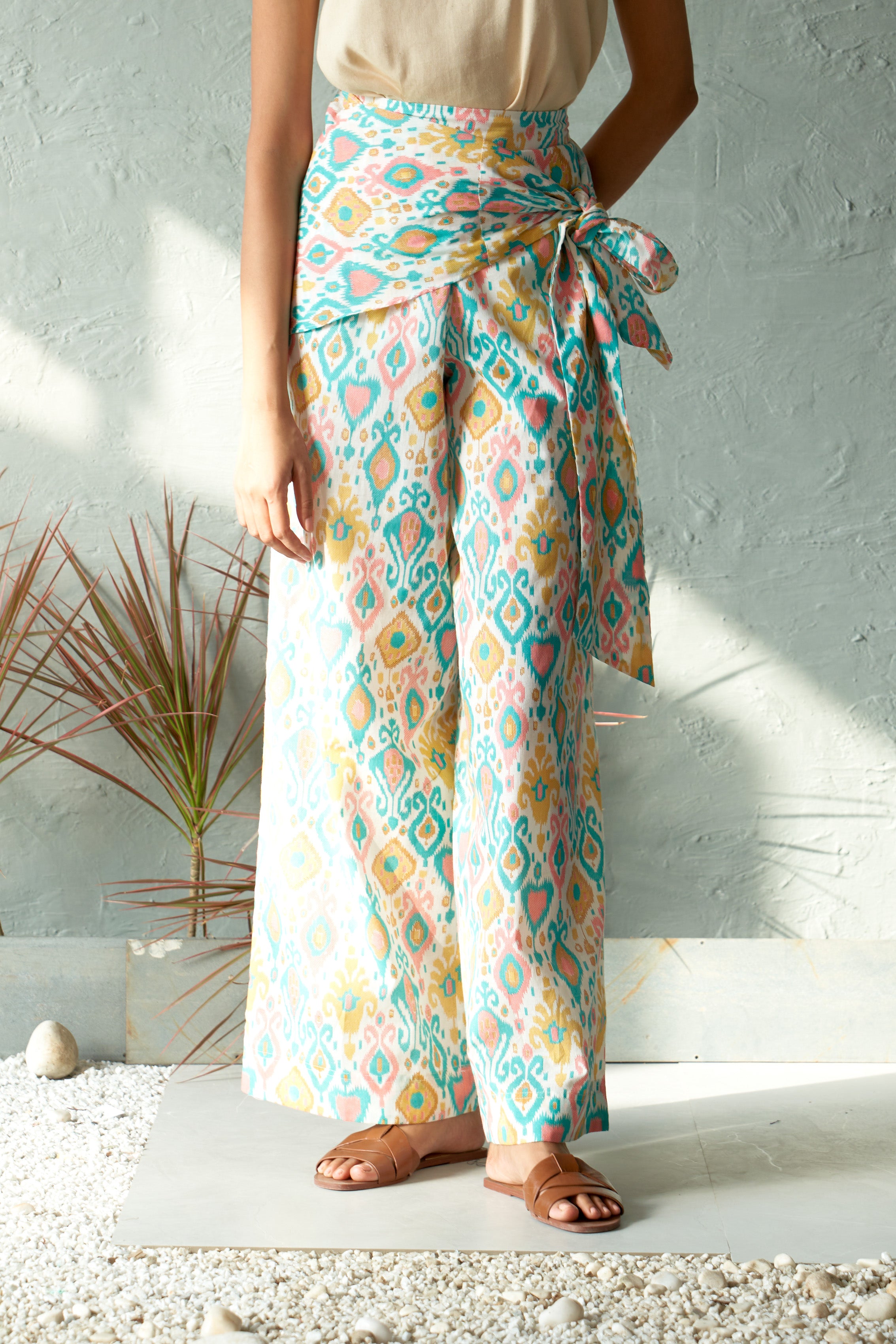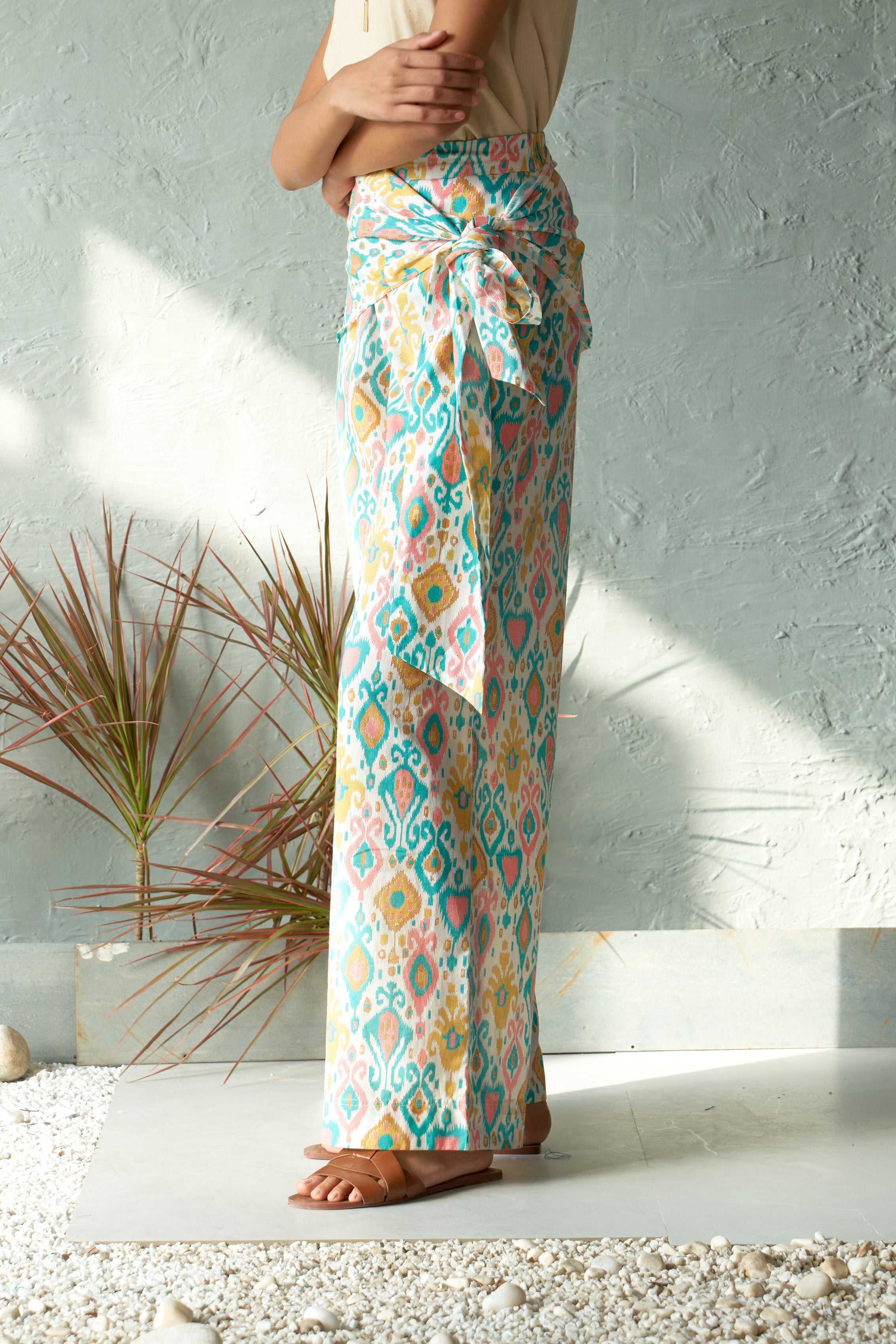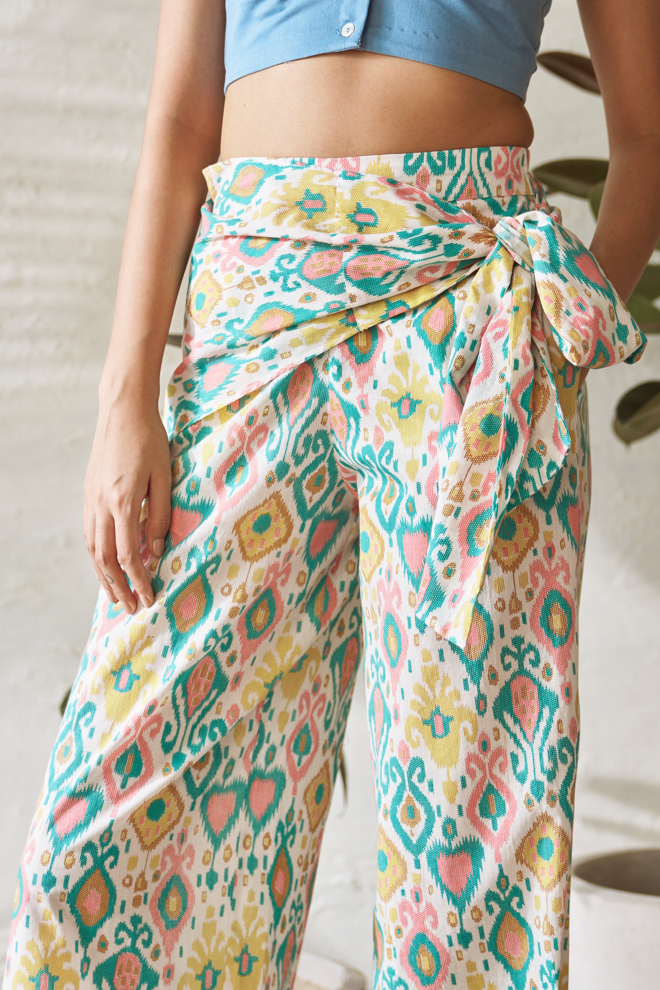 Make a bold statement with the wrapease pants, designed for both comfort and style. These flared pants feature a vibrant, eye-catching print crafted in lightweight cotton fabric, ensuring breathability and ease of movement. The standout detail is the wrap belt around the waist and hip area, allowing you to customize the fit to perfection. Whether for casual outings, beach days, or a fun evening look.