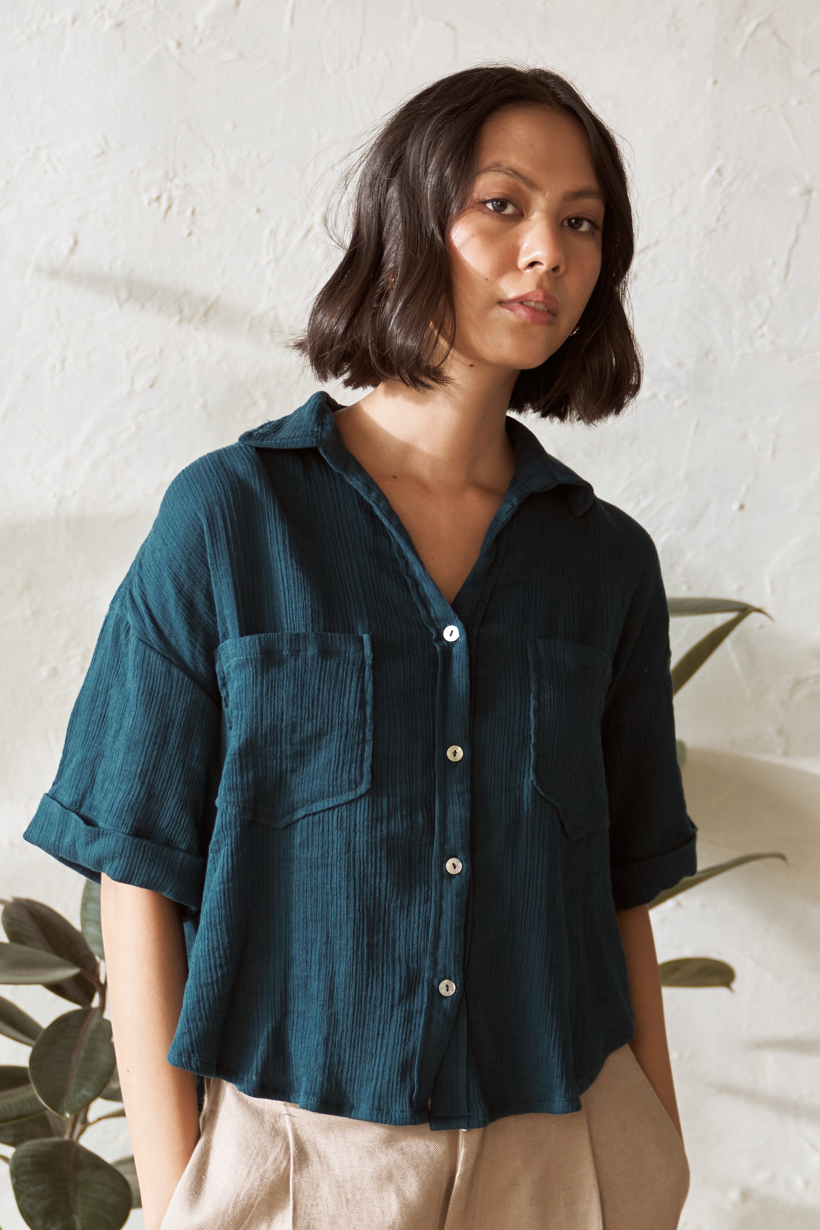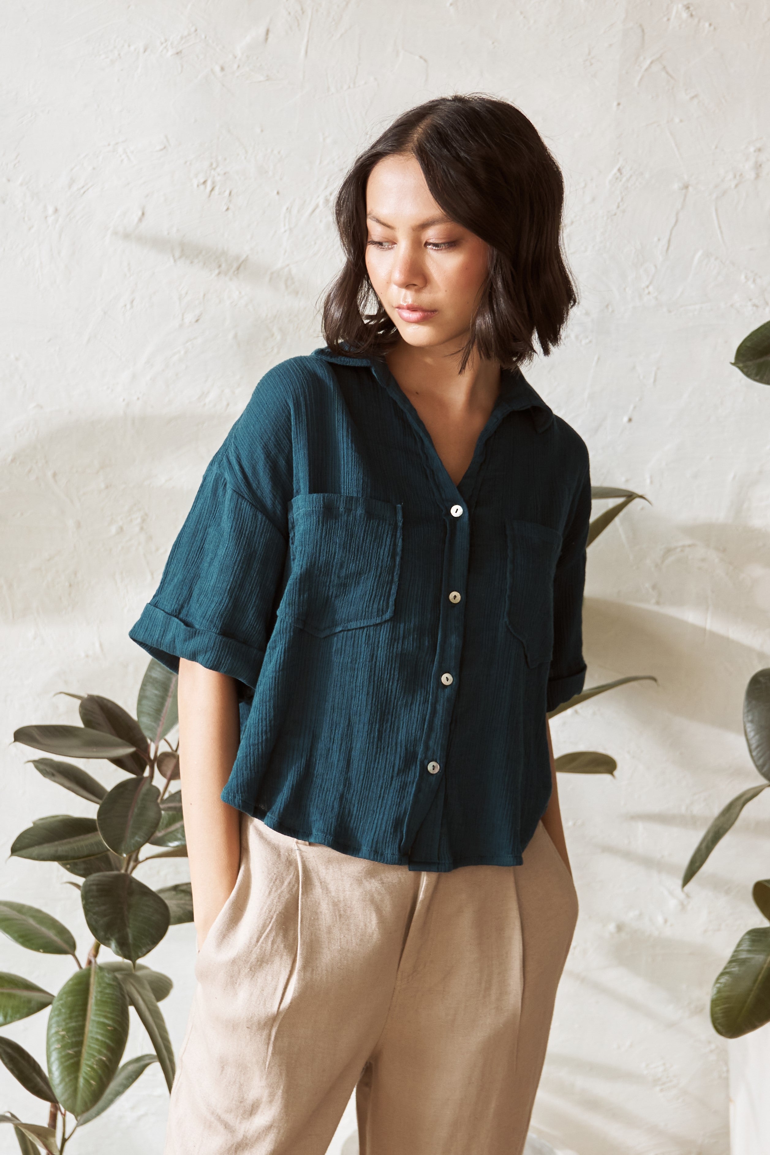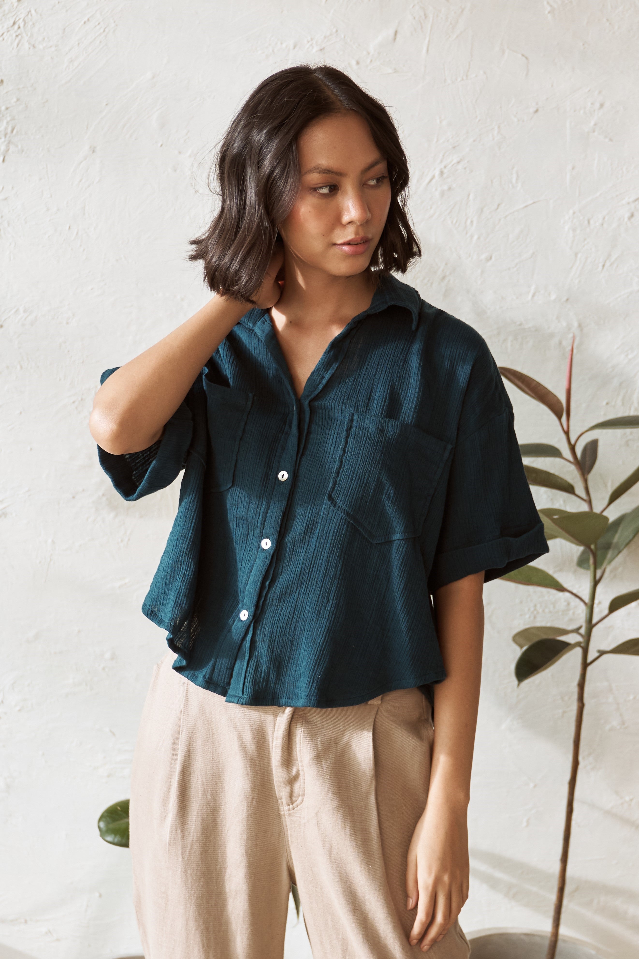 Imagine rocking this cool short crop shirt in your everyday wear! It's got these neat pockets in the front. You can pair it with shorts or any pants you like, giving you tons of options to mix and match. This shirt is just what you need for everyday. The crop shirt is going to be a staple stay in your wardrobe.