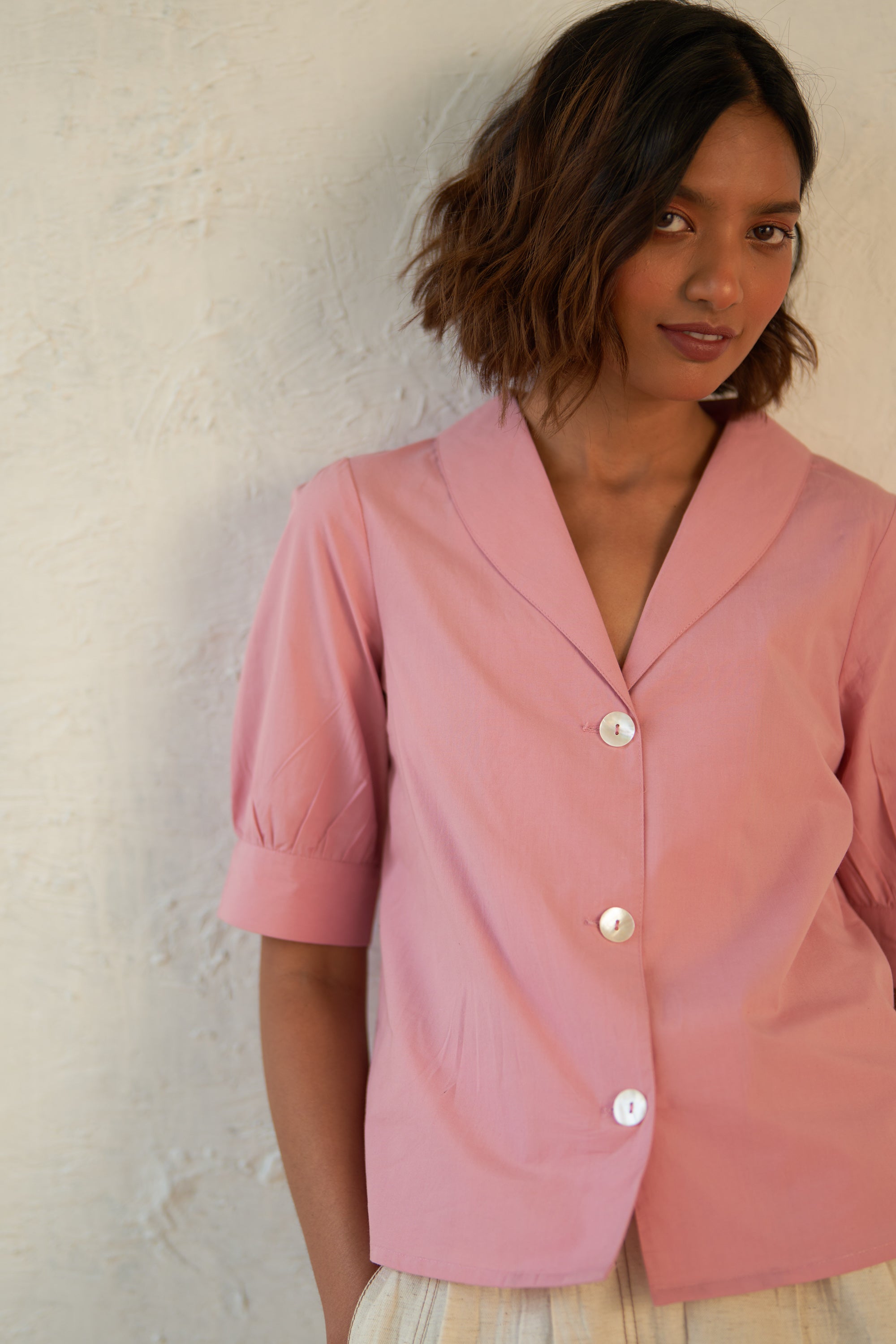 Canoopi's Blush-tinted top is a wardrobe staple with its timeless appeal. This puffed sleeve shirt is crafted from premium cotton slub fabric and designed with a captivating curved collar and a row of shell buttons.