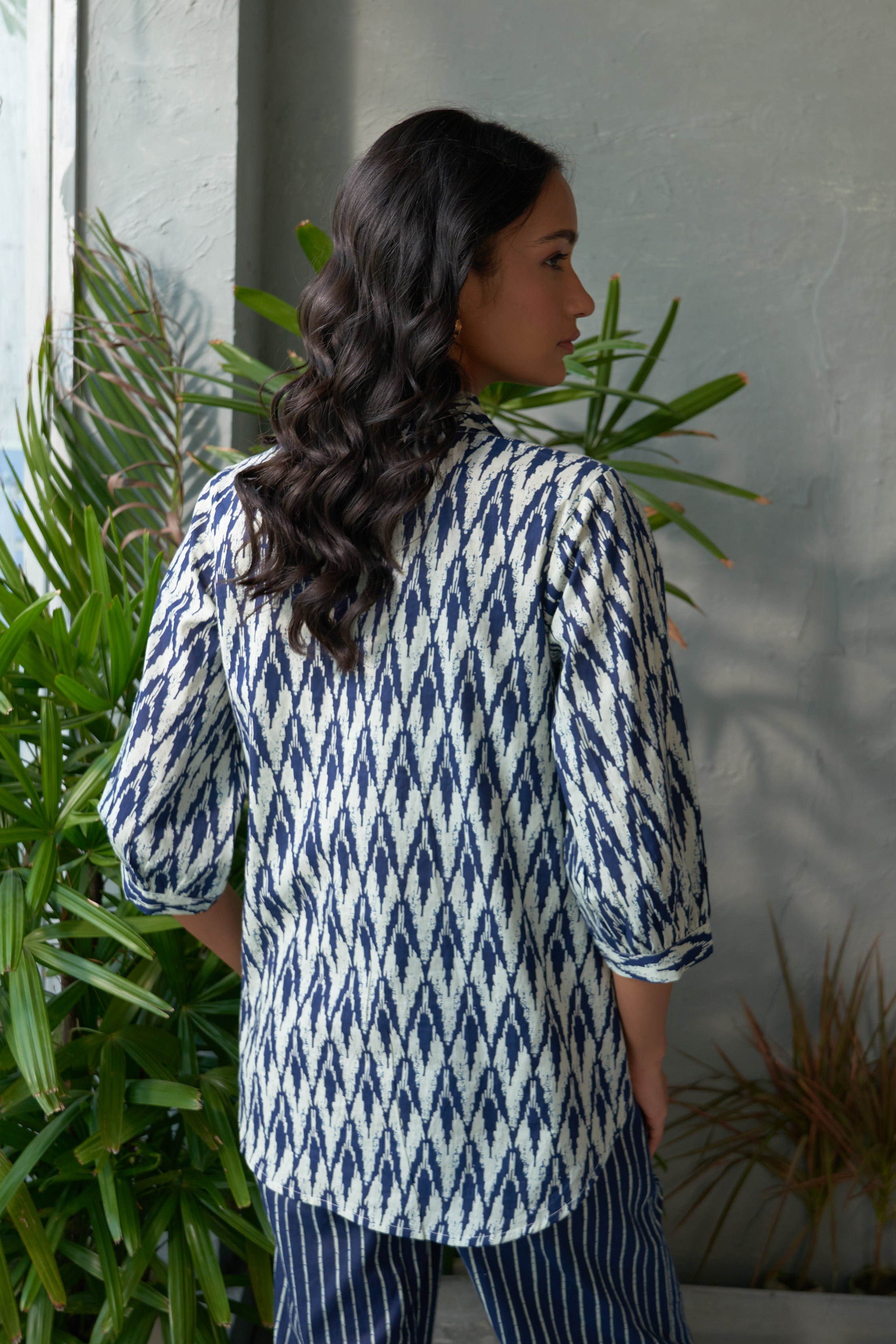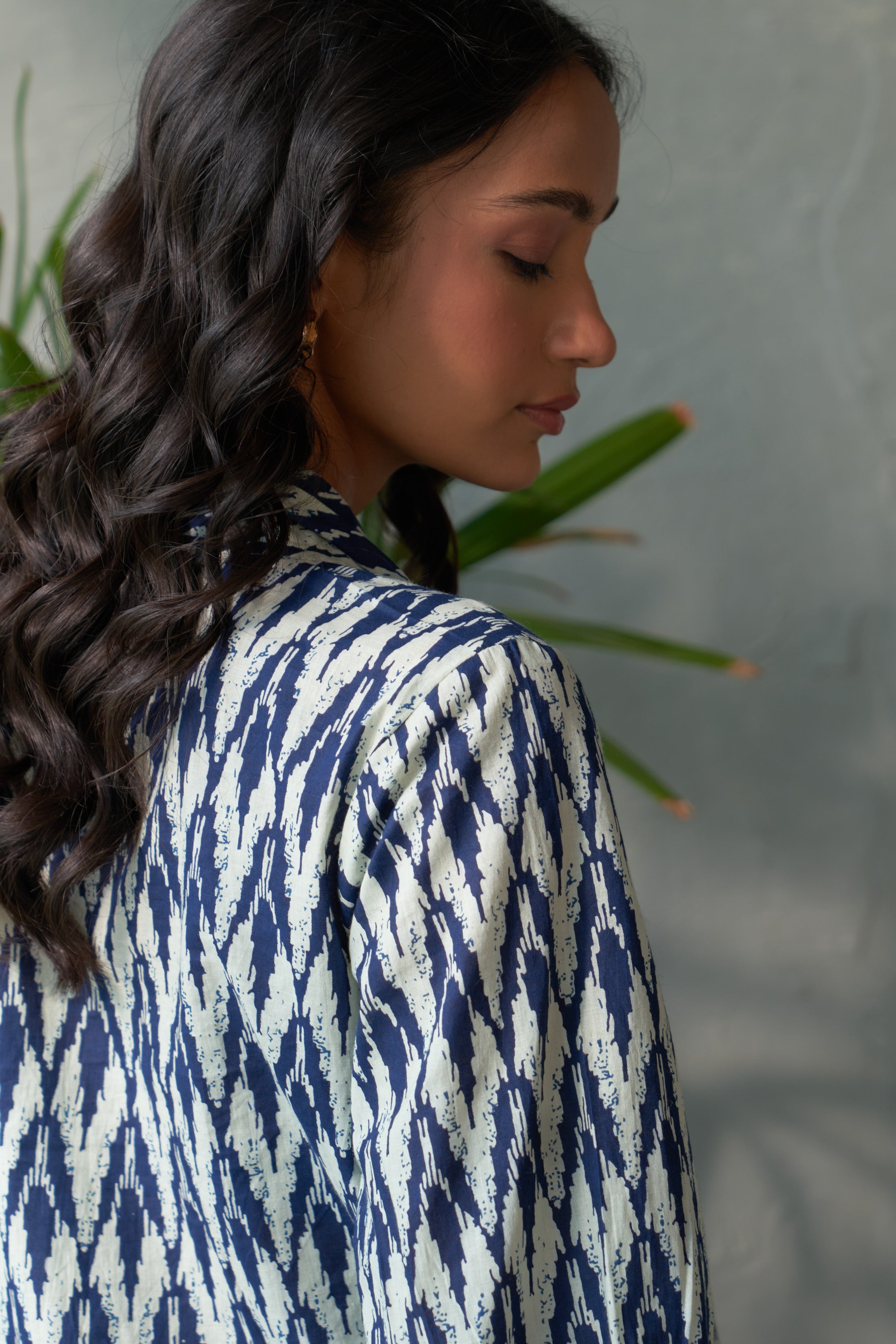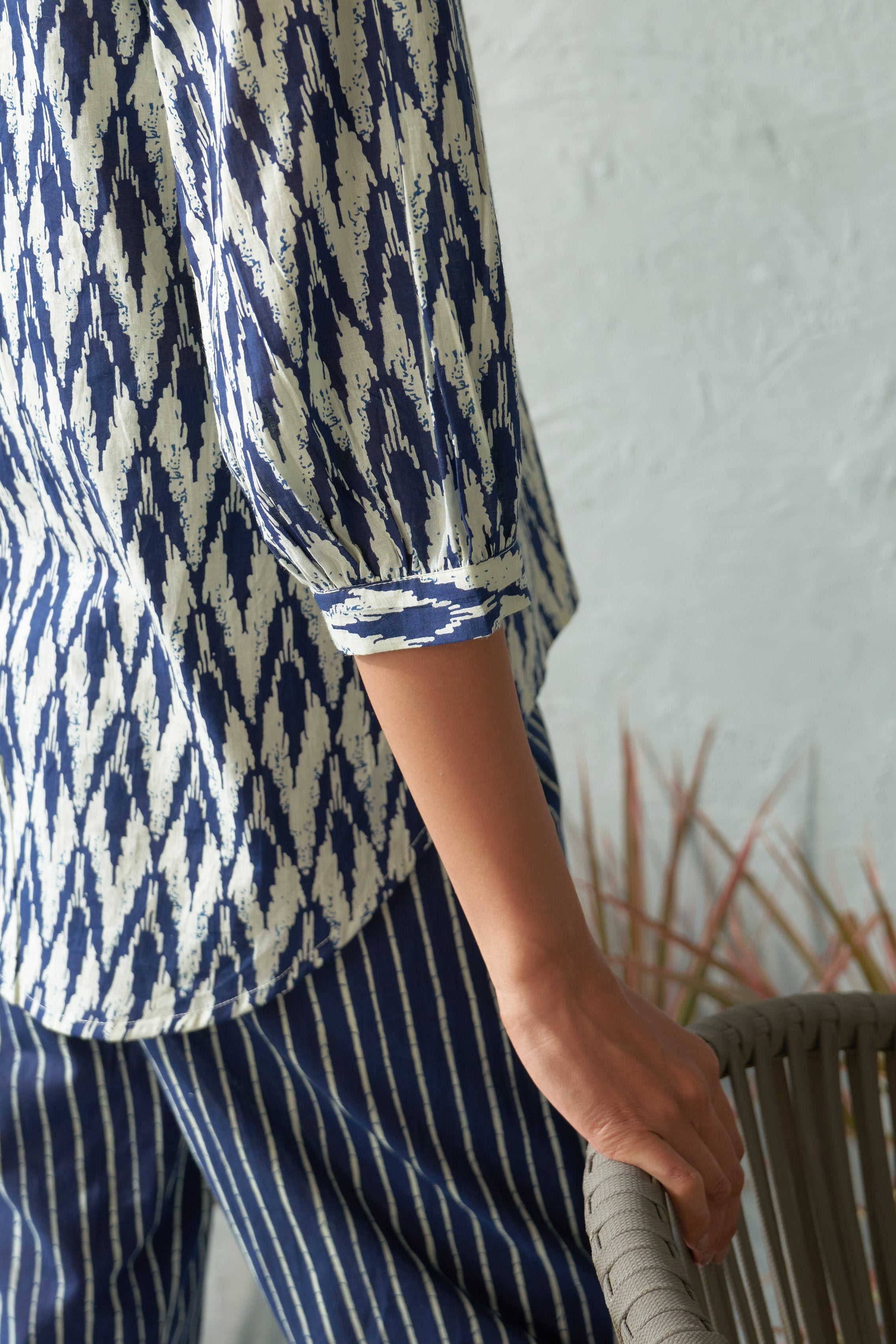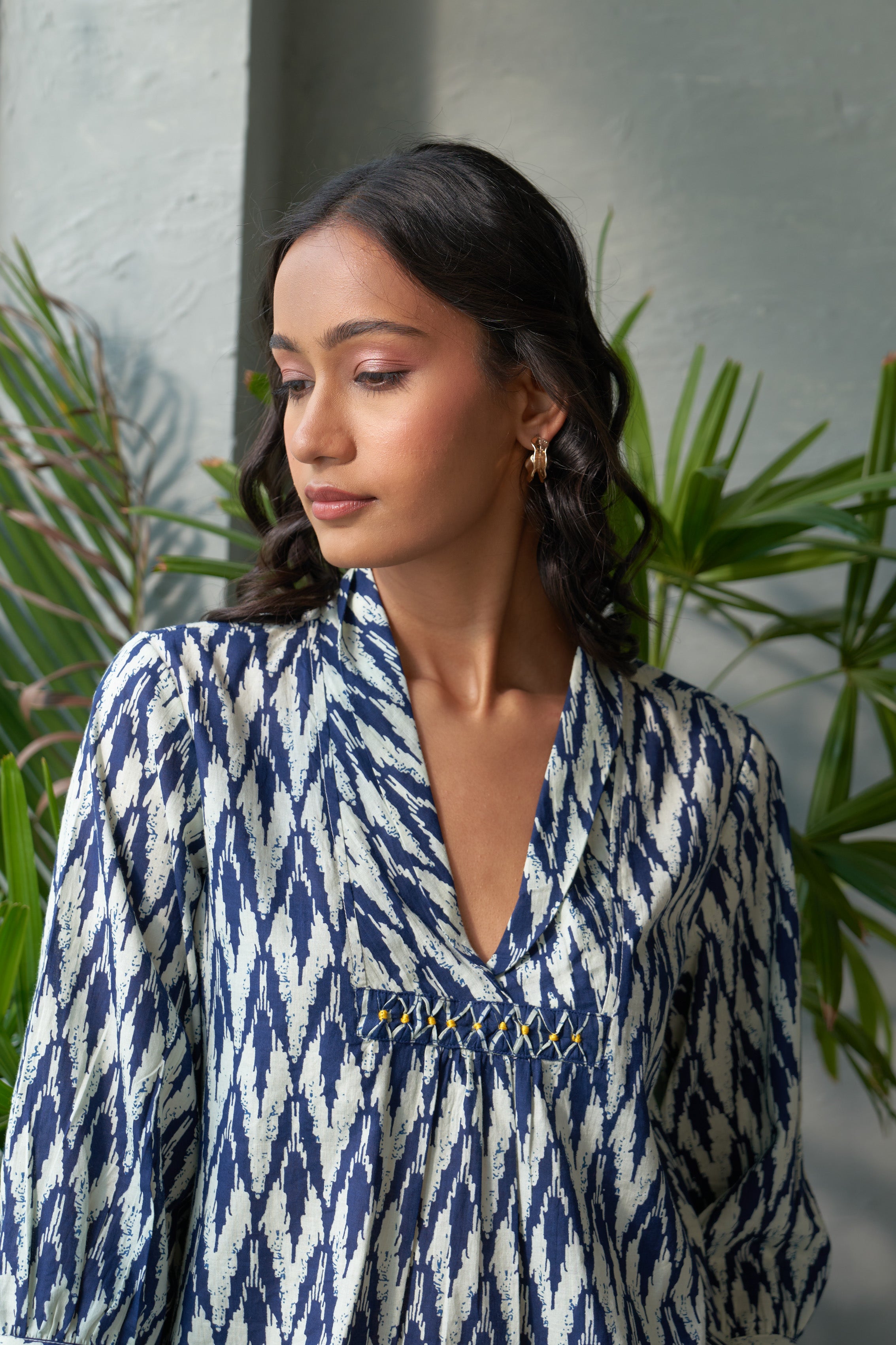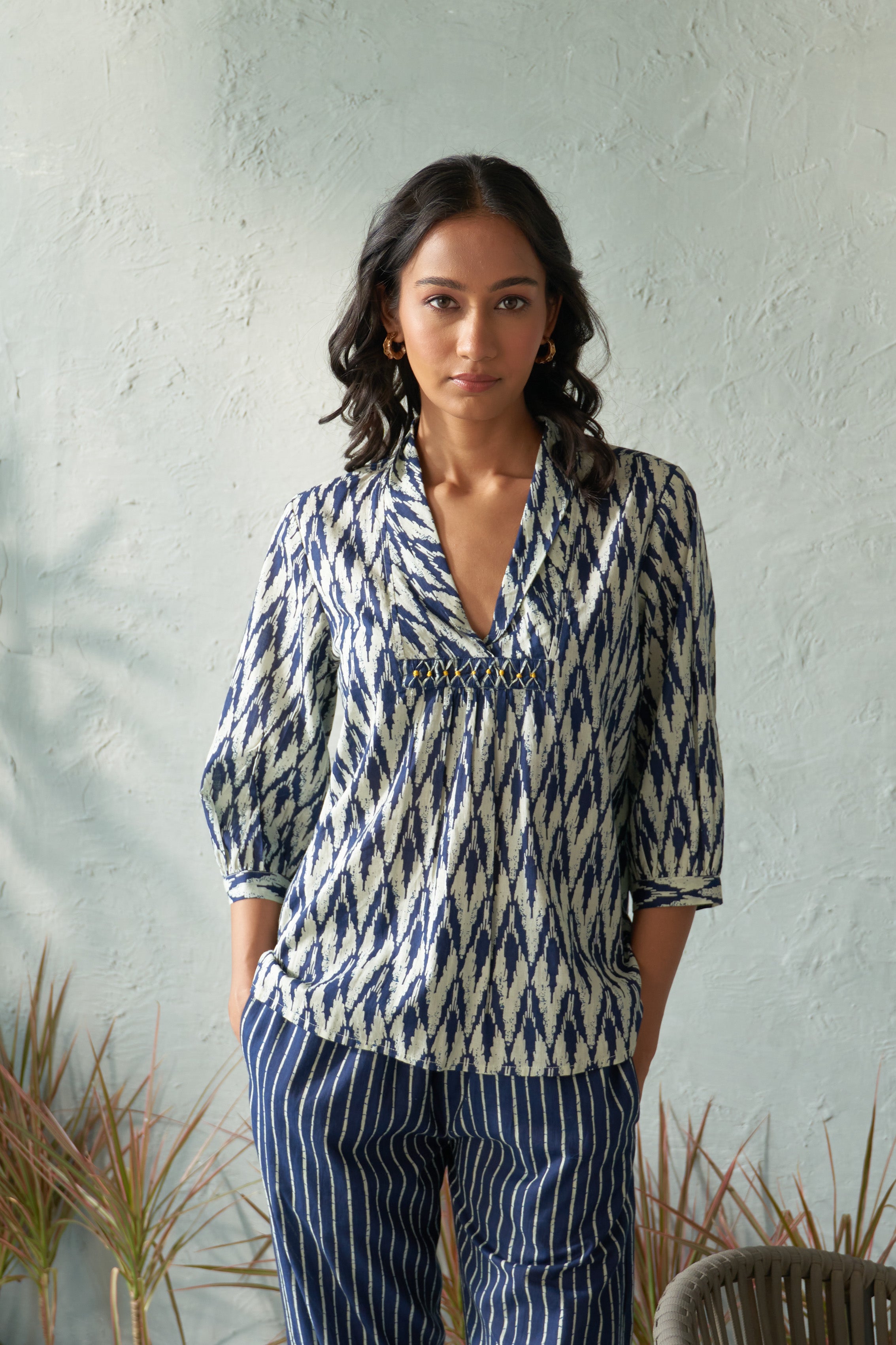 Effortlessly stylish and breathable, the Breeze Top is crafted from lightweight cotton with a soft blue screen print that adds a touch of artisanal charm. Featuring a flattering V-neckline, delicate smocking at the front, and 3/4th sleeves, this mid-length blouse offers a relaxed yet structured fit. Perfect for warm days, casual outings, or layering up in transitional weather, this top pairs beautifully with jeans, skirts, or flowy trousers. Stay cool, stylish, and comfortable all day long!
