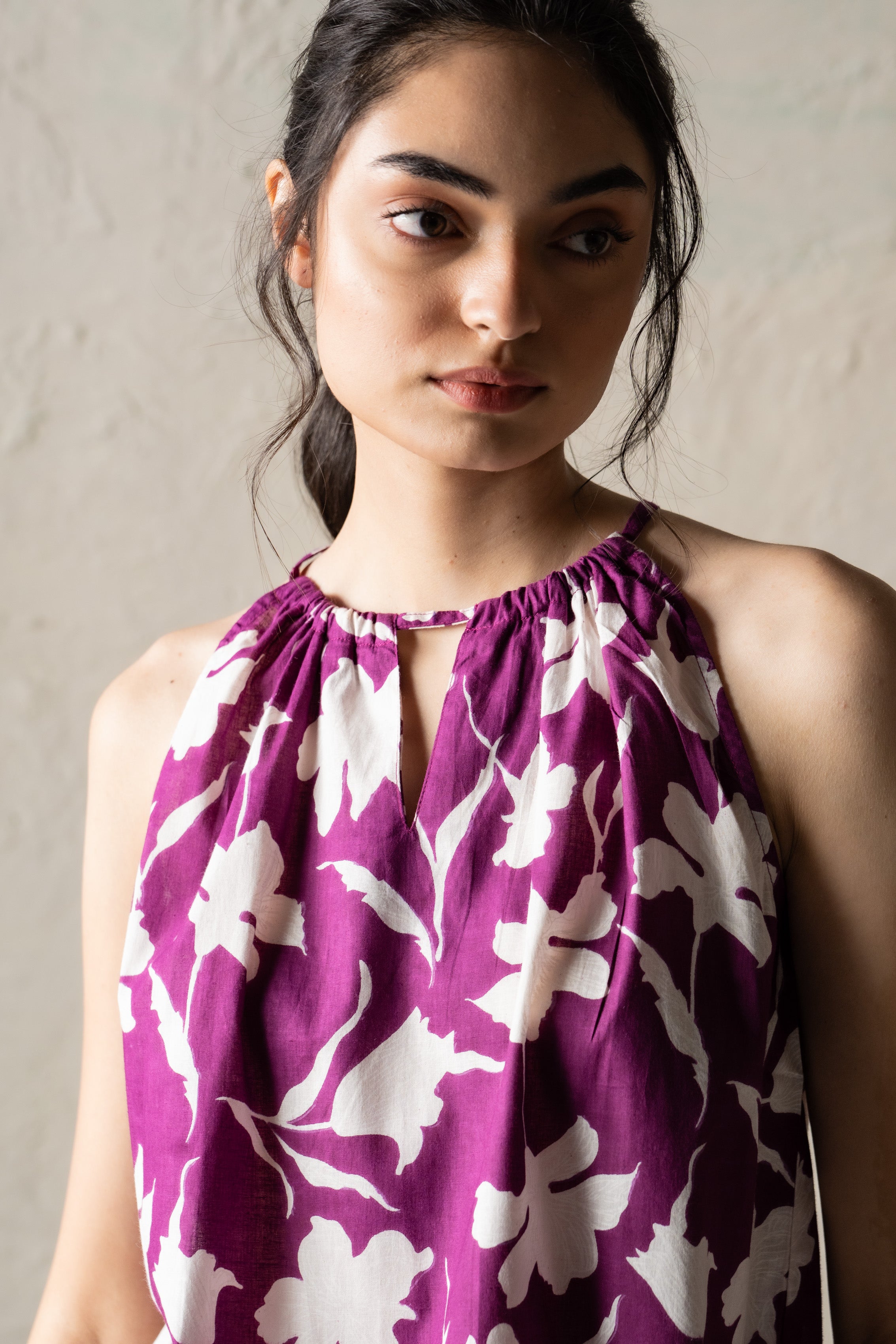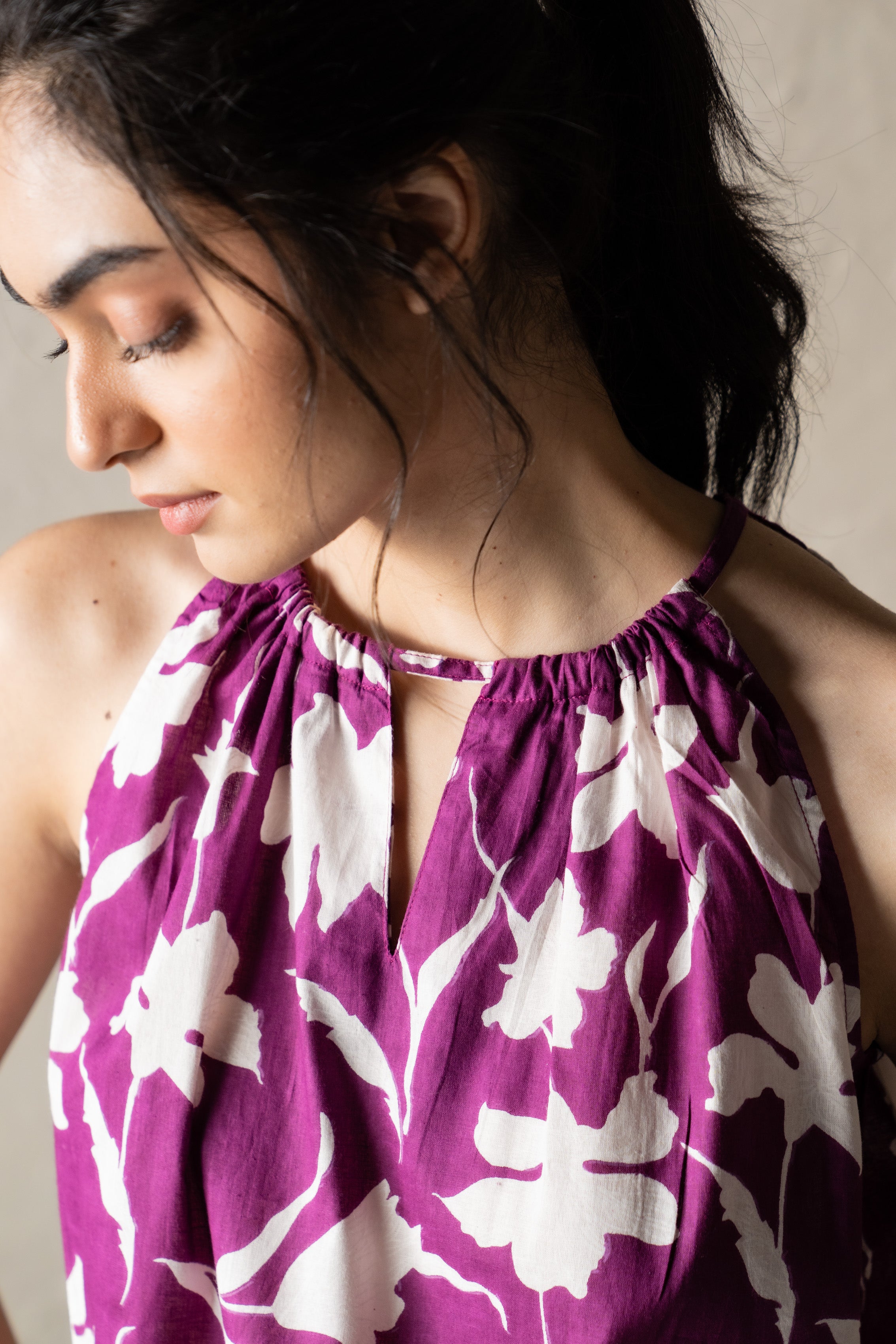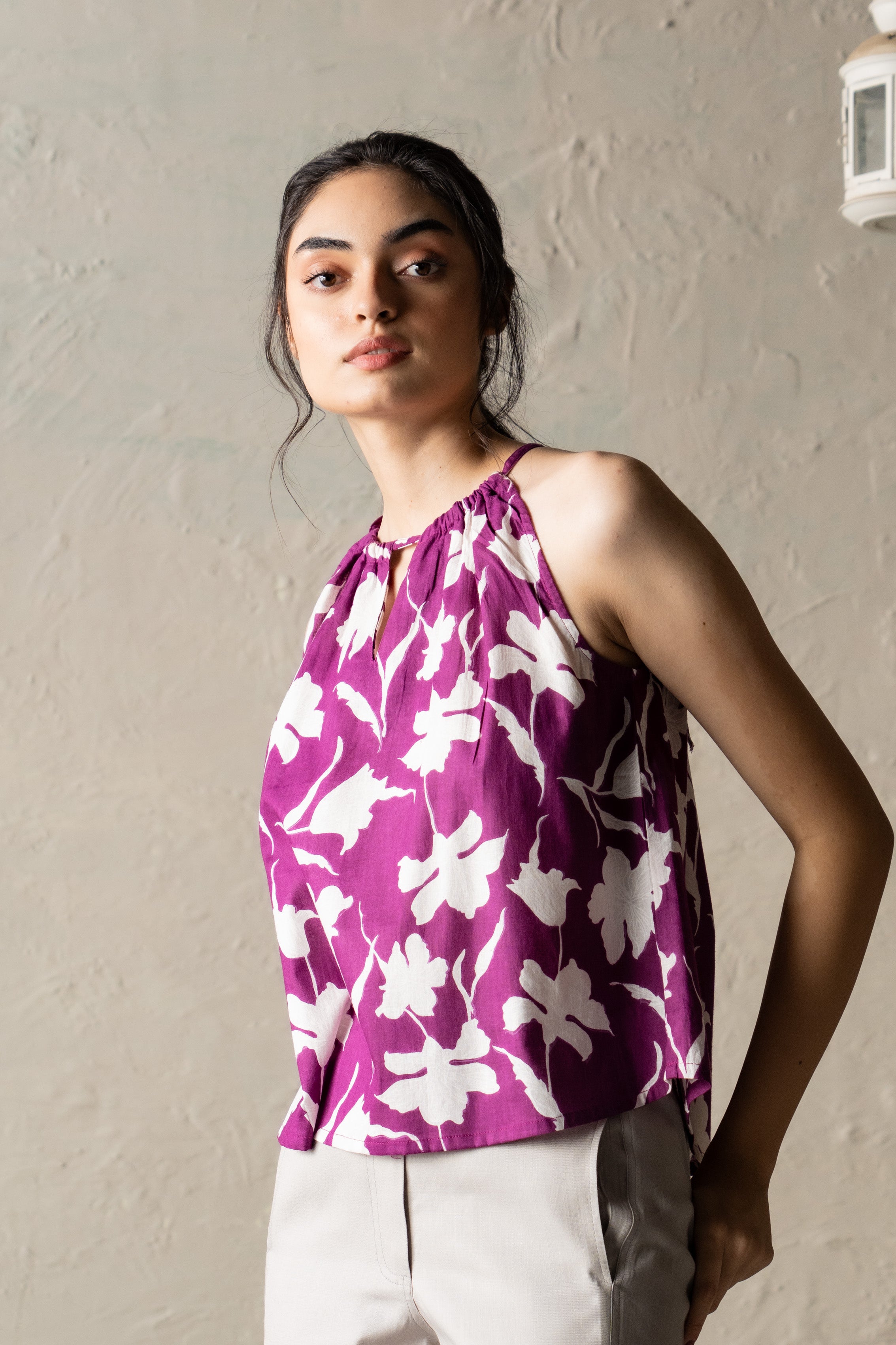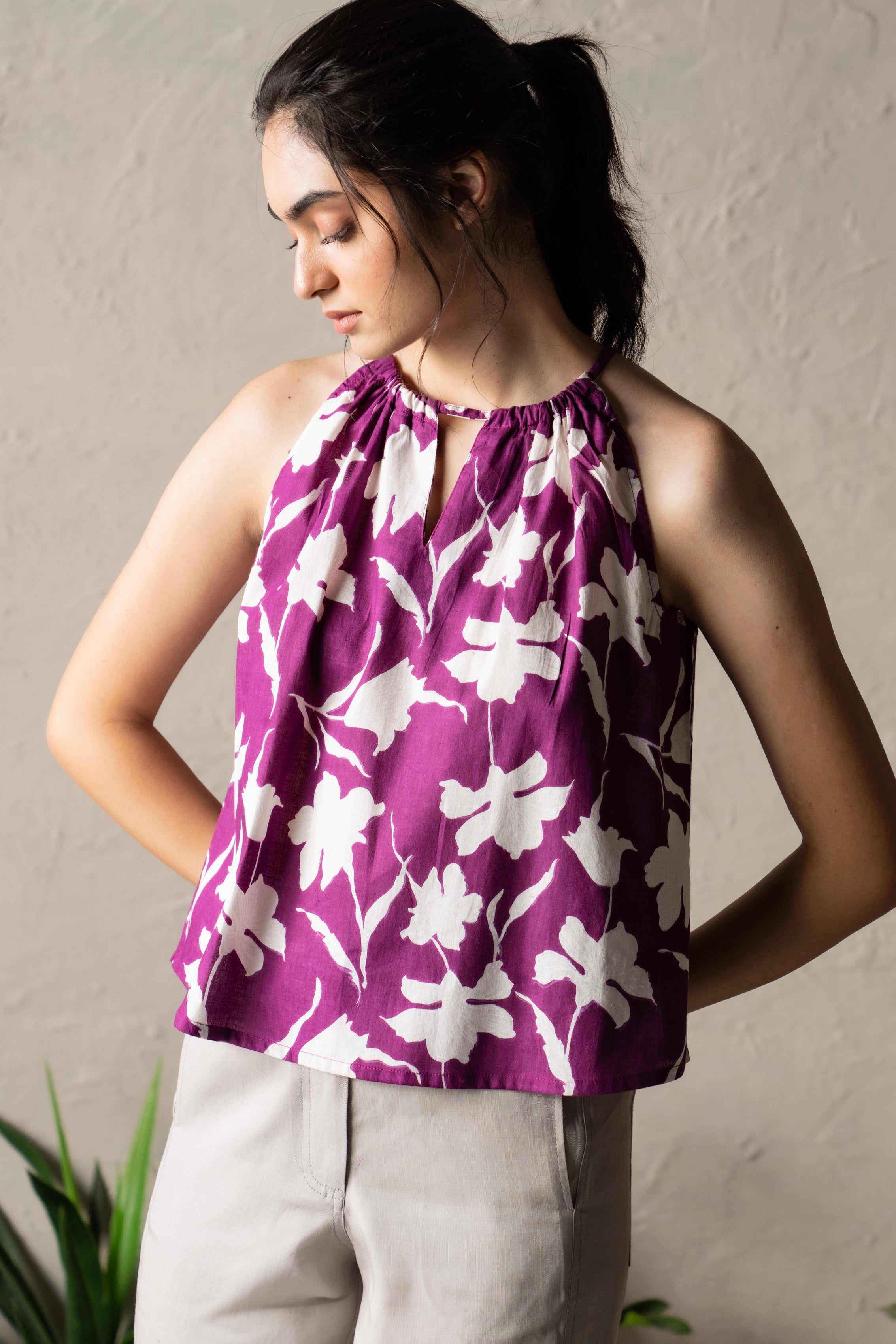 Channel the serene beauty of nature with the Corner Bloom Top. Featuring a halter-neck design and crafted from crisp, soft cotton, this top showcases a leafy shadow print in a charming orchid hue. The tie-up neckline adds a touch of elegance, while its cropped length pairs effortlessly with high-waisted bottoms. Perfect for sunny outings and casual adventures, this top is a must-have for your seasonal wardrobe.