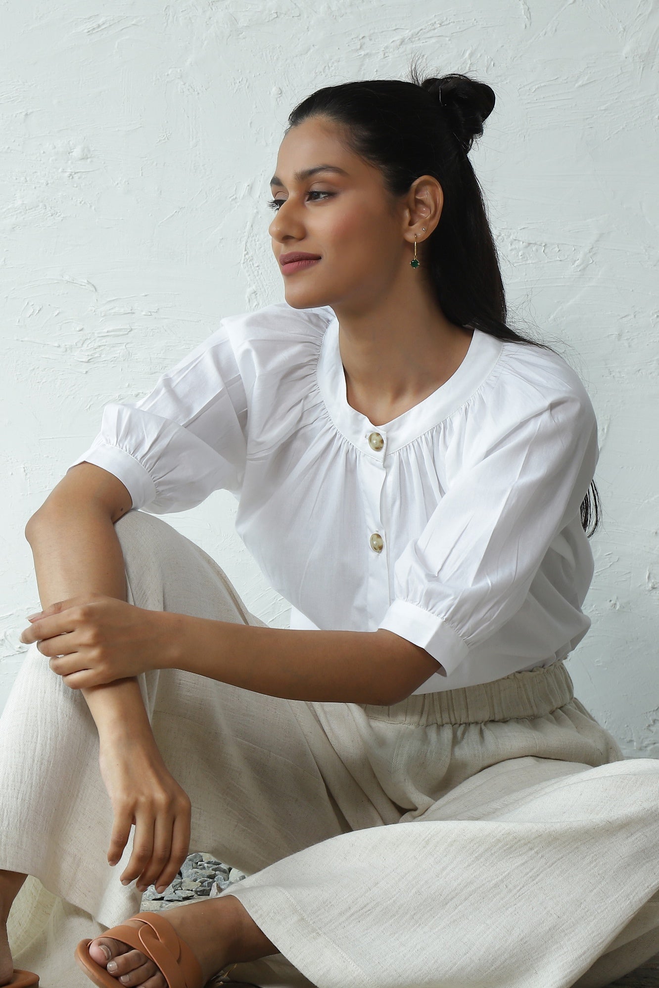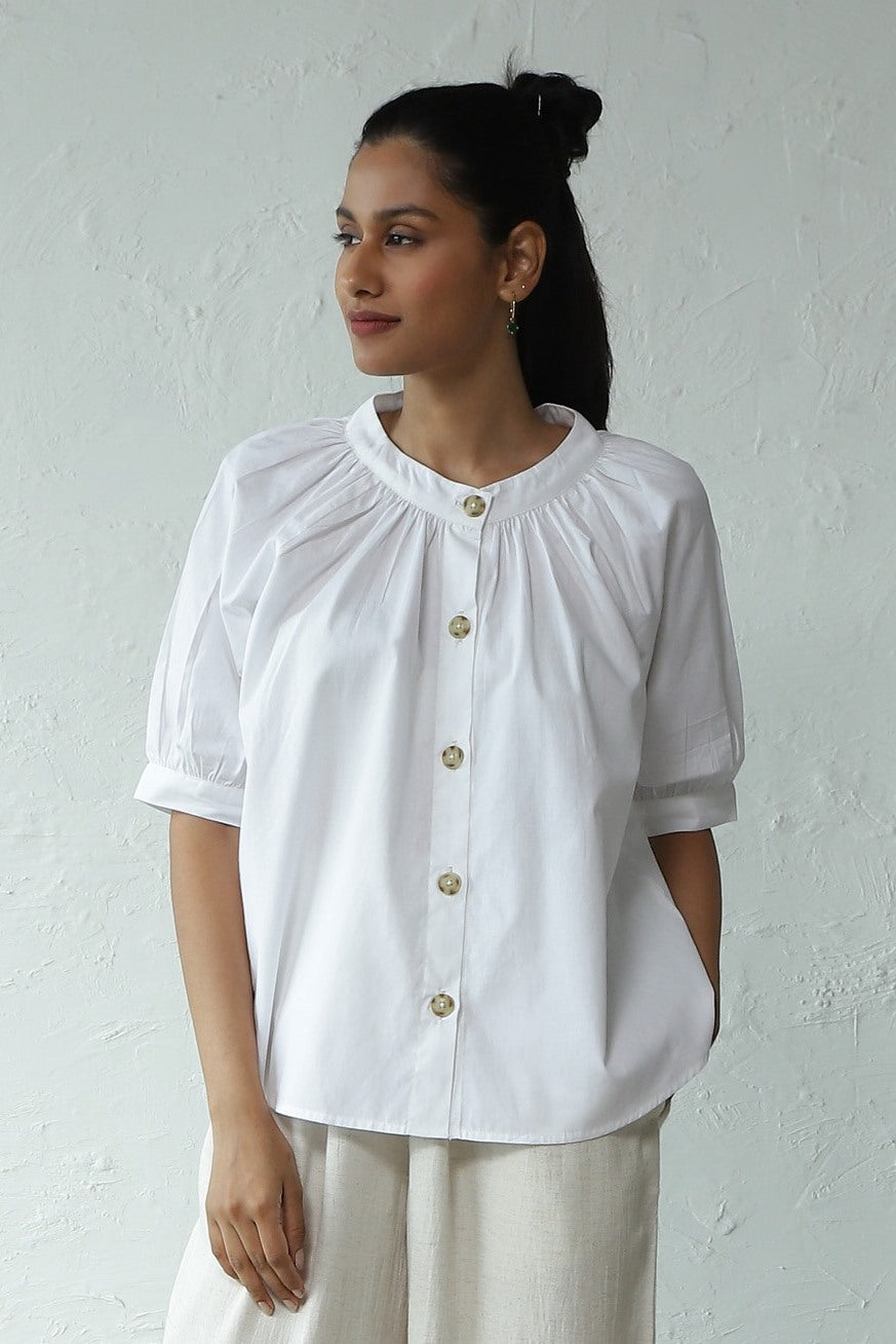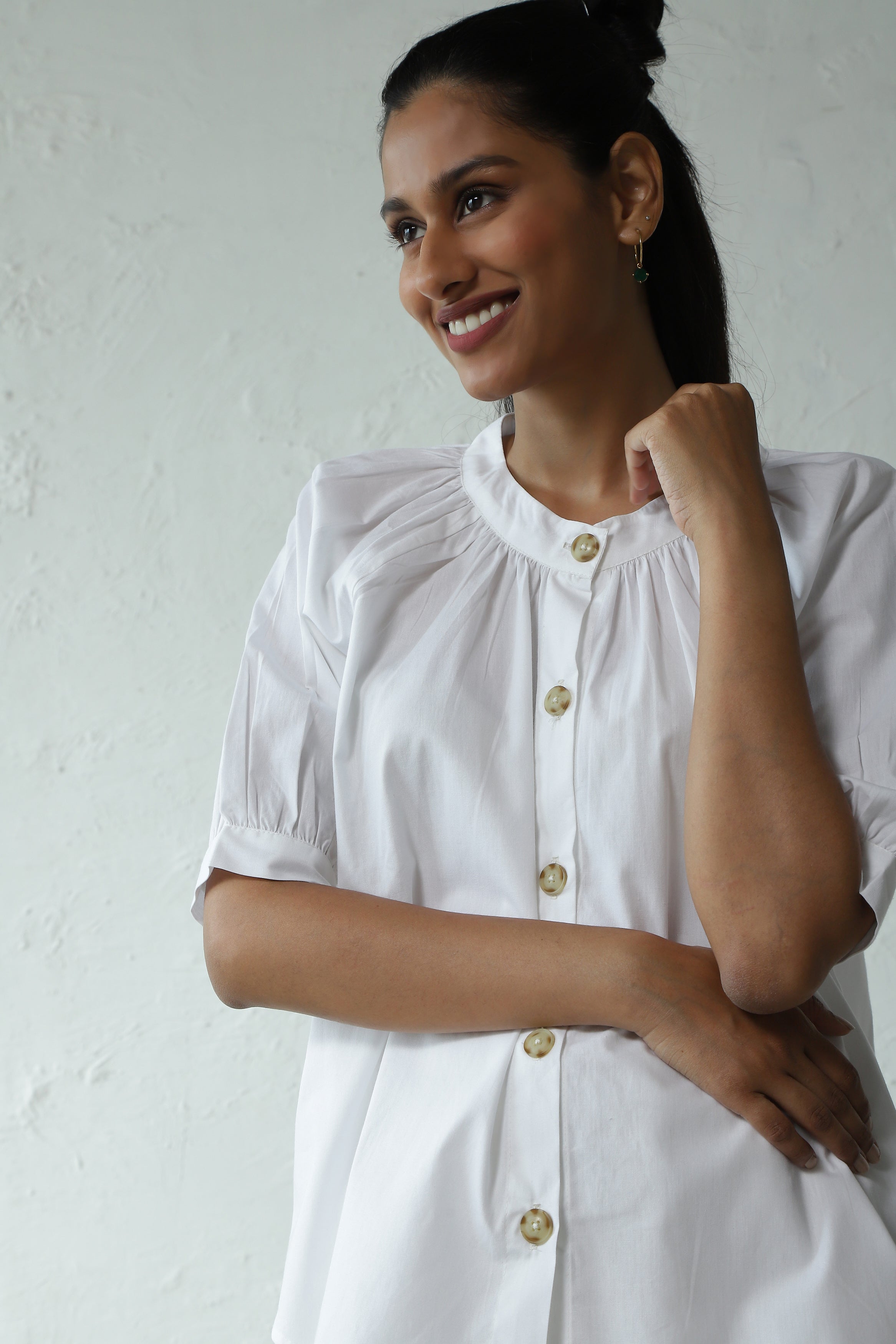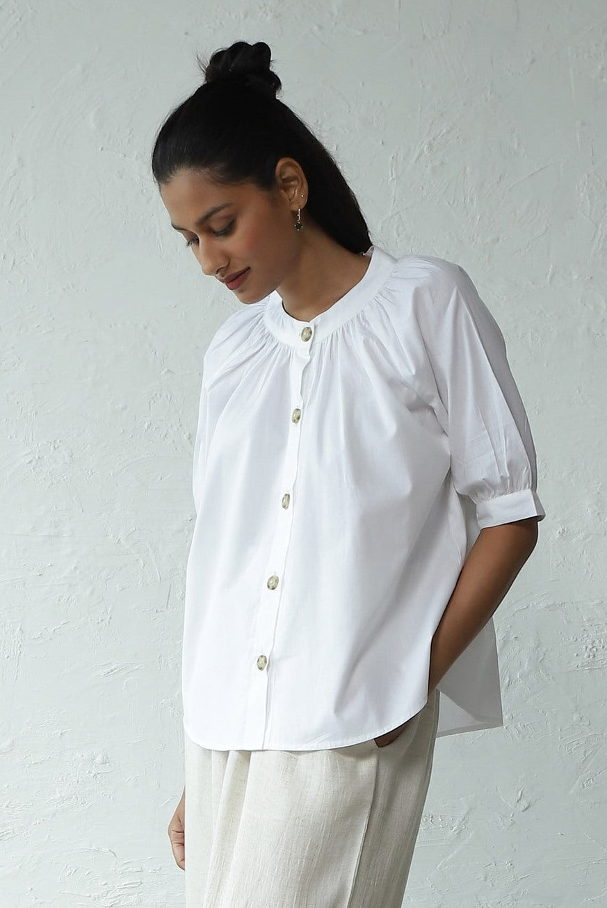 Elevate your wardrobe with this elegantly crafted piece. Made from crisp cotton poplin, it boasts a breezy silhouette accentuated by gentle gathers around the neckline. The front placket, adorned with marble pattern buttons, enhances versatility, allowing it to be styled as an open shirt as well.