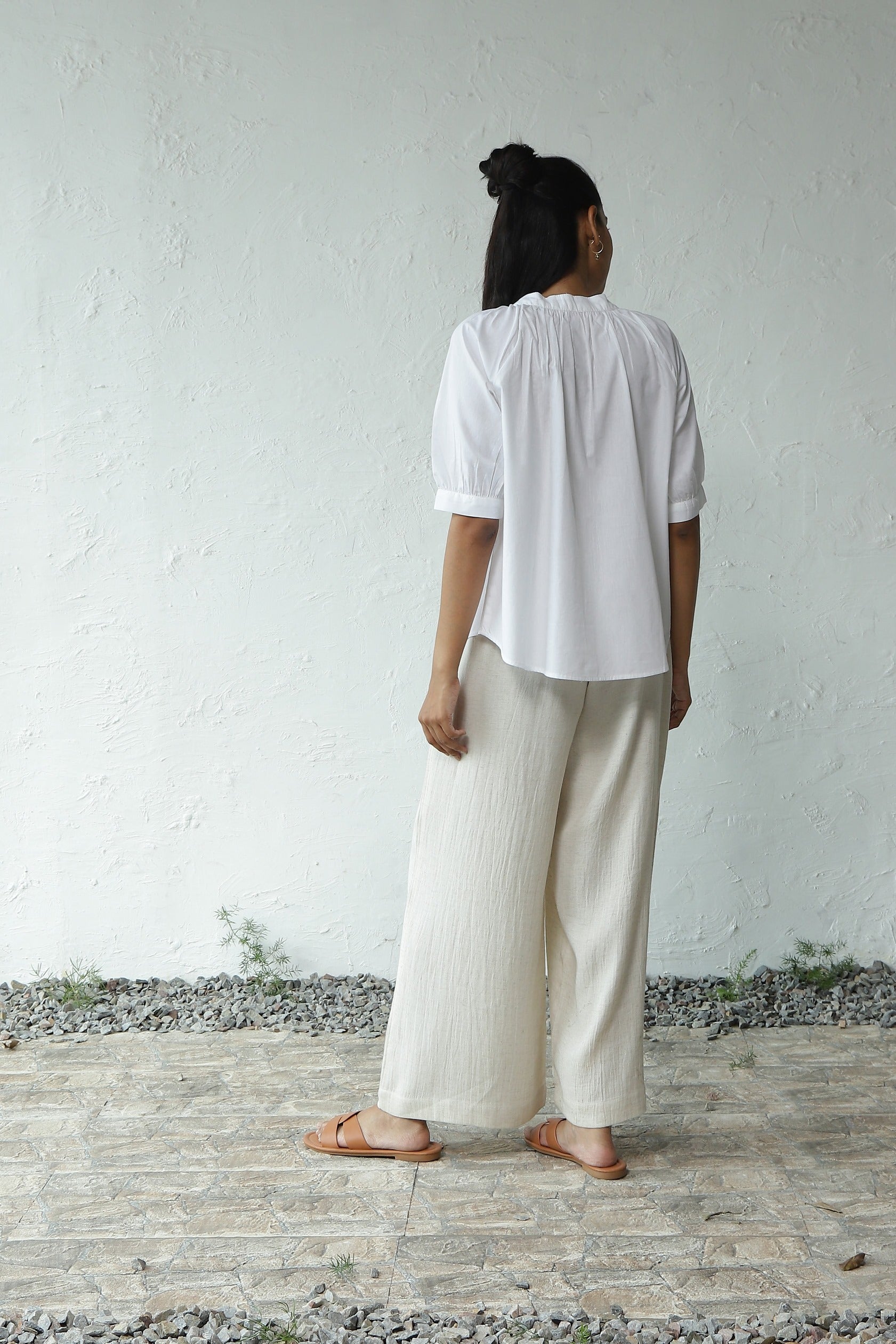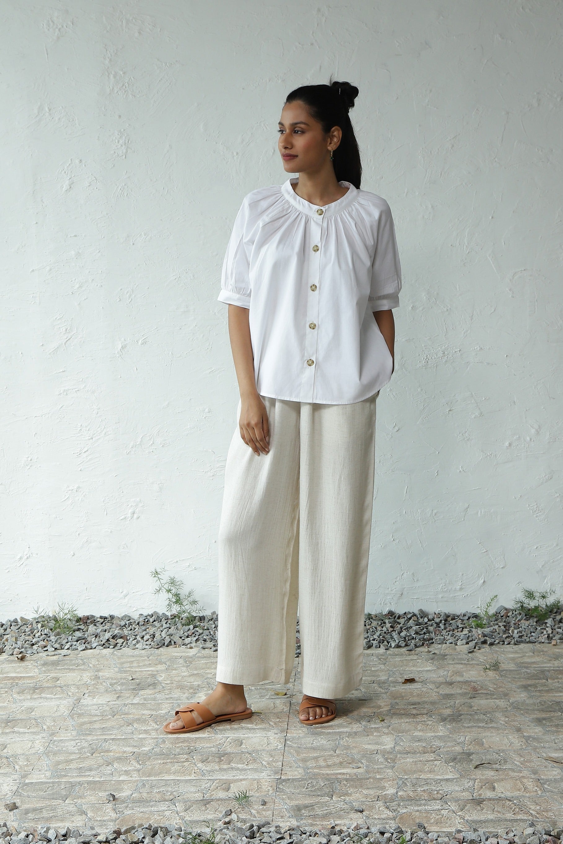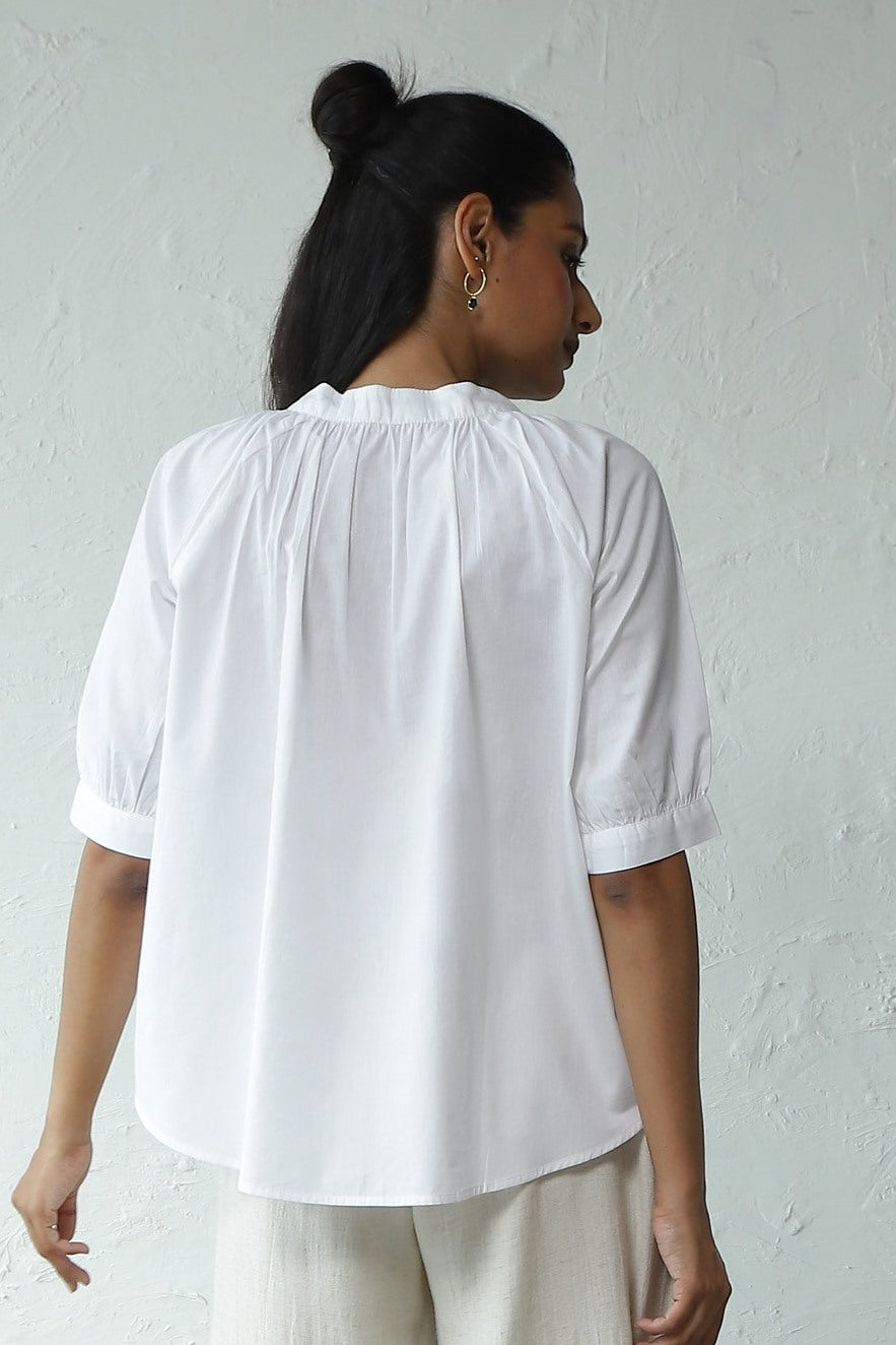Elevate your wardrobe with this elegantly crafted piece. Made from crisp cotton poplin, it boasts a breezy silhouette accentuated by gentle gathers around the neckline. The front placket, adorned with marble pattern buttons, enhances versatility, allowing it to be styled as an open shirt as well.