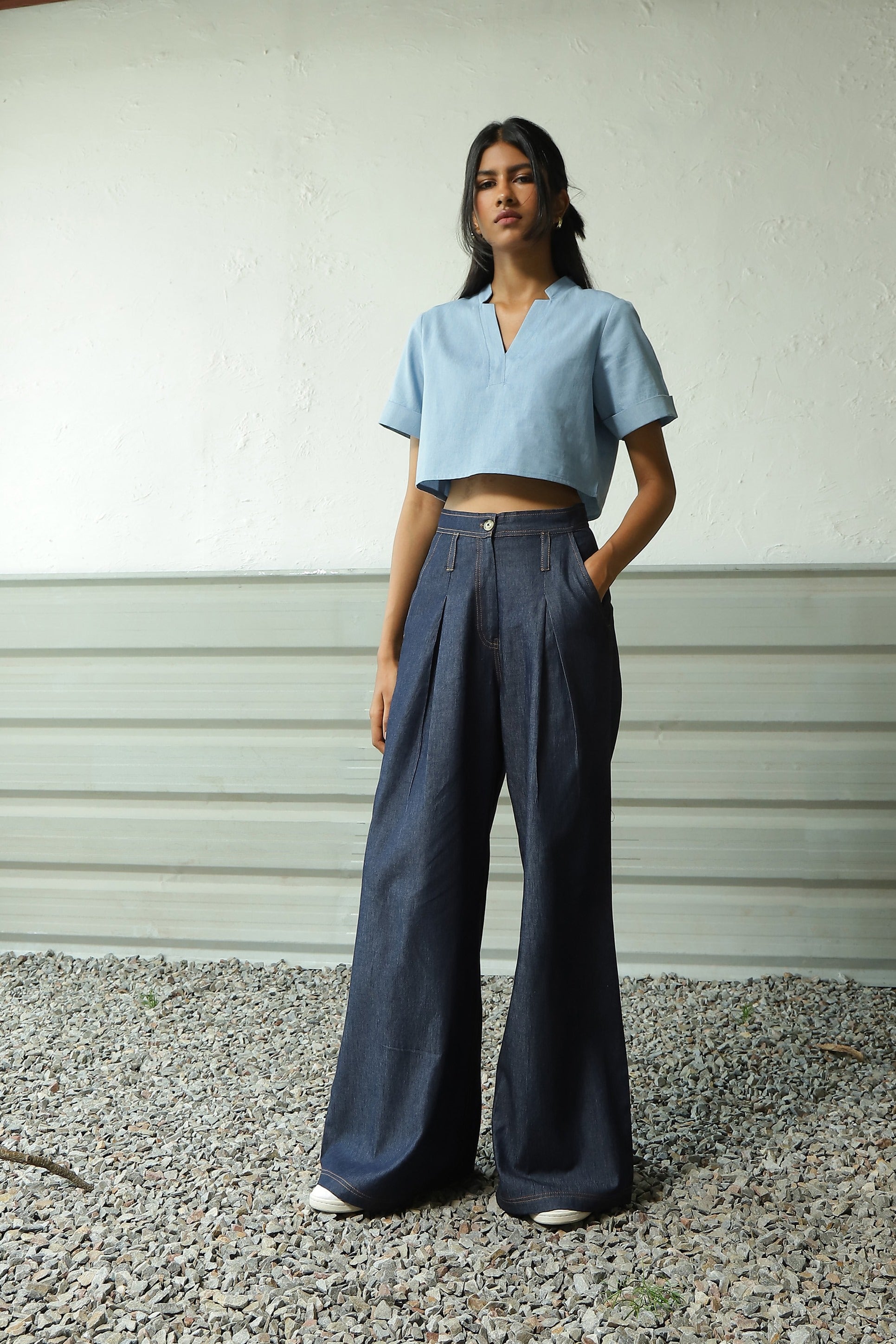 Wardrobe Must Have! Denim crop top is a versatile garment piece that combines the classic appeal of denim with the contemporary style of a crop top. The cotton denim fabric gives the crop top a casual and effortlessly cool vibe. It features a stylish V-neck and flowy short sleeves.