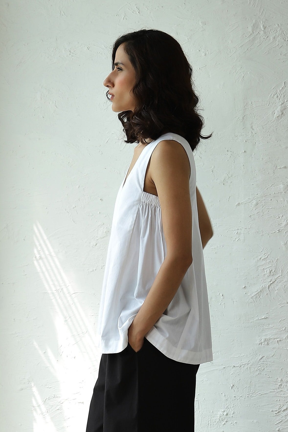 'Day-to-Night Elegance' White Sleeveless Top – Your Versatile Wardrobe Essential. Made from crisp cotton poplin, its breezy A-line silhouette features a flattering V-neckline, front inward pleat, and elasticated side panels for subtle gathering.