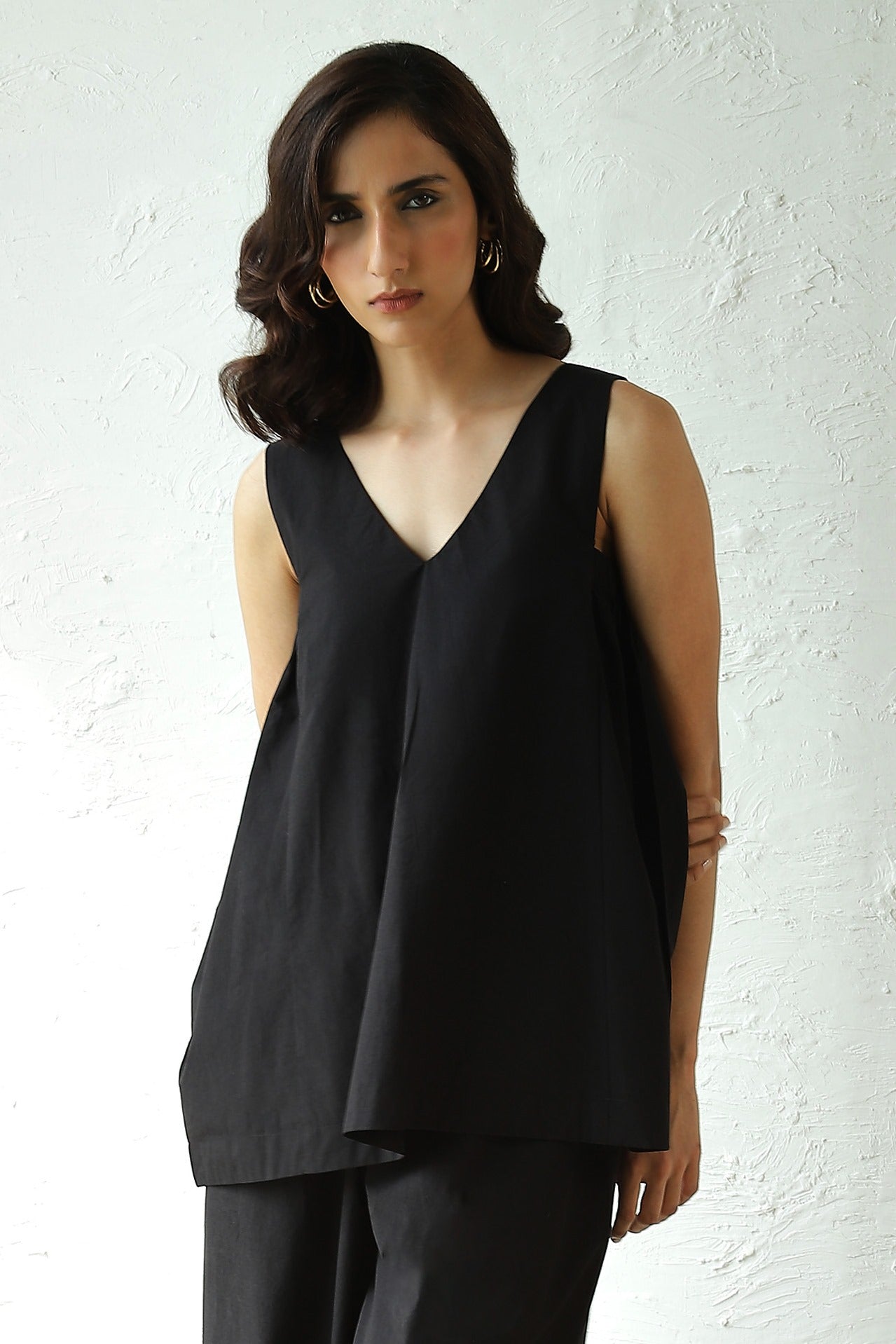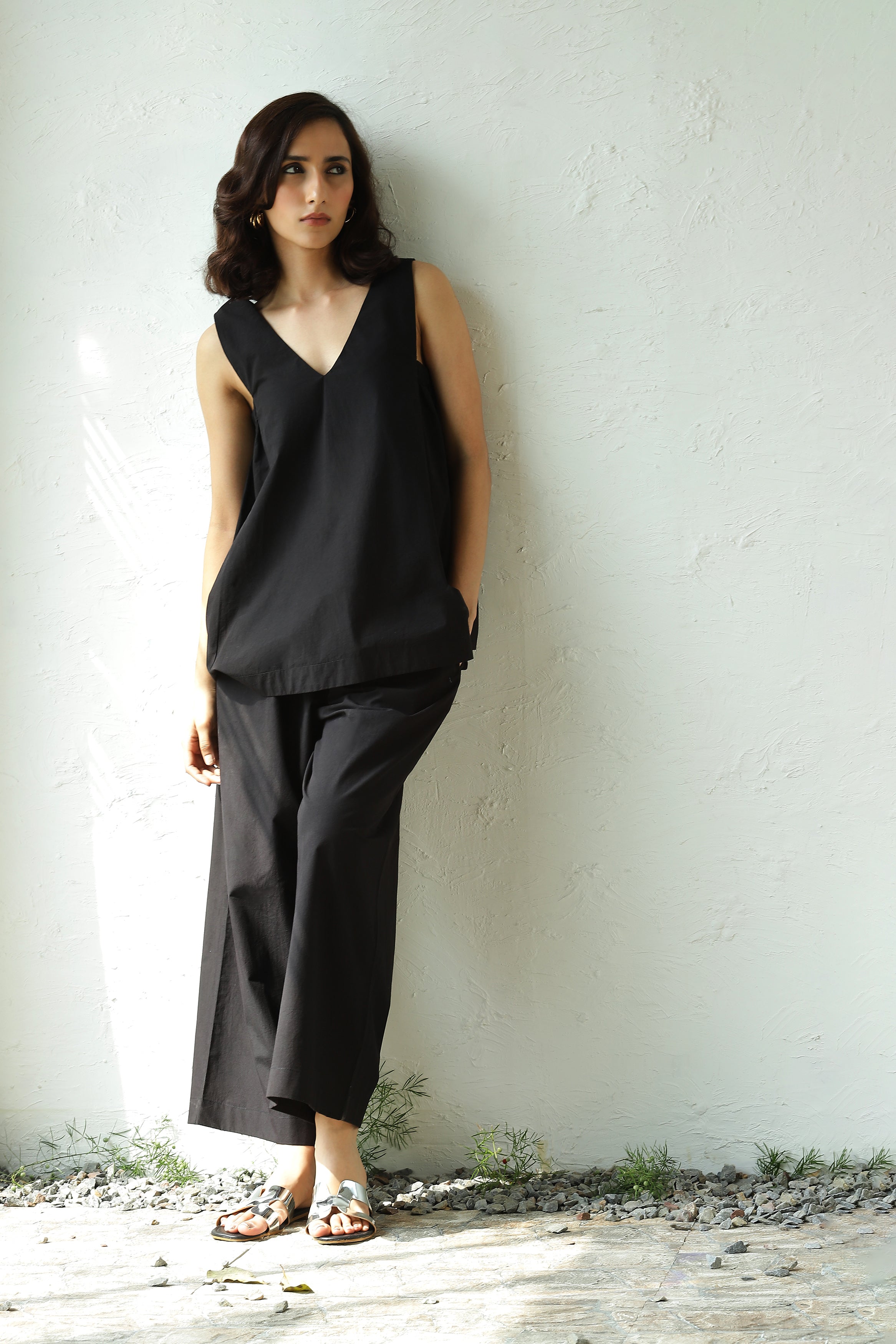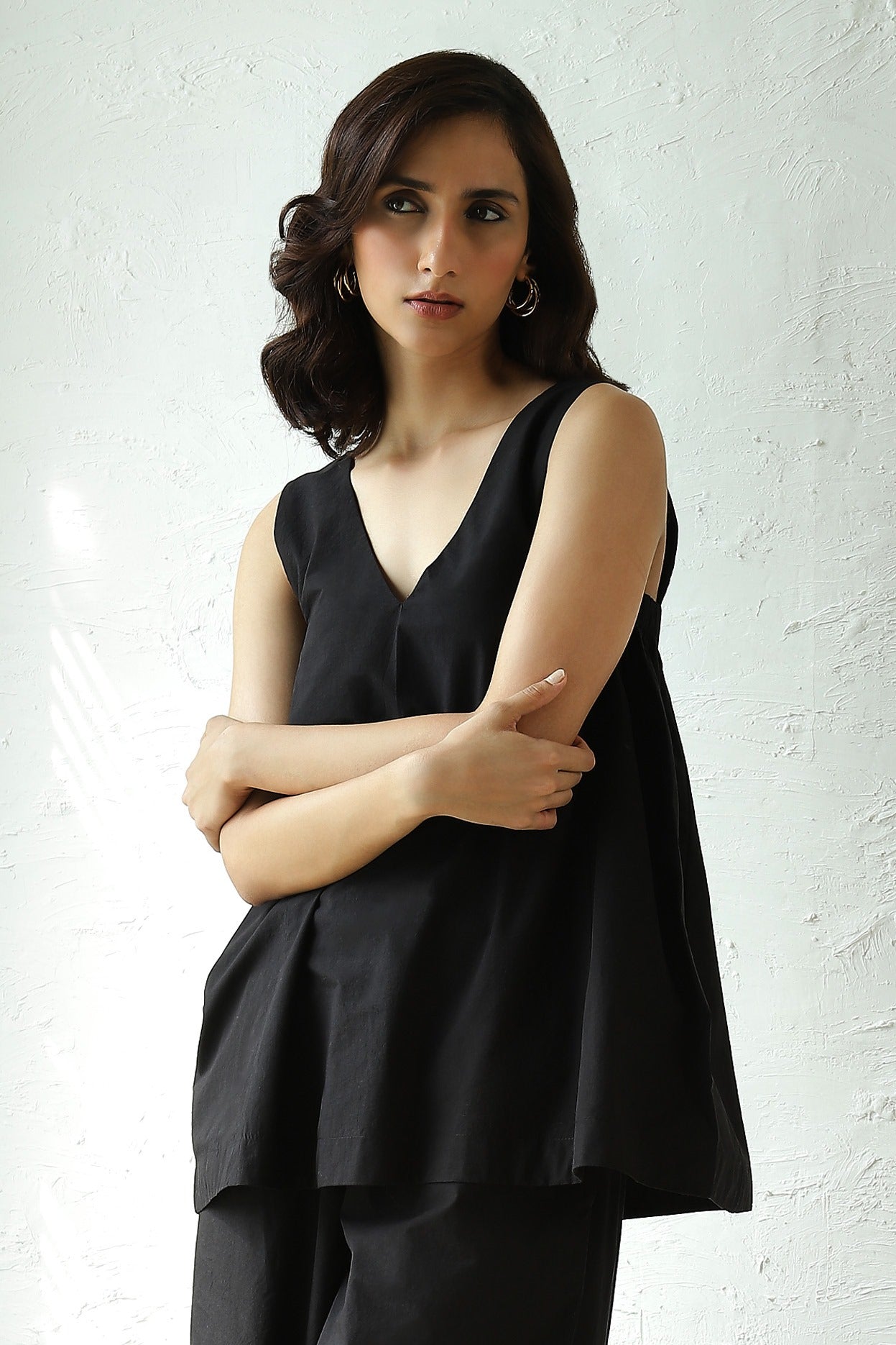 Step Out in Comfortable Elegance, in our 'EleganceShift' Black Sleeveless Top – Your Ultimate Day-to-Night Transition Piece. Expertly tailored from crisp cotton poplin, it boasts a graceful A-line silhouette with a captivating V-neckline. The front inward pleat and elasticated side panels create a soft gathering effect.