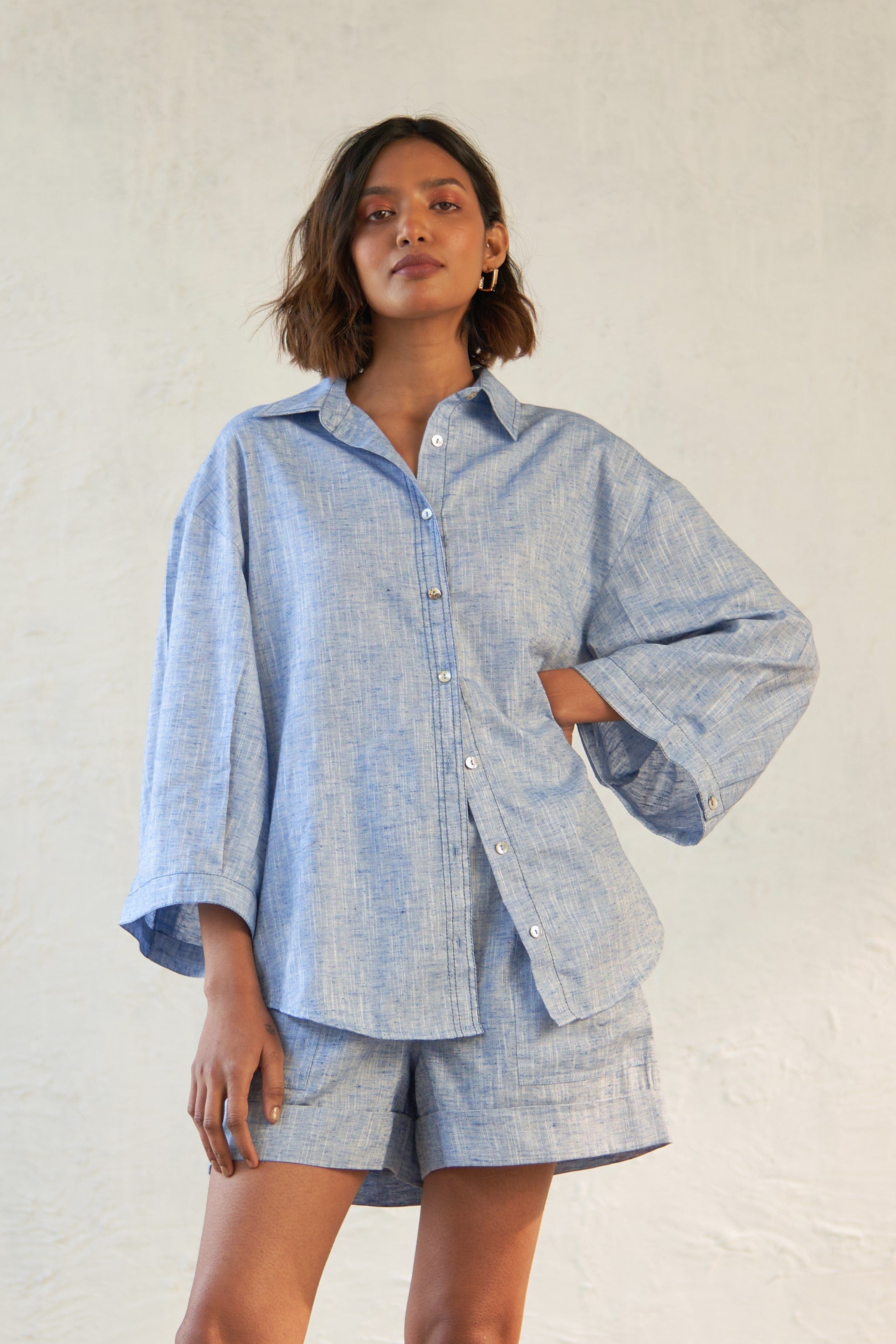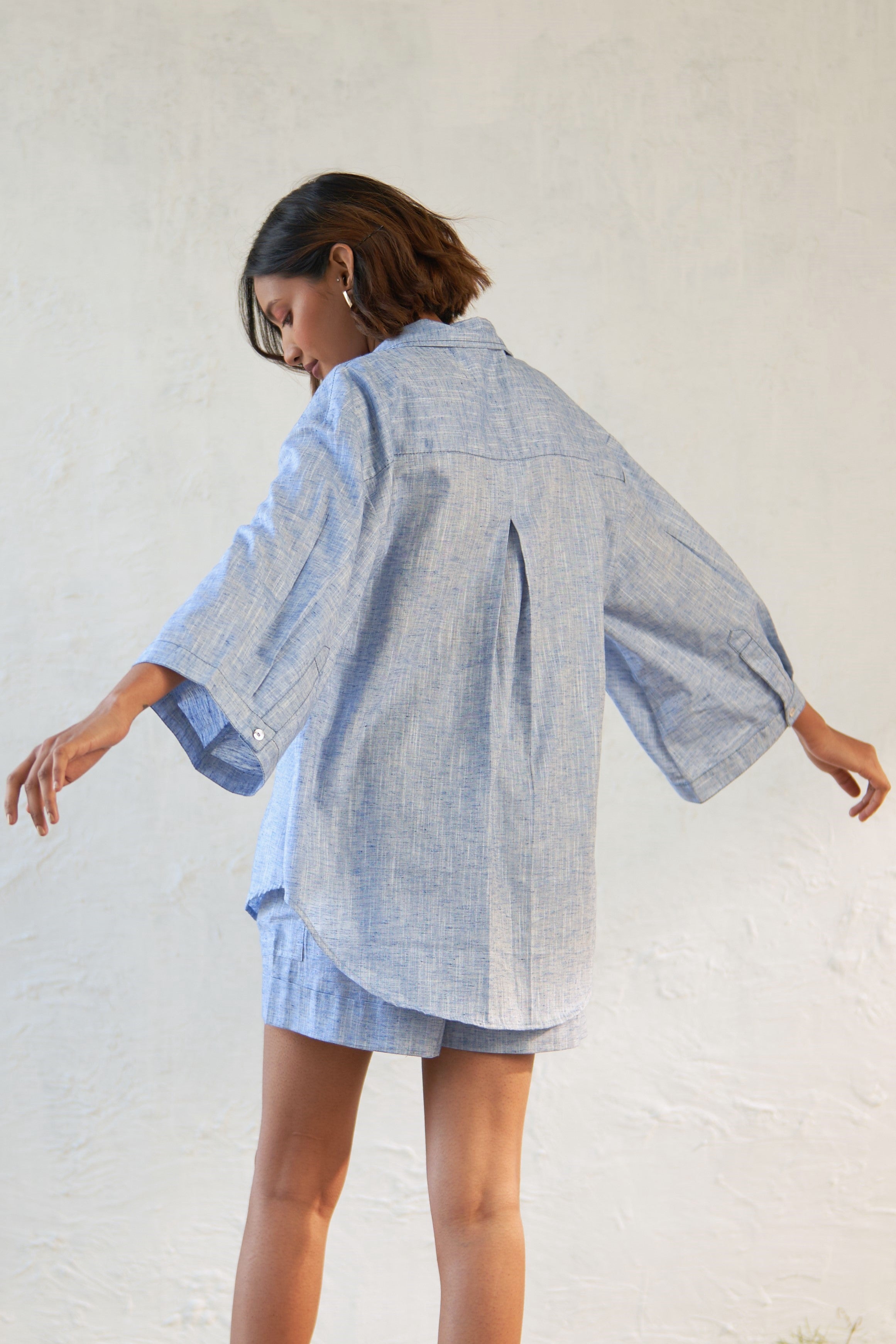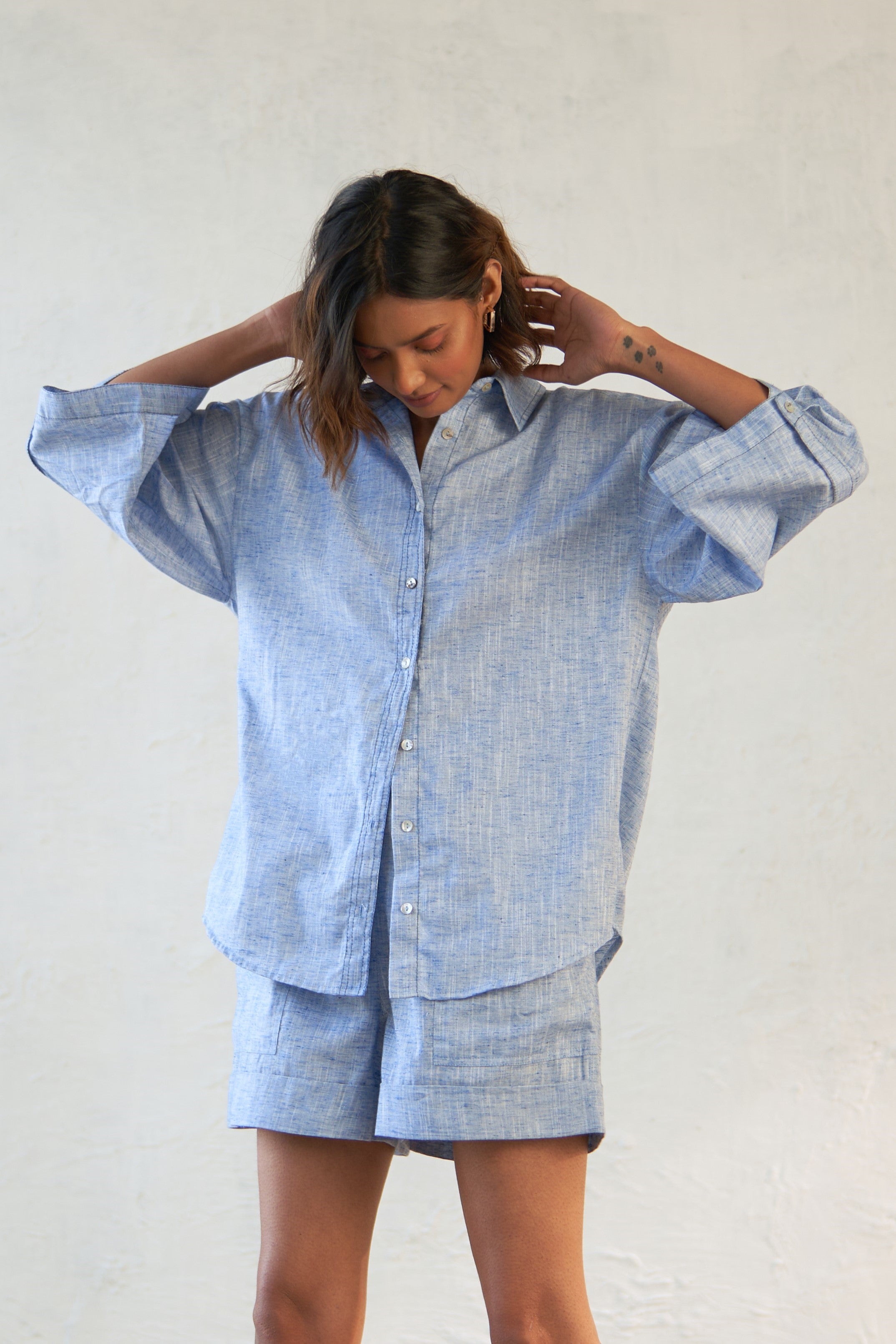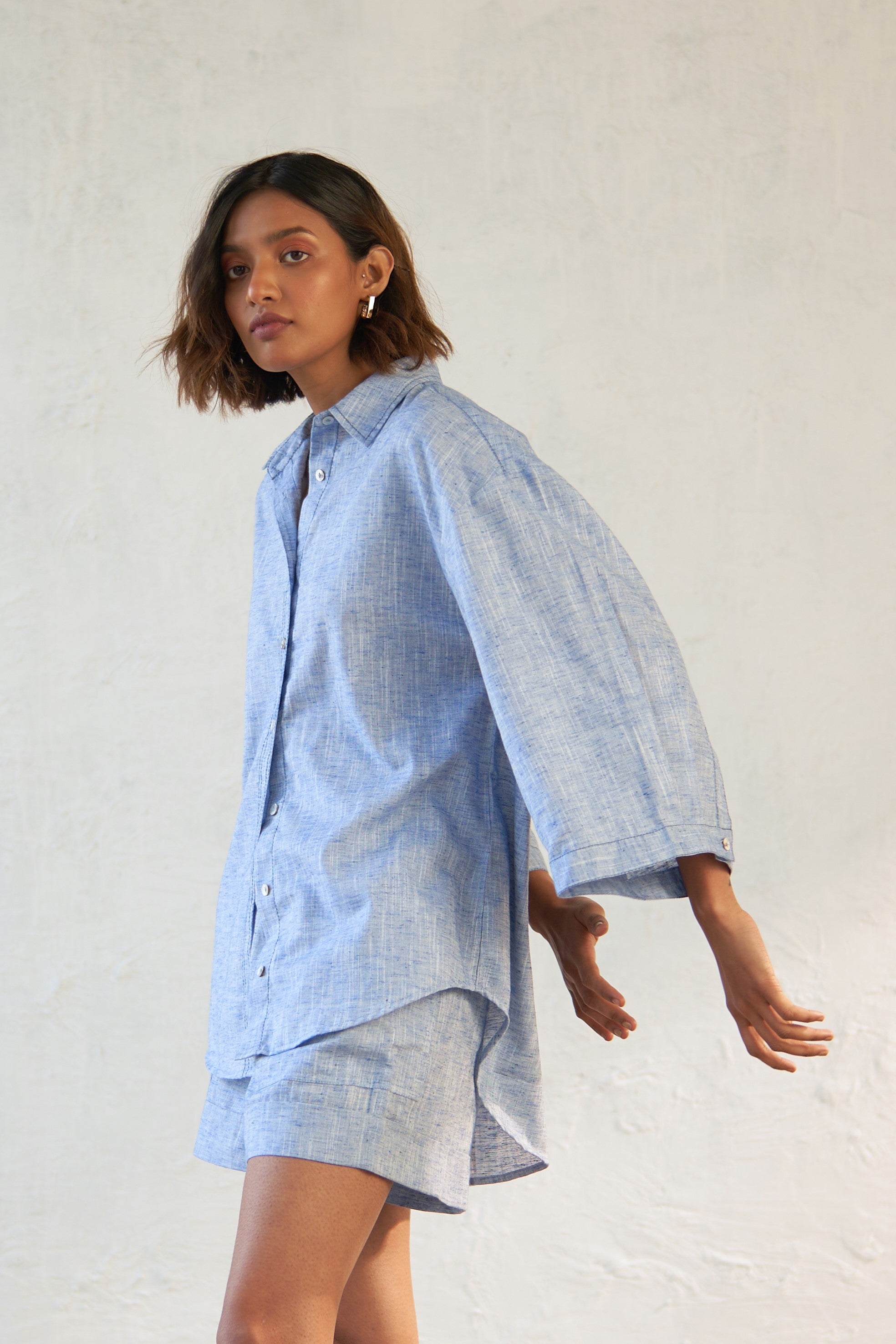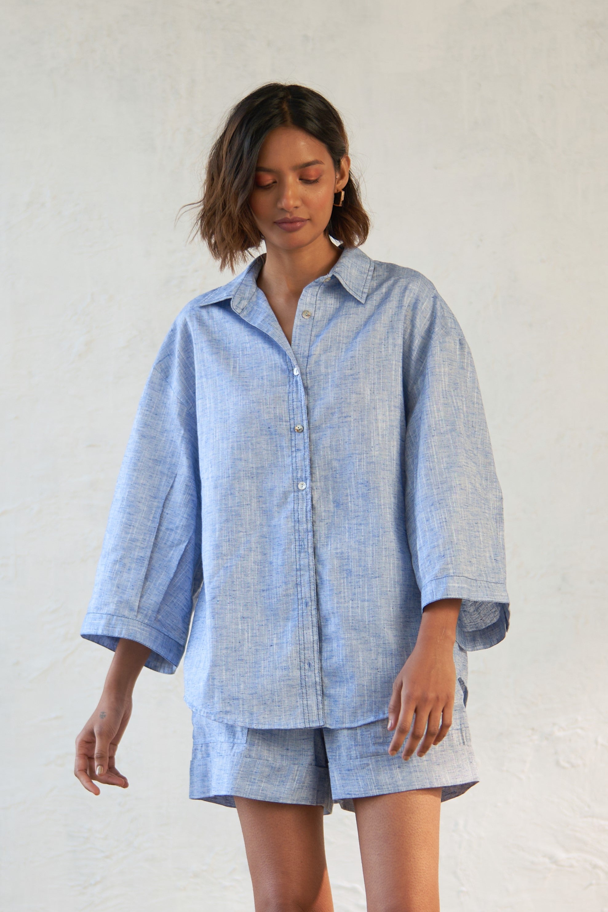 Crafted from textured cotton, this breezy blue shirt boasts an oversized fit, a flattering V-neck, and stylish shell buttons. With its curved hemline and chic pleated 3/4 sleeves, it adds a touch of femininity to the classic shirt design.