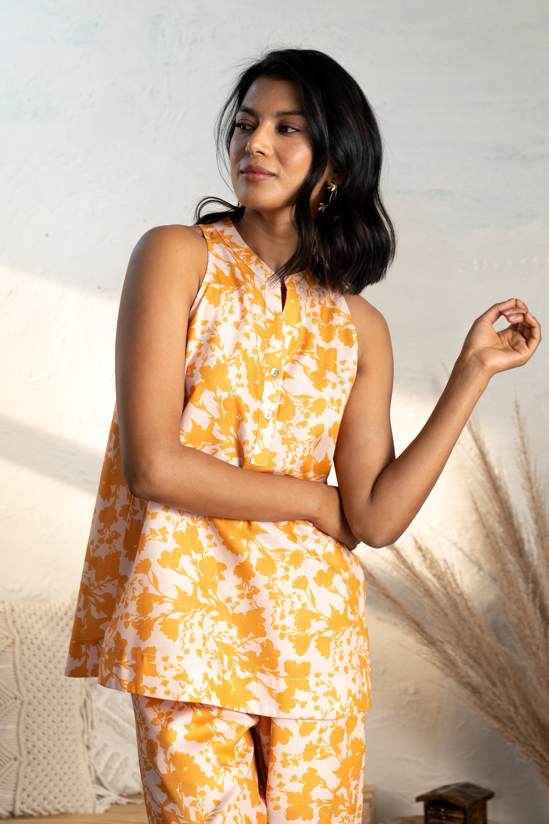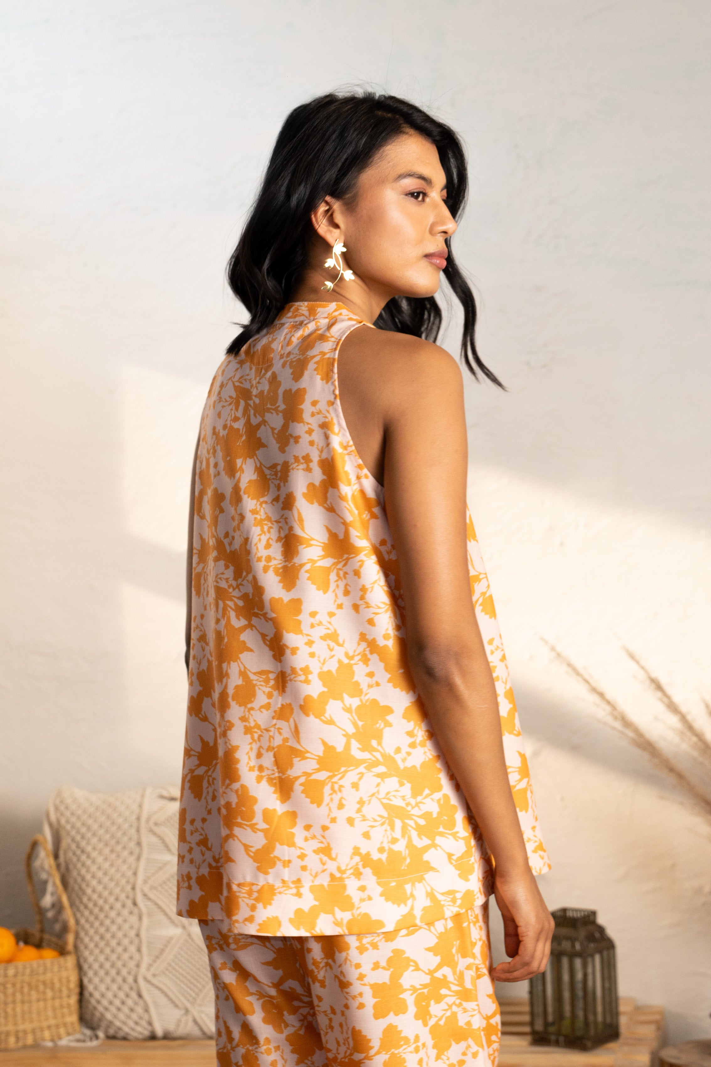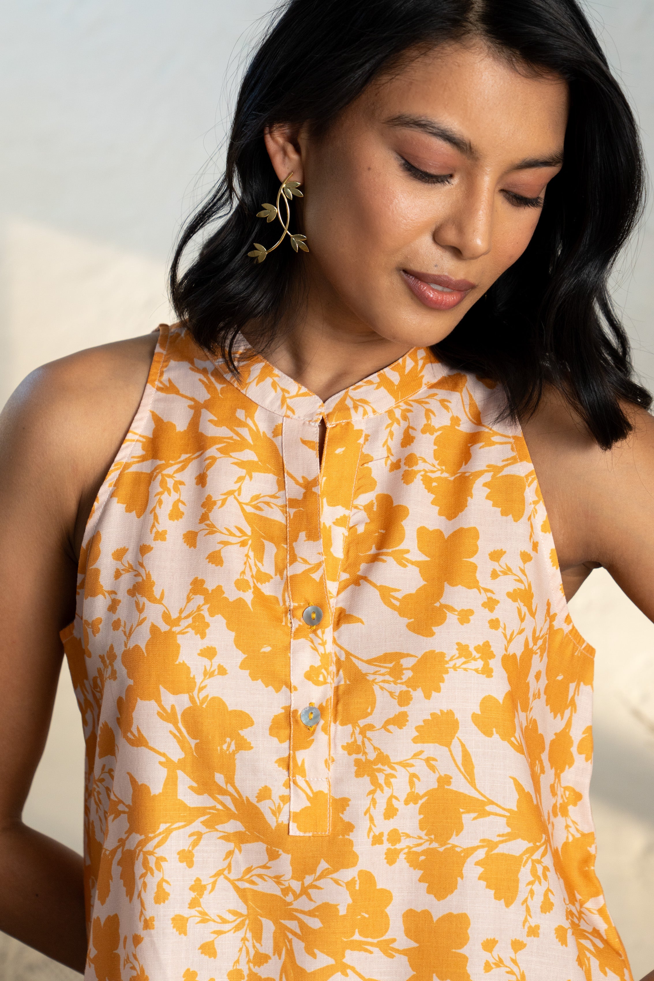 Radiate nature's vibrant charm with the Grassland Patio Top, crafted in a striking yellow hue inspired by the lush textures of the grasslands. This halter-sleeve design, featuring a refined band collar, effortlessly combines sophistication and elegance, making it a standout piece for both casual outings and special occasions.