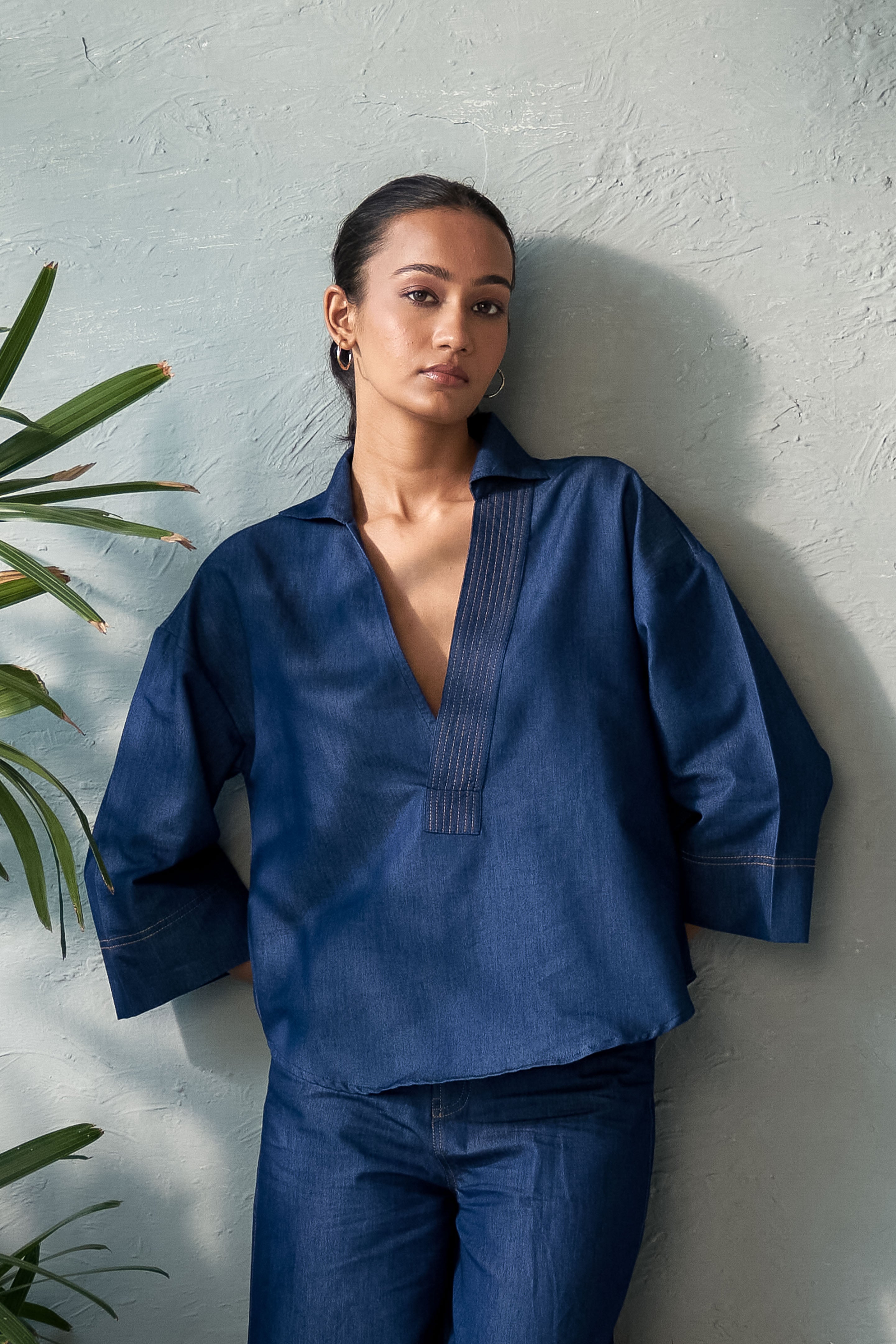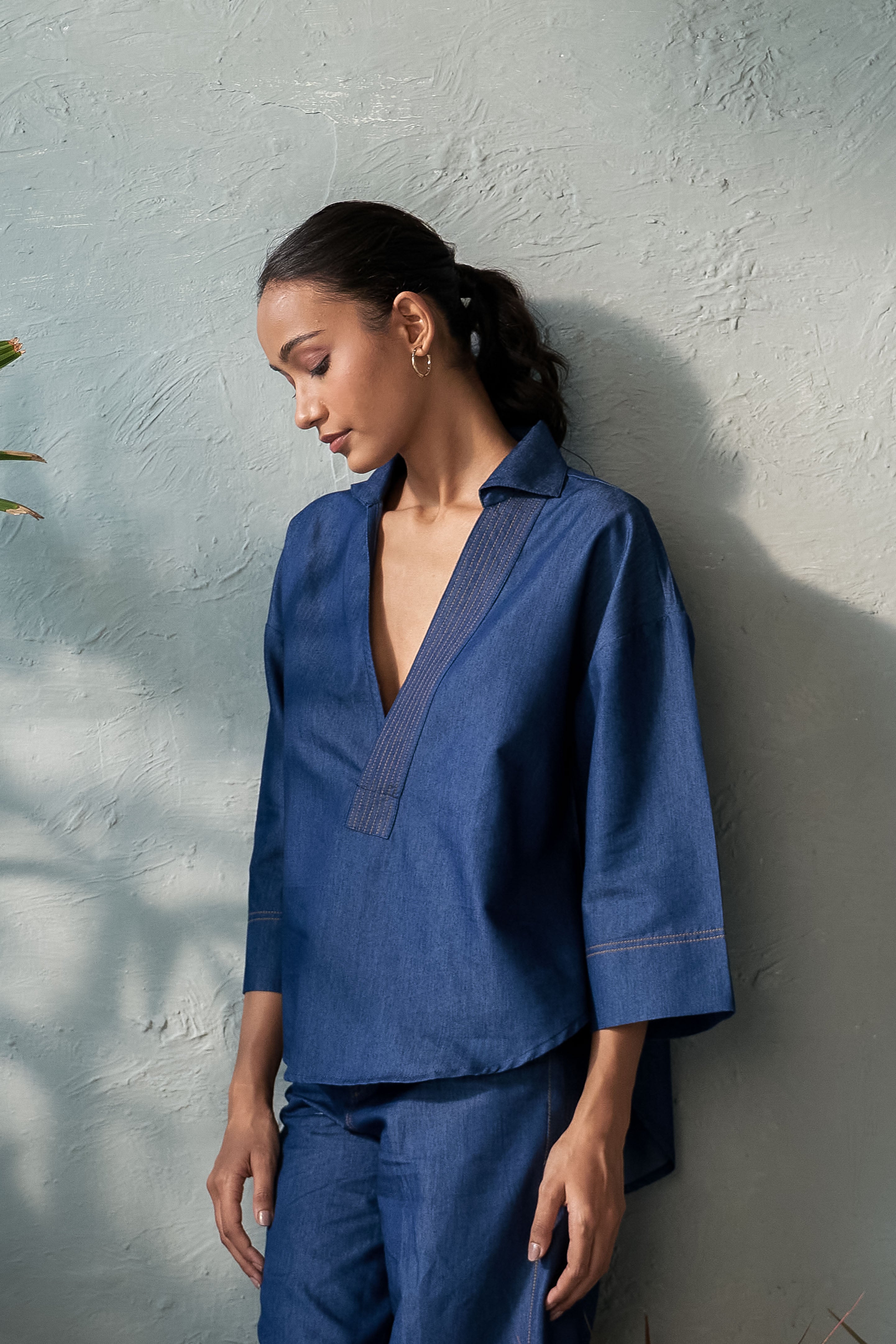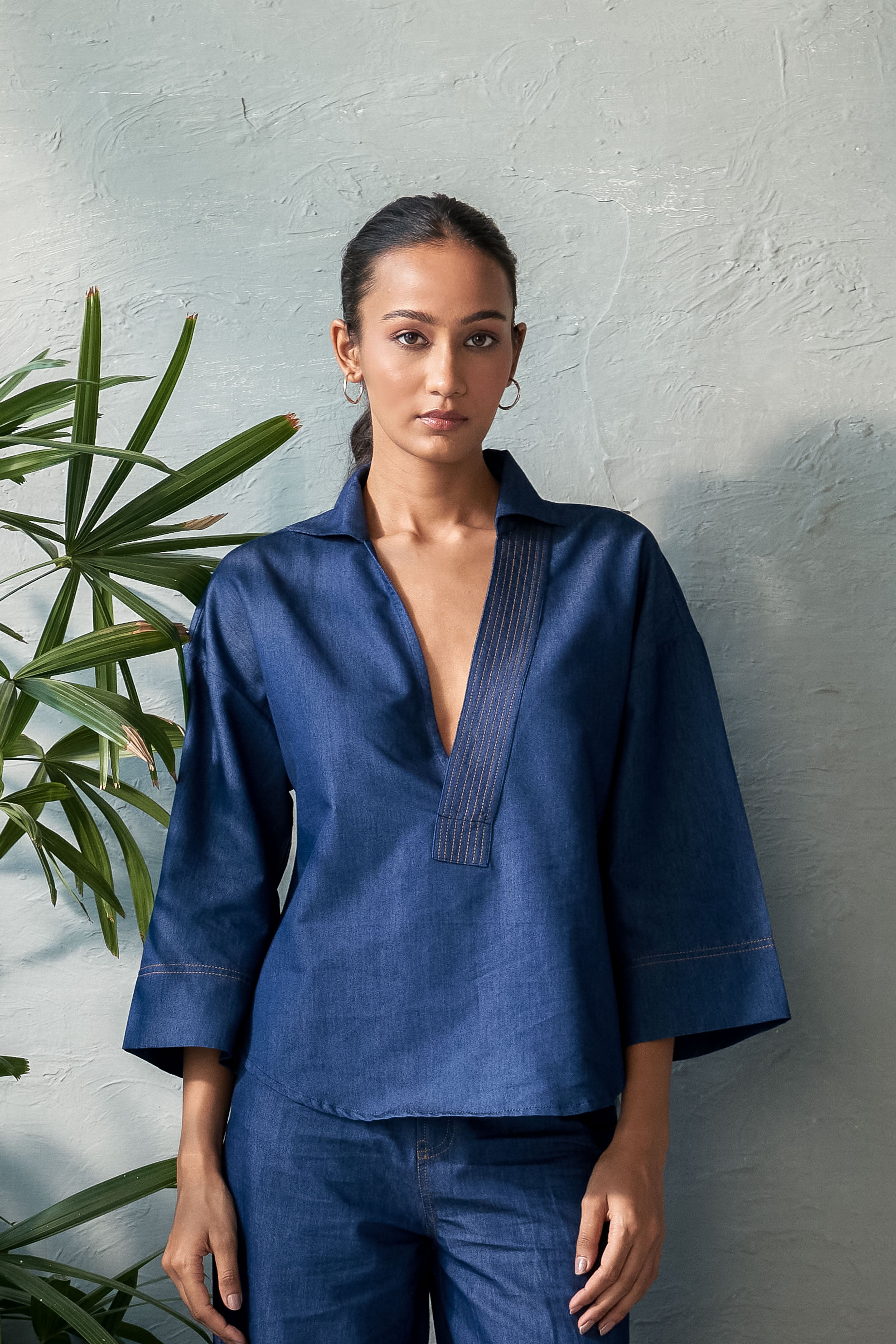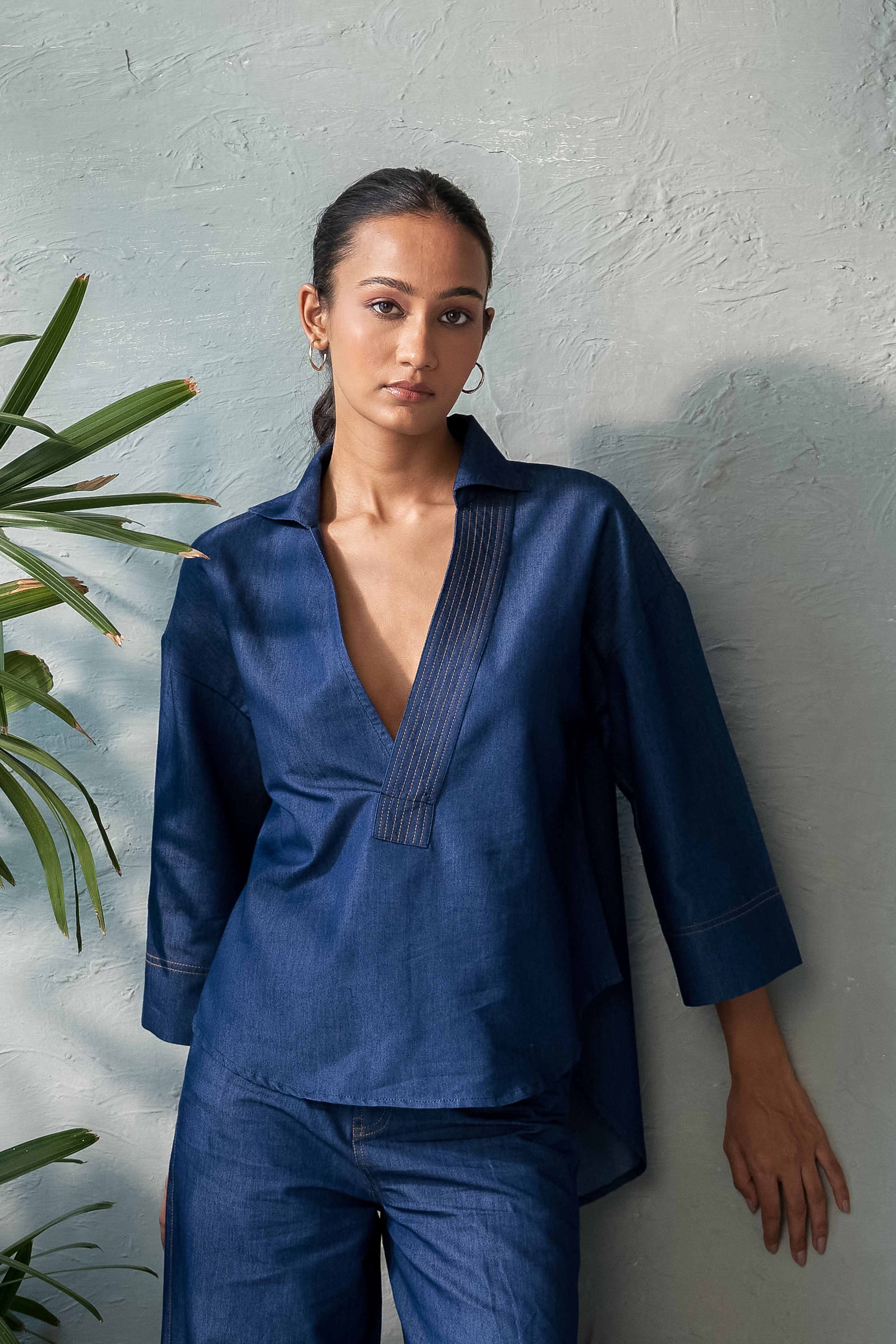 This Inkwell Denim Top features a single placket U-hem design with a deep neckline, ensuring both elegance and confidence. The stitch detail on the placket adds a touch of refinement, while the U-hem adds a contemporary twist. The deep neckline also allows for layering with a tube top, creating a cozy yet stylish look. Perfect for day-to-night transitions, pair it with tailored trousers, a sleek skirt, or high-waisted jeans for a sophisticated outfit.