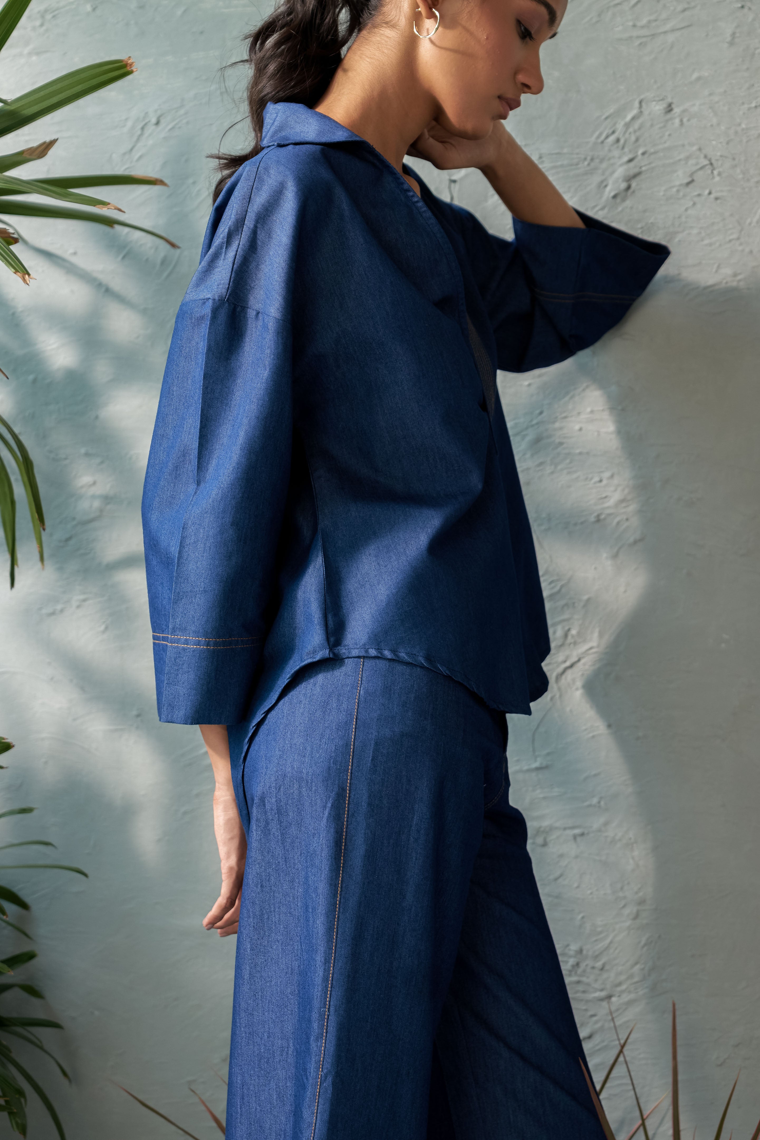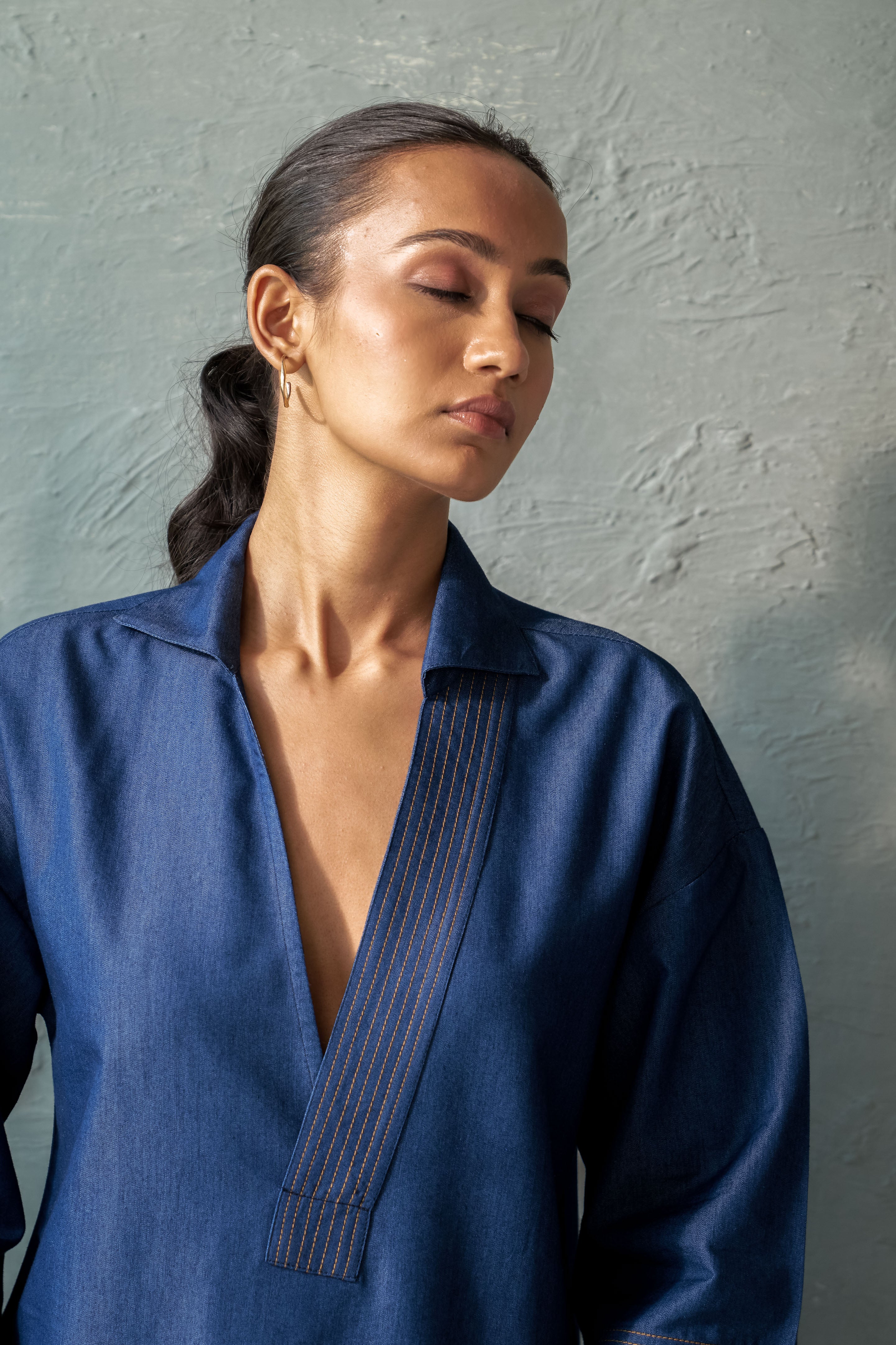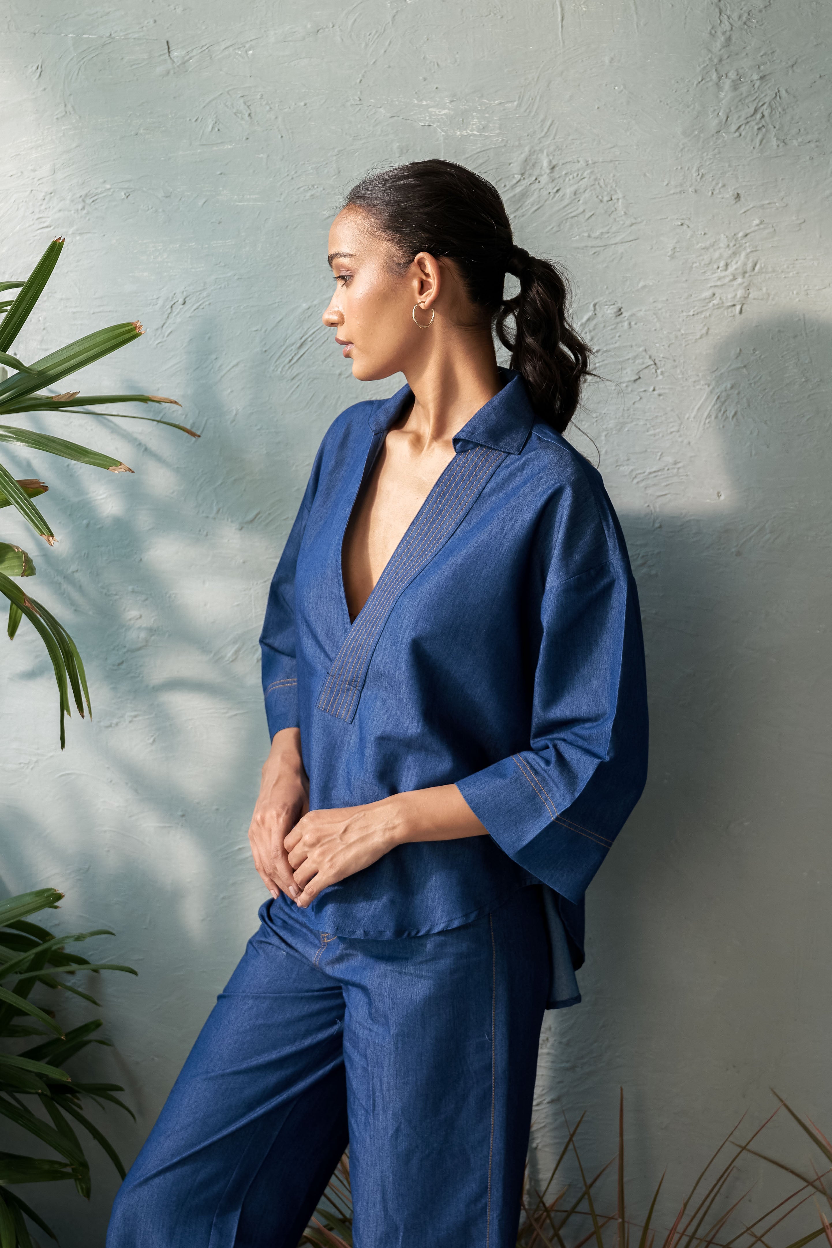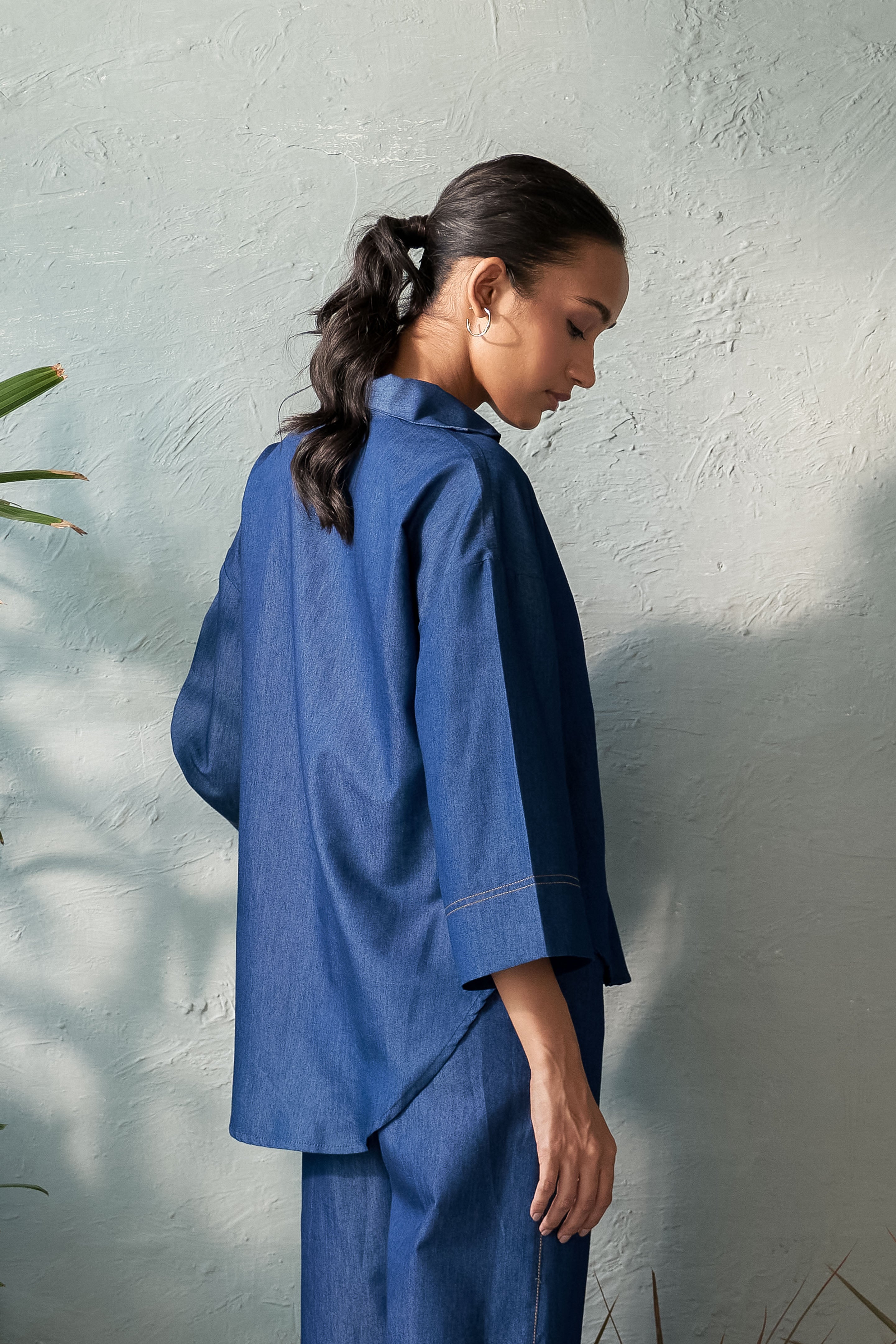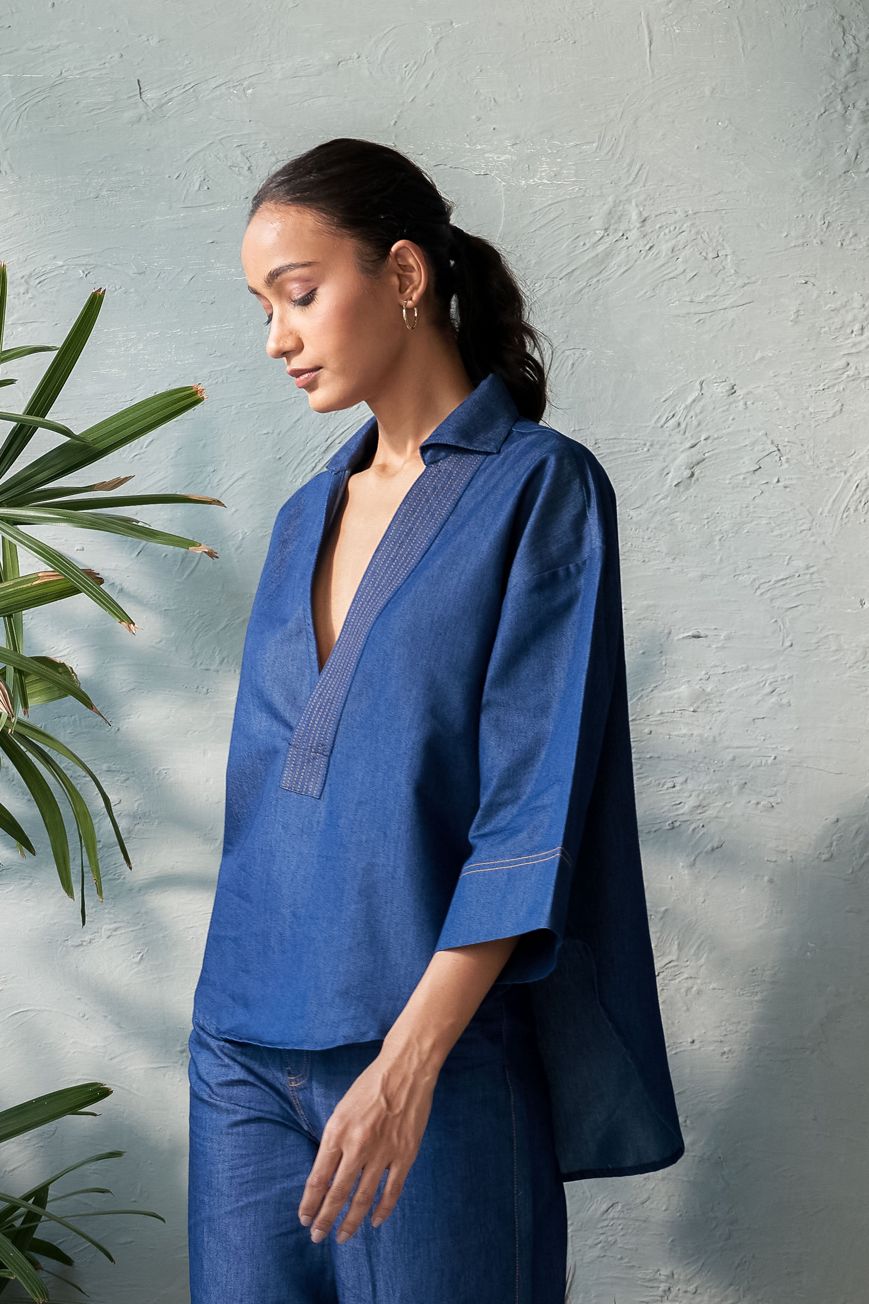 This Inkwell Denim Top features a single placket U-hem design with a deep neckline, ensuring both elegance and confidence. The stitch detail on the placket adds a touch of refinement, while the U-hem adds a contemporary twist. The deep neckline also allows for layering with a tube top, creating a cozy yet stylish look. Perfect for day-to-night transitions, pair it with tailored trousers, a sleek skirt, or high-waisted jeans for a sophisticated outfit.