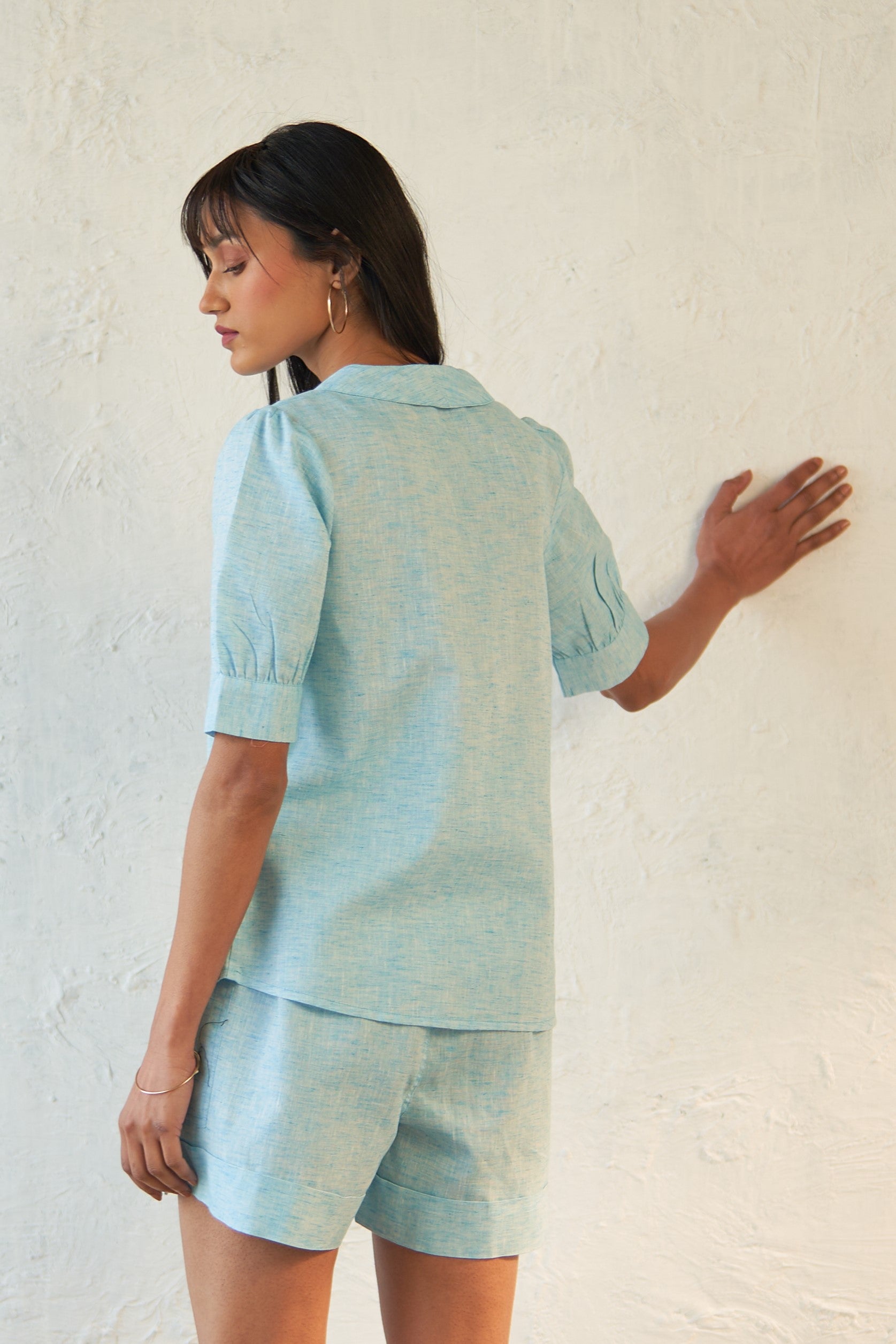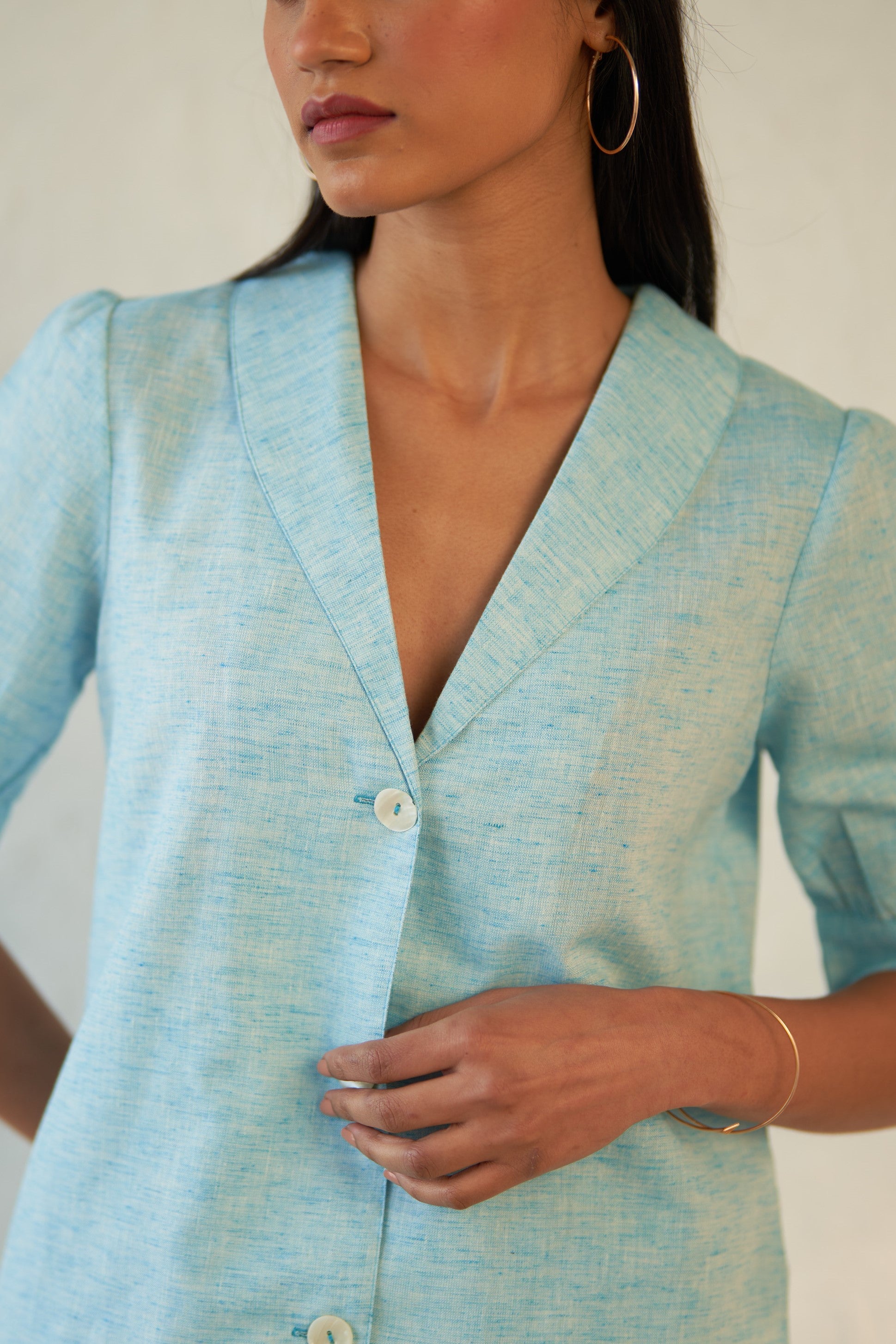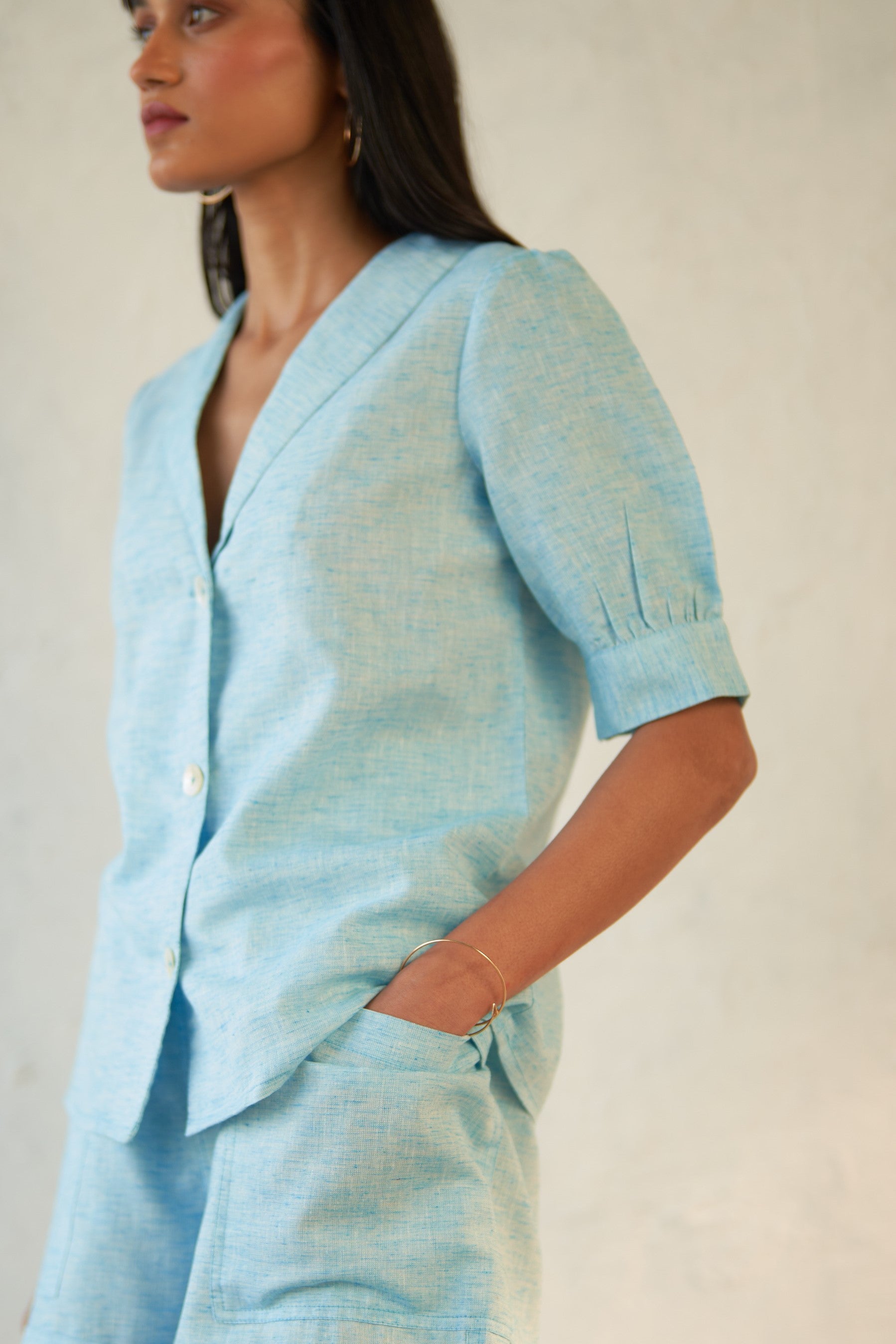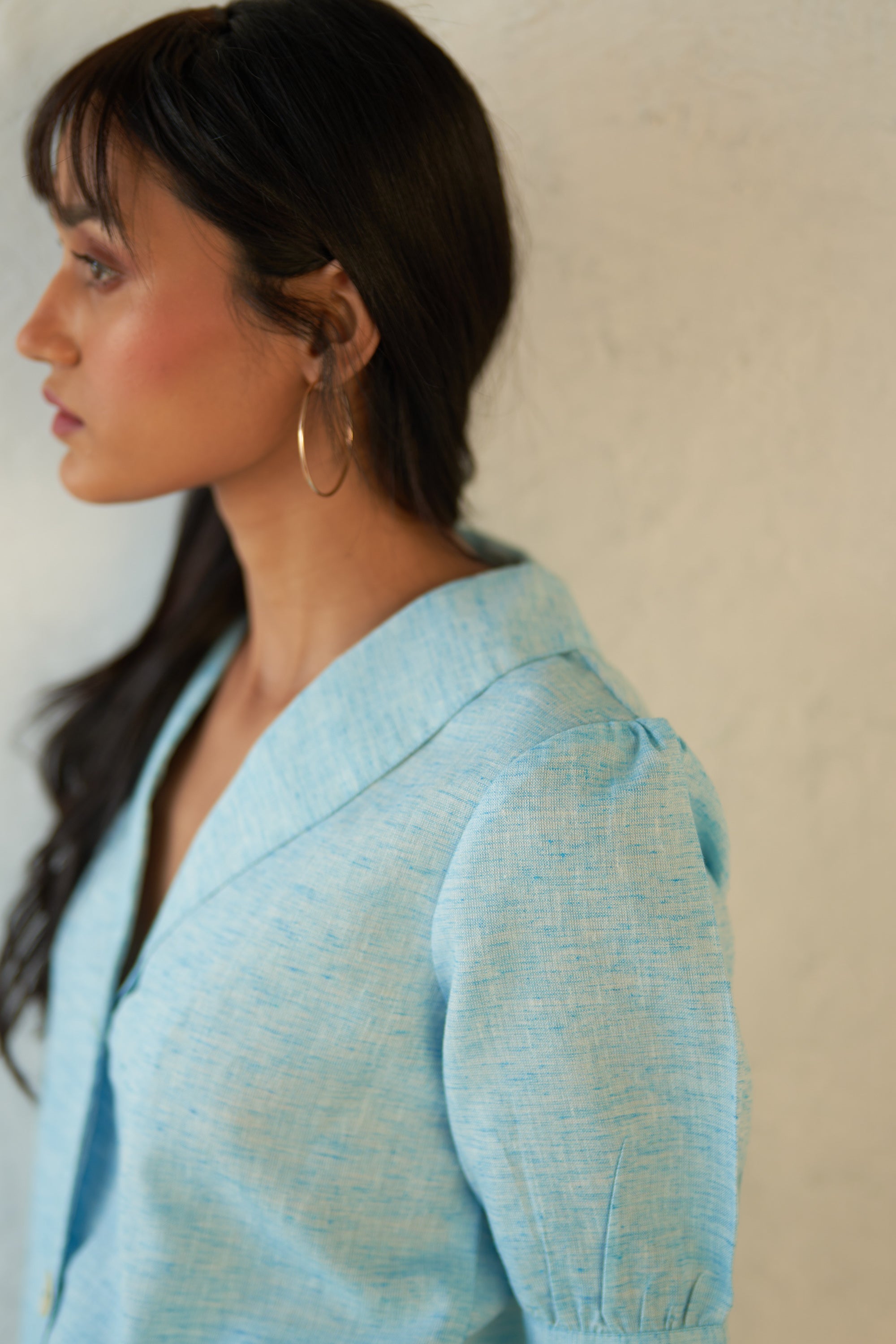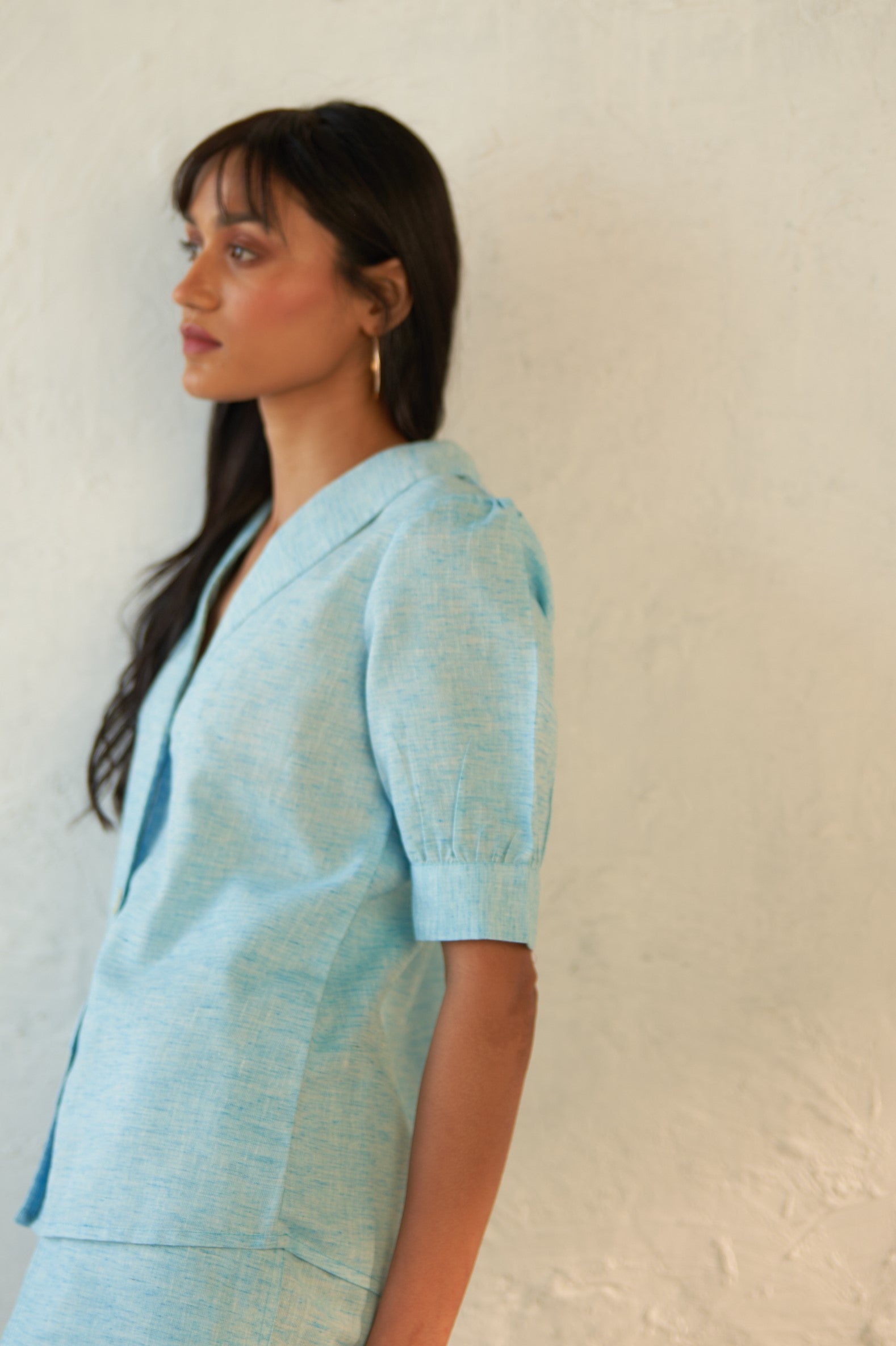 Canoopi's oyster-toned top is an essential piece with its timeless charm. Tailored from premium cotton slub fabric, this puffed sleeve shirt features a captivating curved collar and a row of delicate shell buttons.