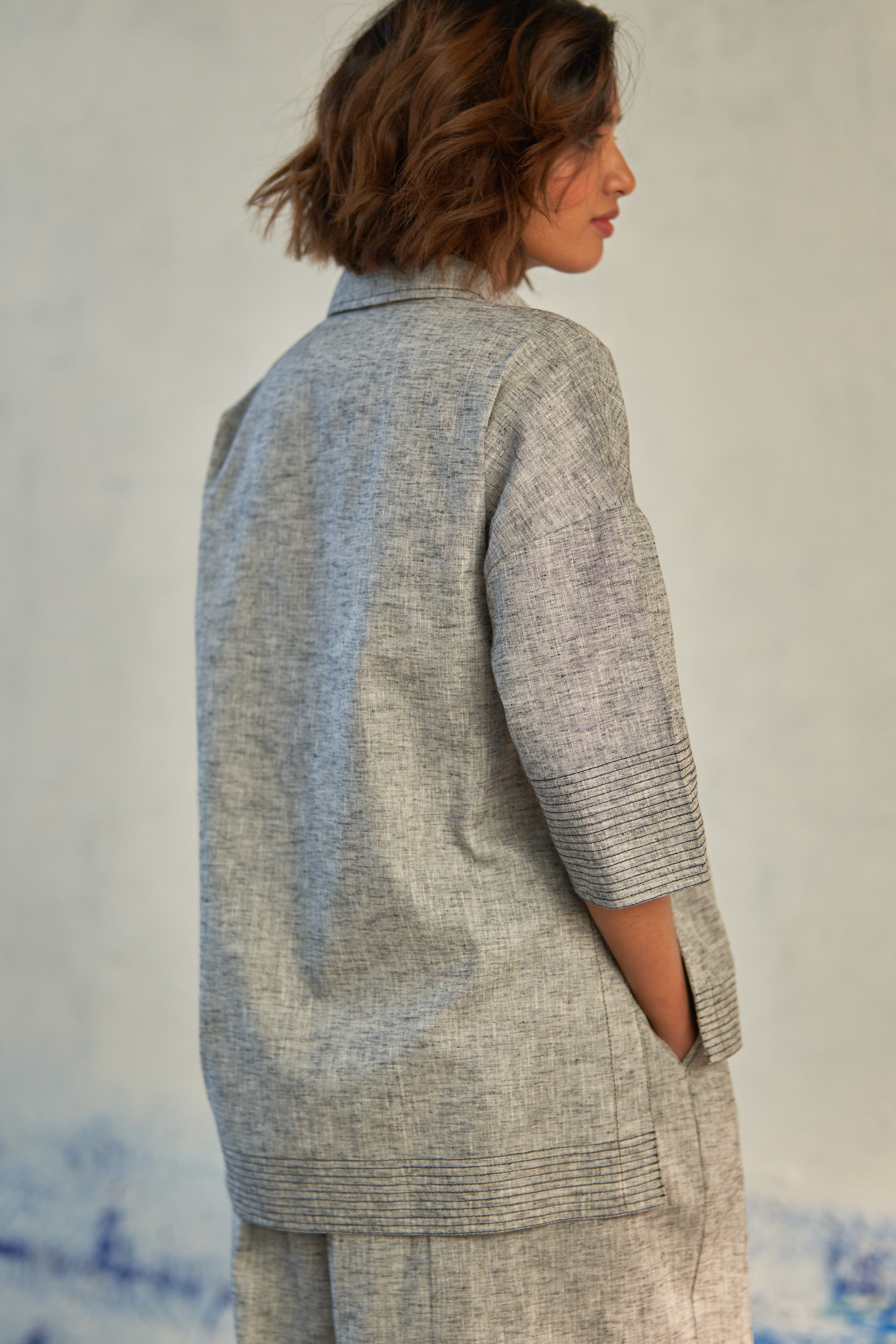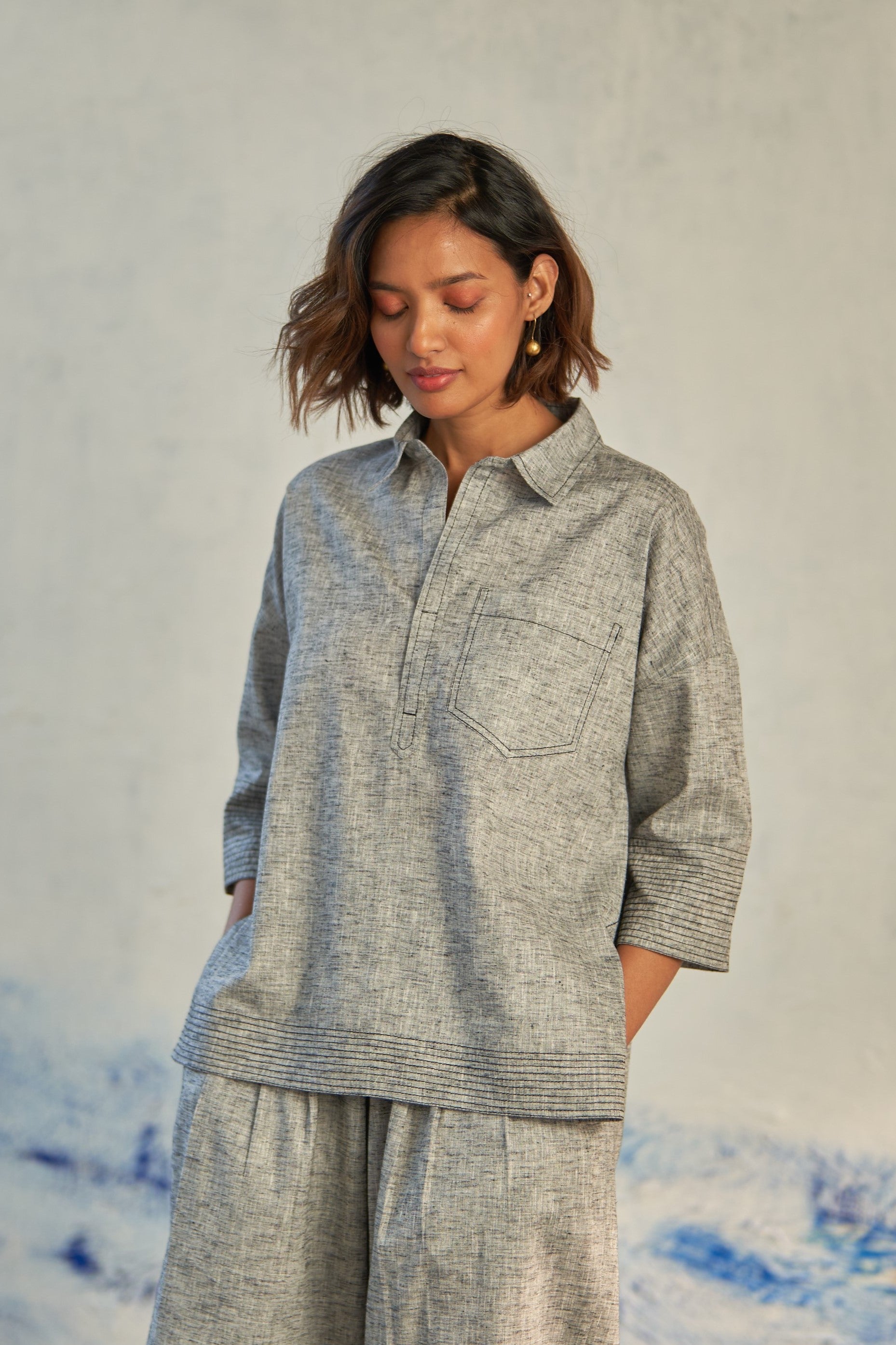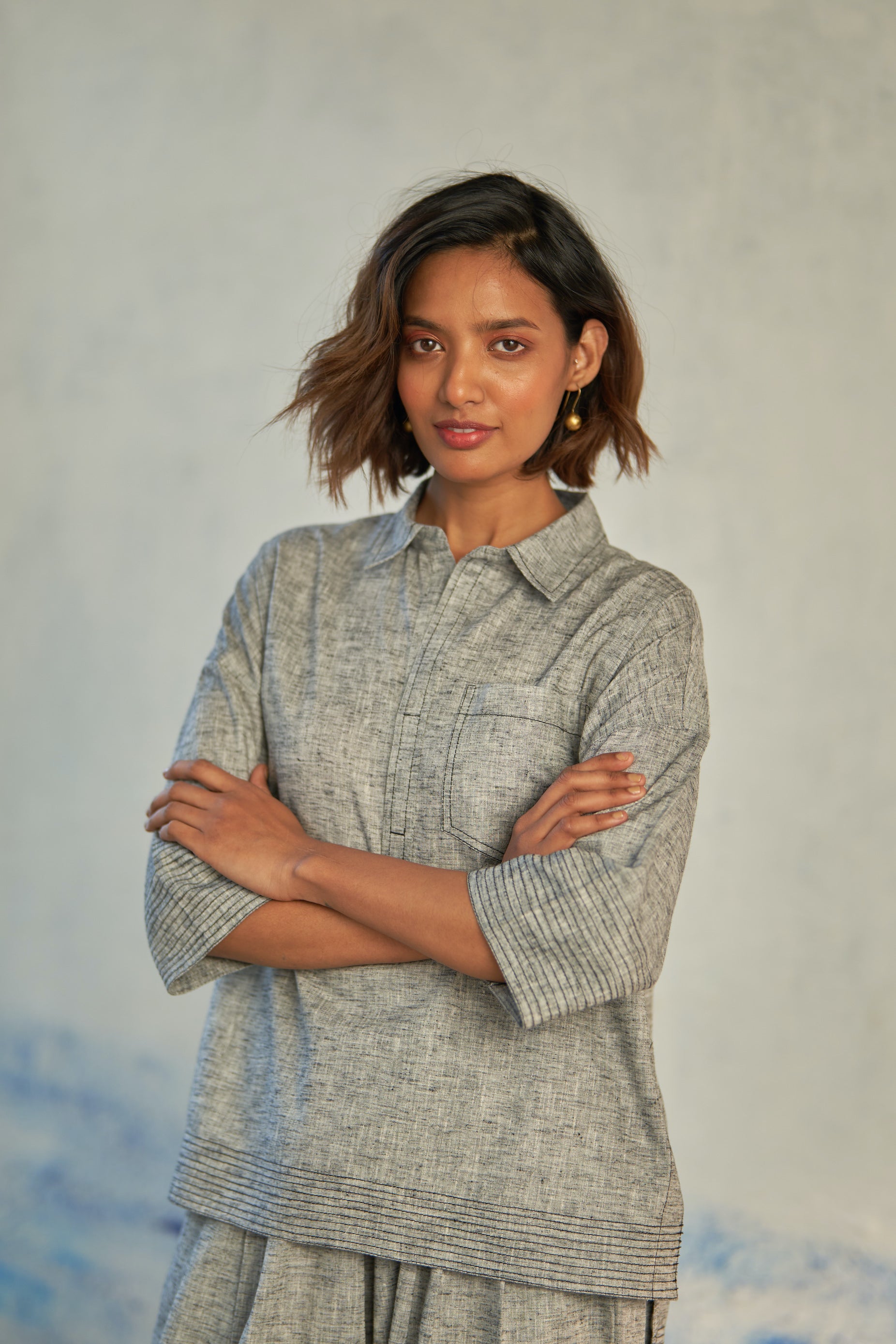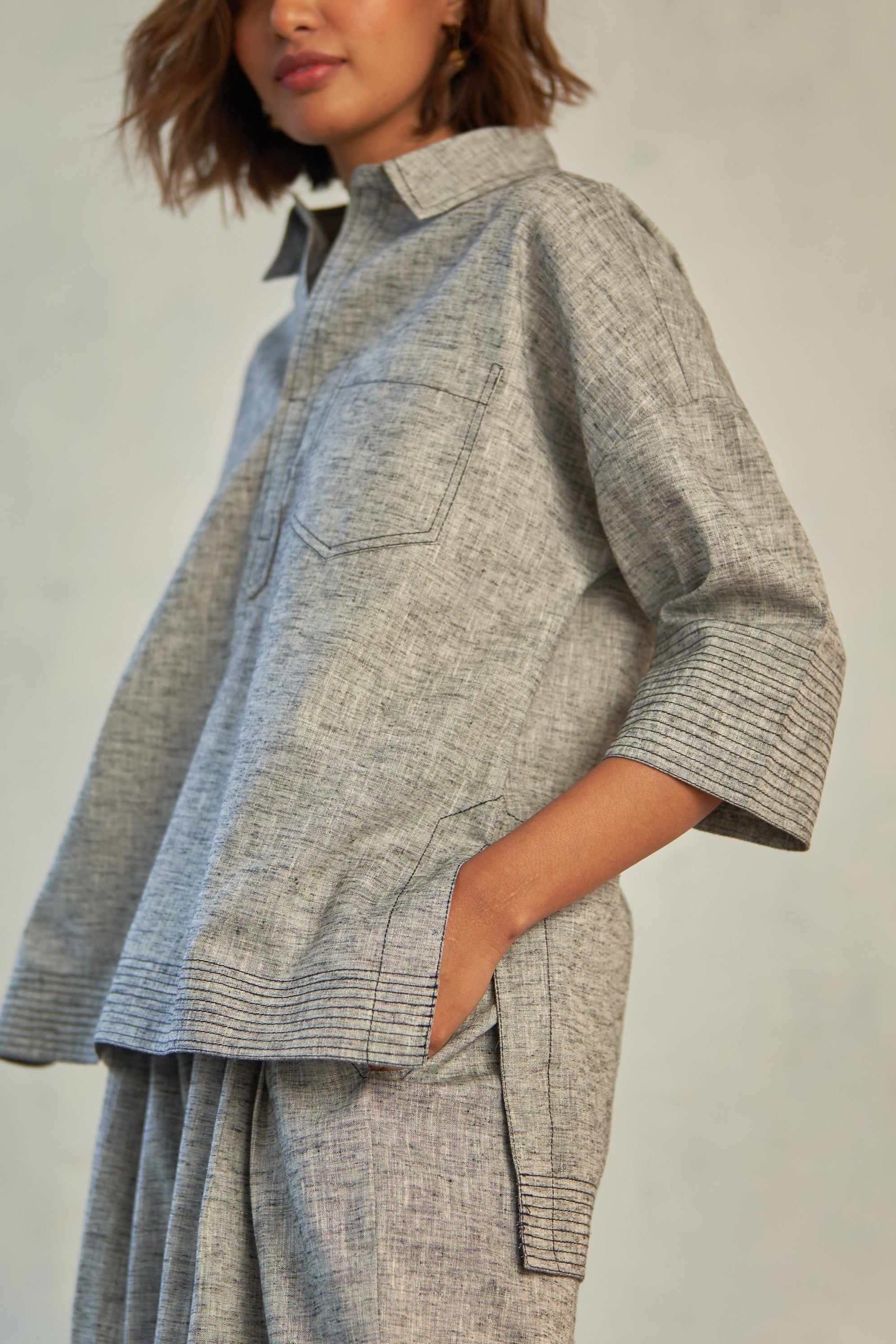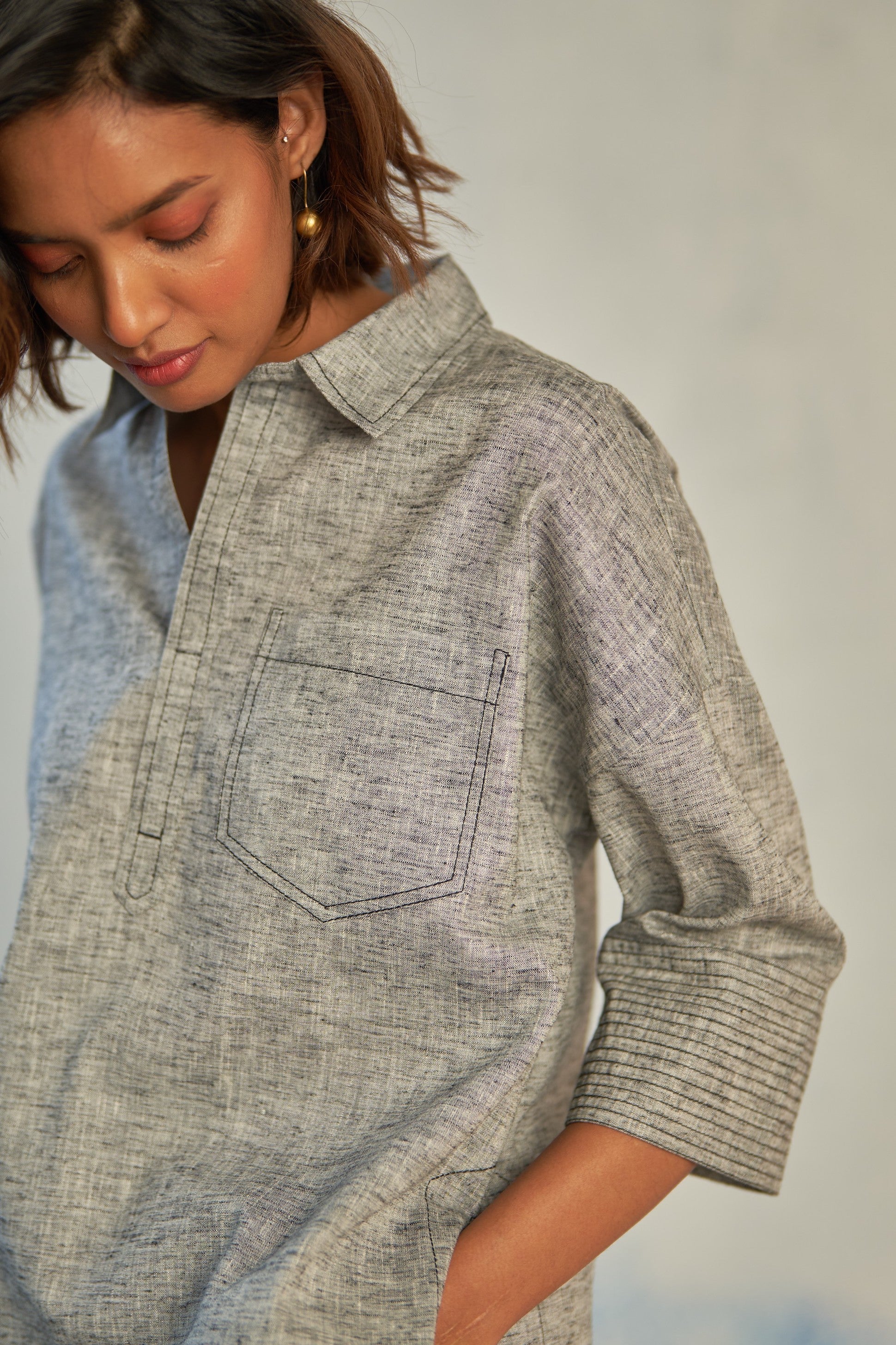 Crafted from premium textured cotton fabric, this leisurewear-inspired piece boasts an effortlessly relaxed shape with elbow-length sleeves. Its design features a collared neckline with a deep V-neck and a convenient patch pocket at the chest. Enhanced by intricate topstitching detail, it elevates the overall look.