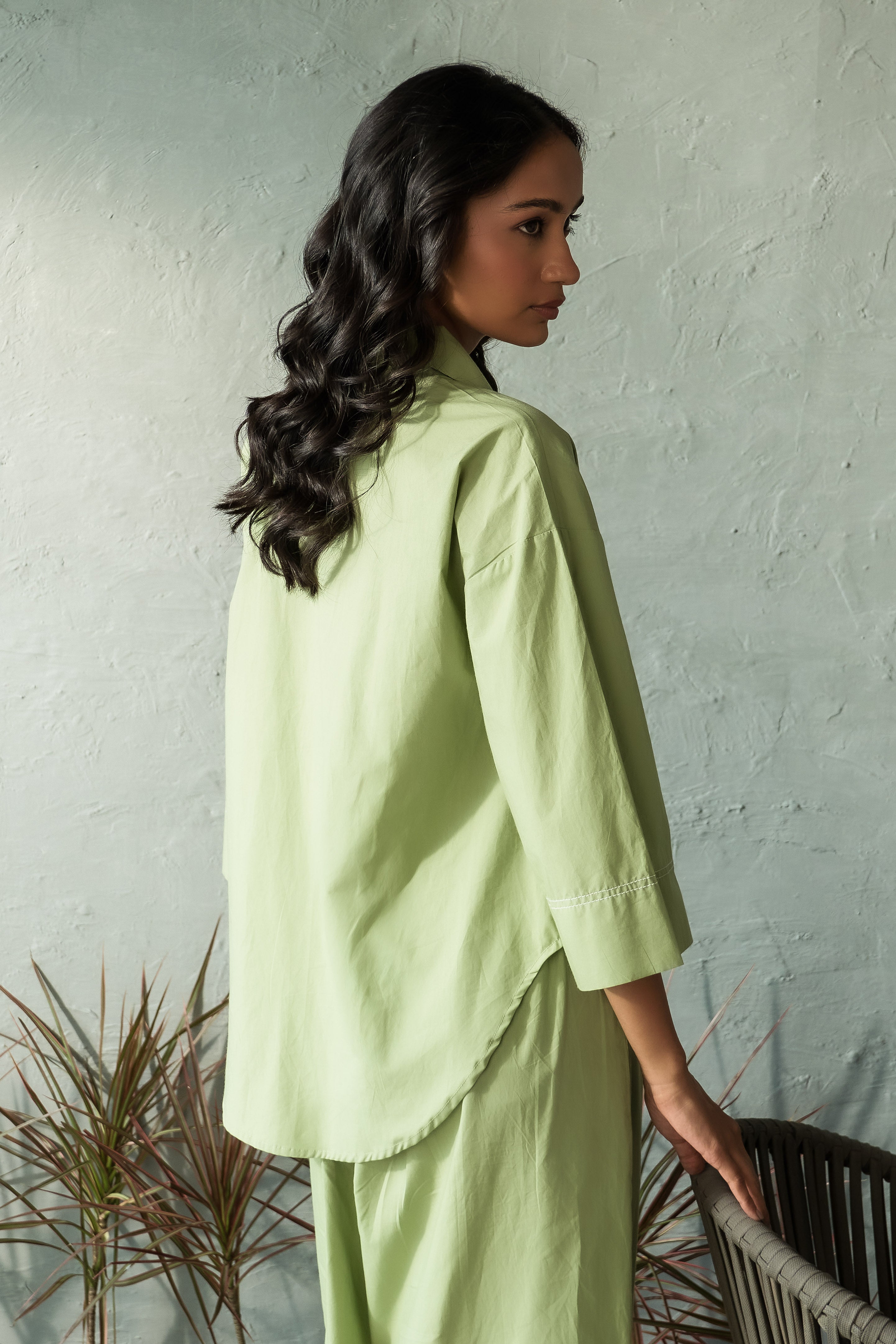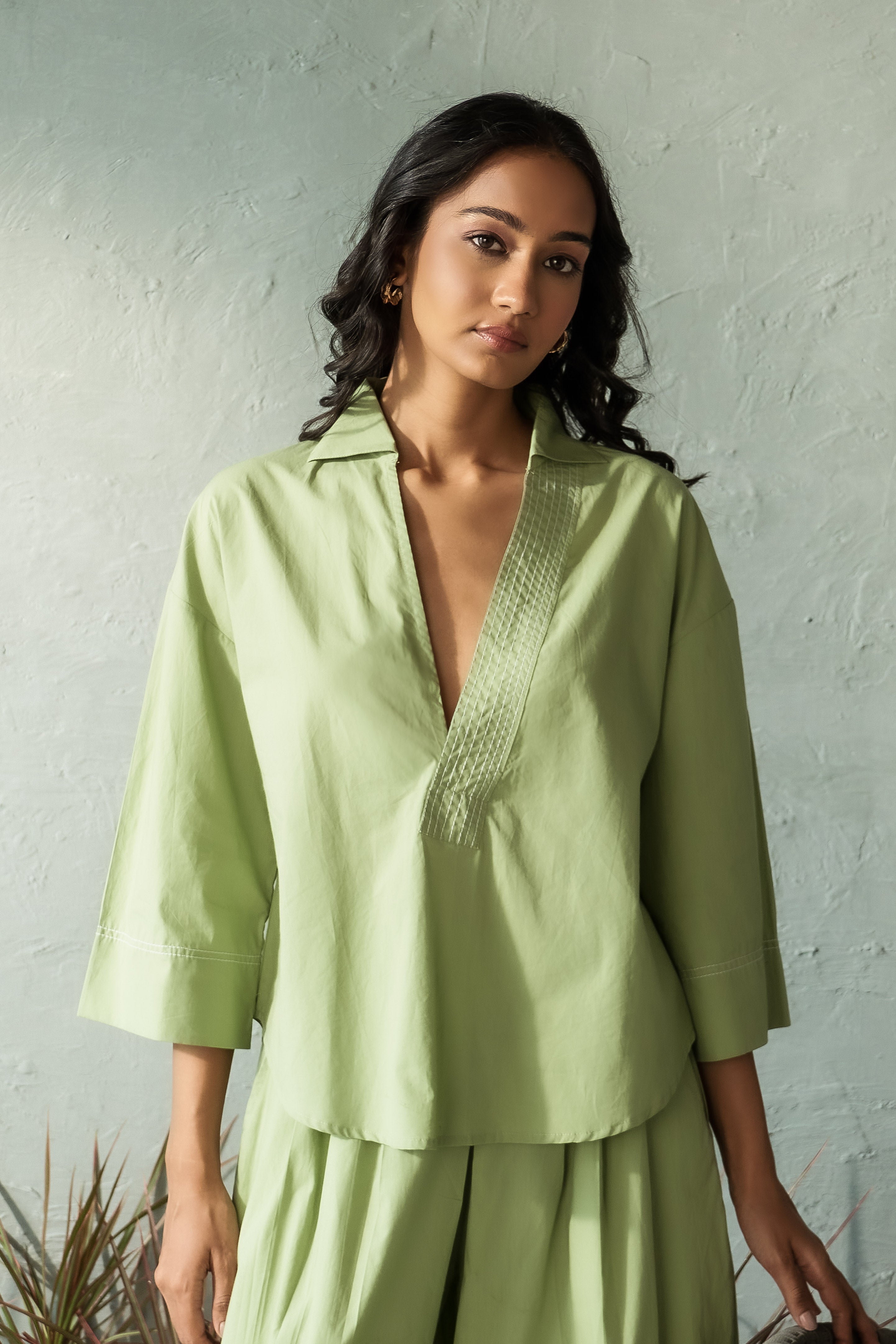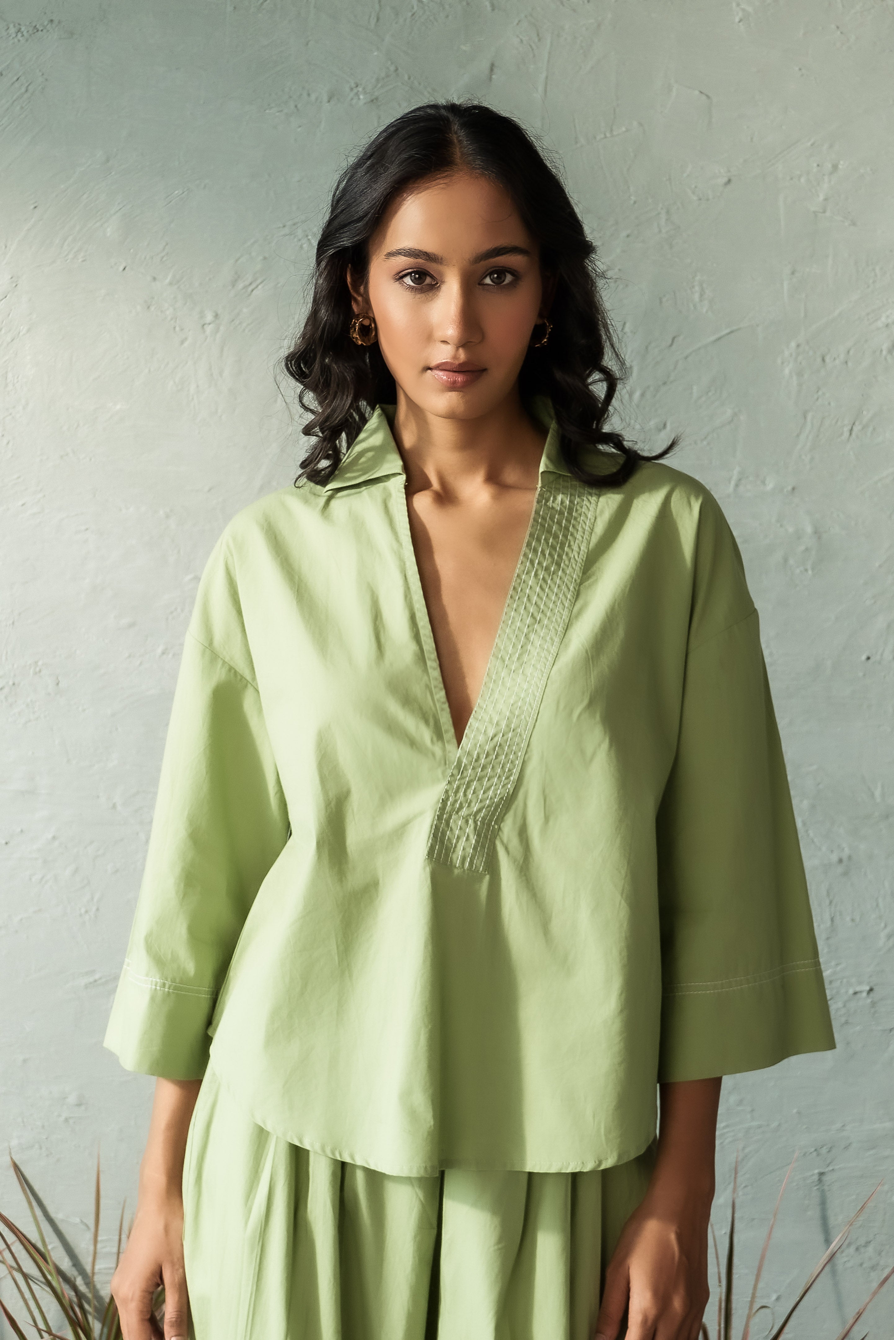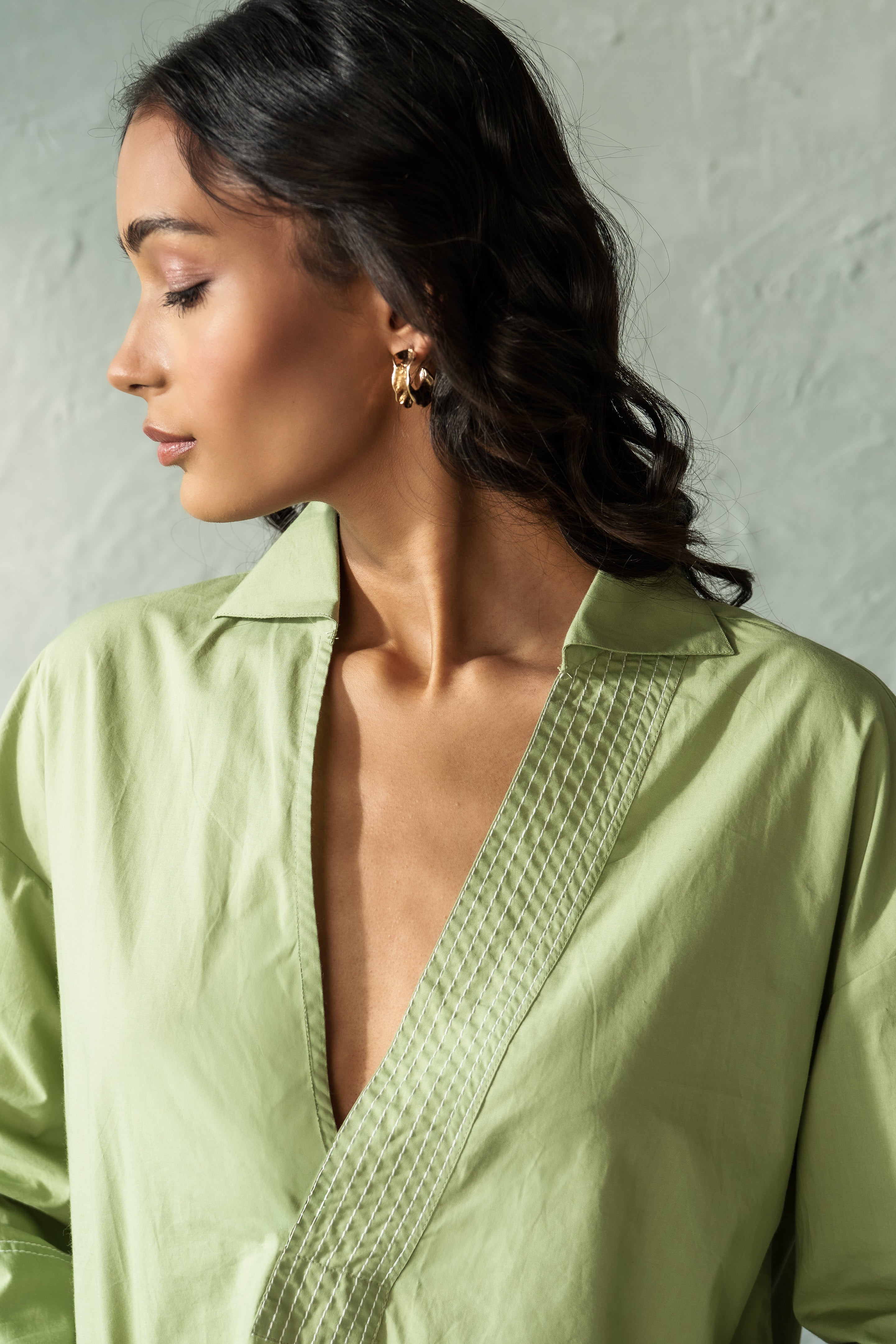 Add a touch of elegance to your wardrobe with our mint green collared top. Crafted from premium cotton fabric, this top features a relaxed fit, U hemline with wide, flowing sleeves for a sophisticated, airy look. The placket with quilted detailing and versatile silhouette make it perfect for both casual outings and semi-formal occasions. Pair it with your favorite jeans, skirts, or trousers to create effortlessly chic outfits that stand out in any setting or pair it with matching flared trousers for a trendy look. A modern twist on a timeless classic, this kimono-style top is a wardrobe essential for fashion-forward women.